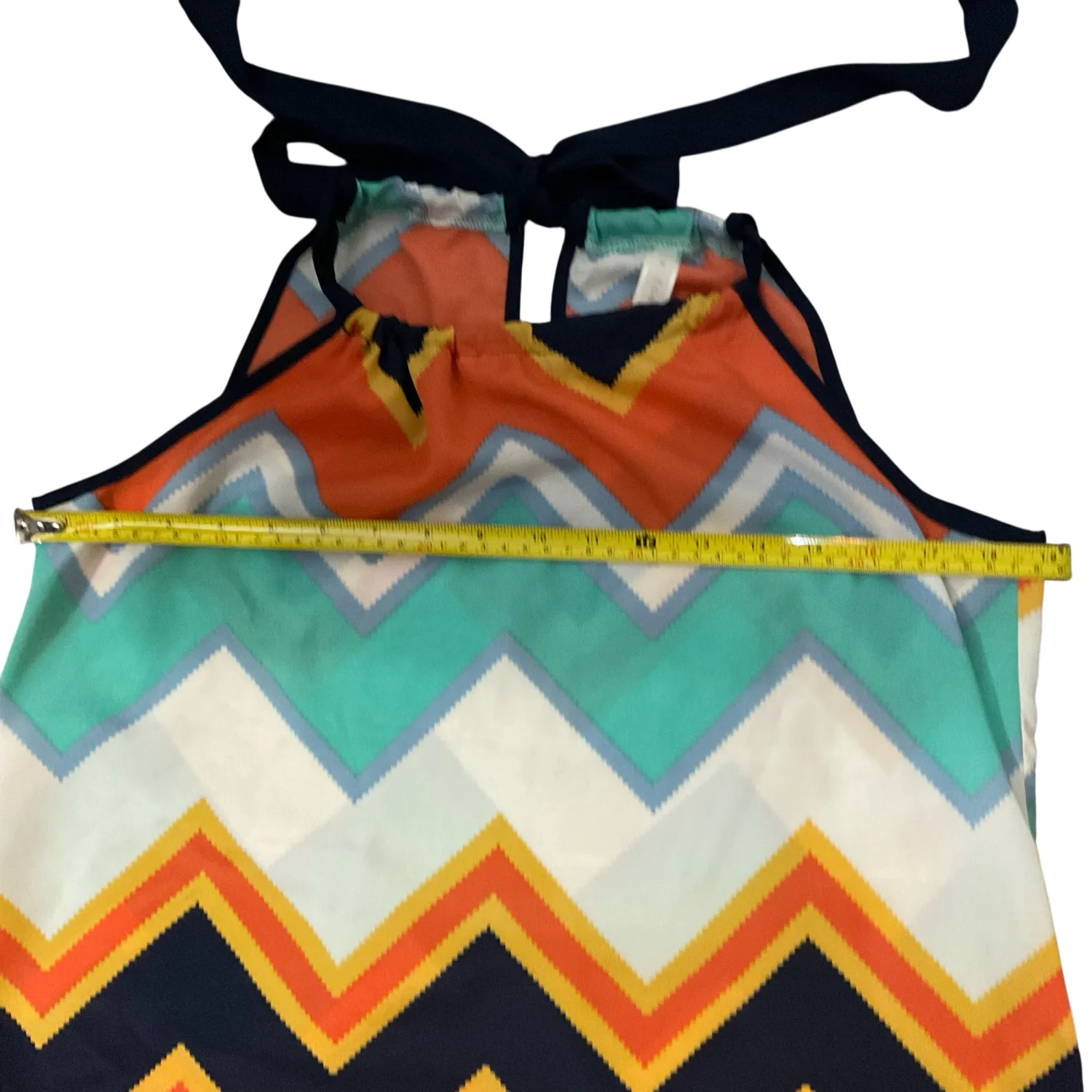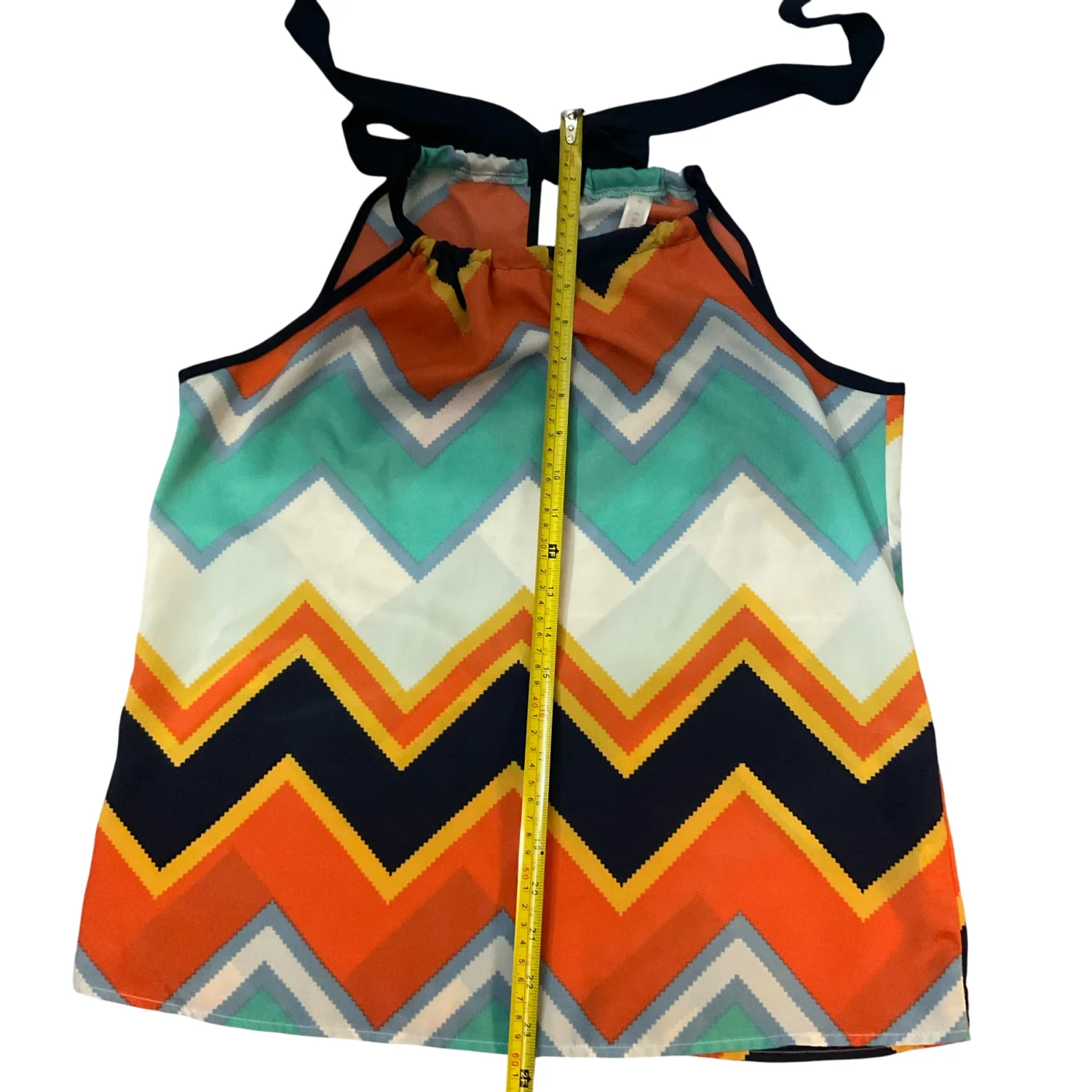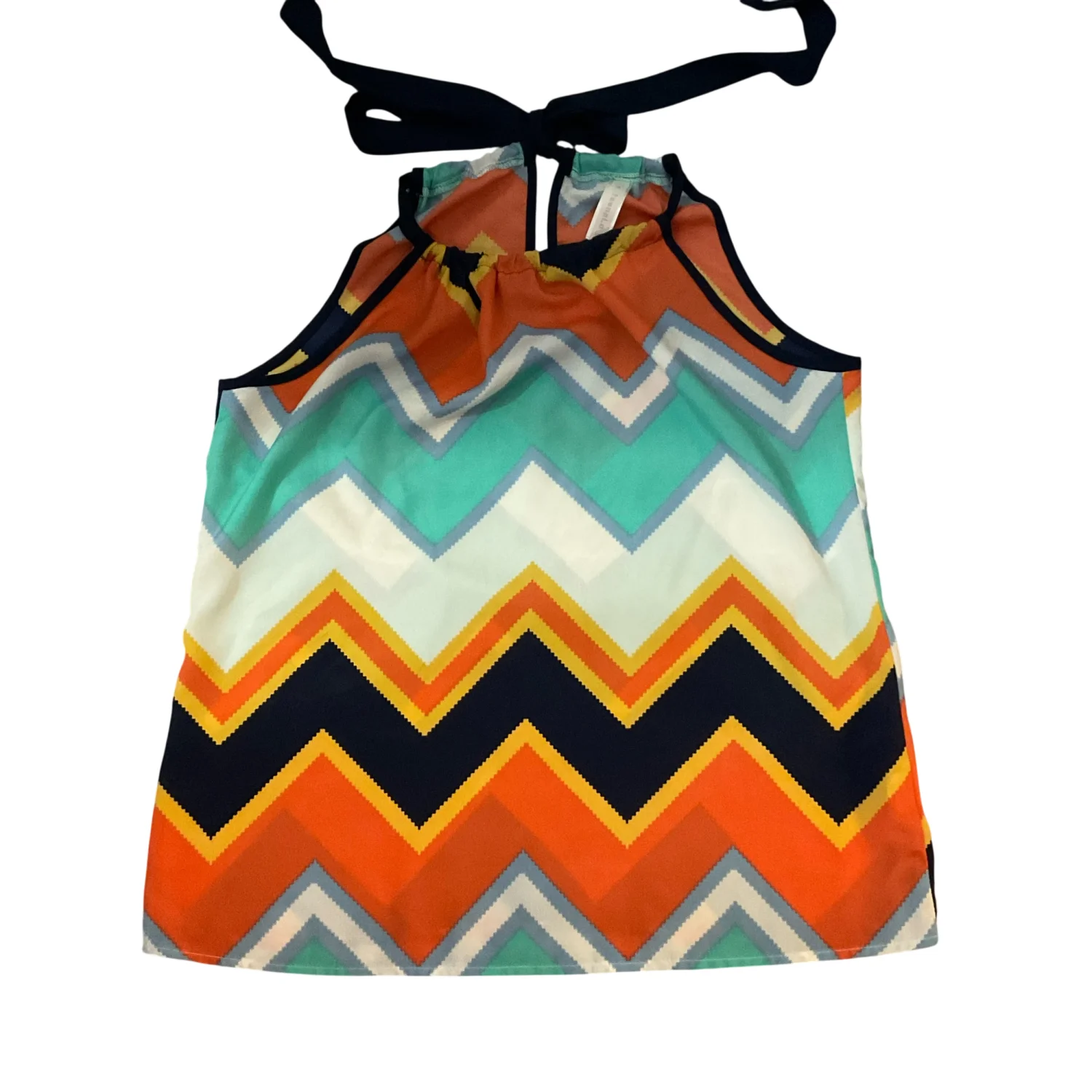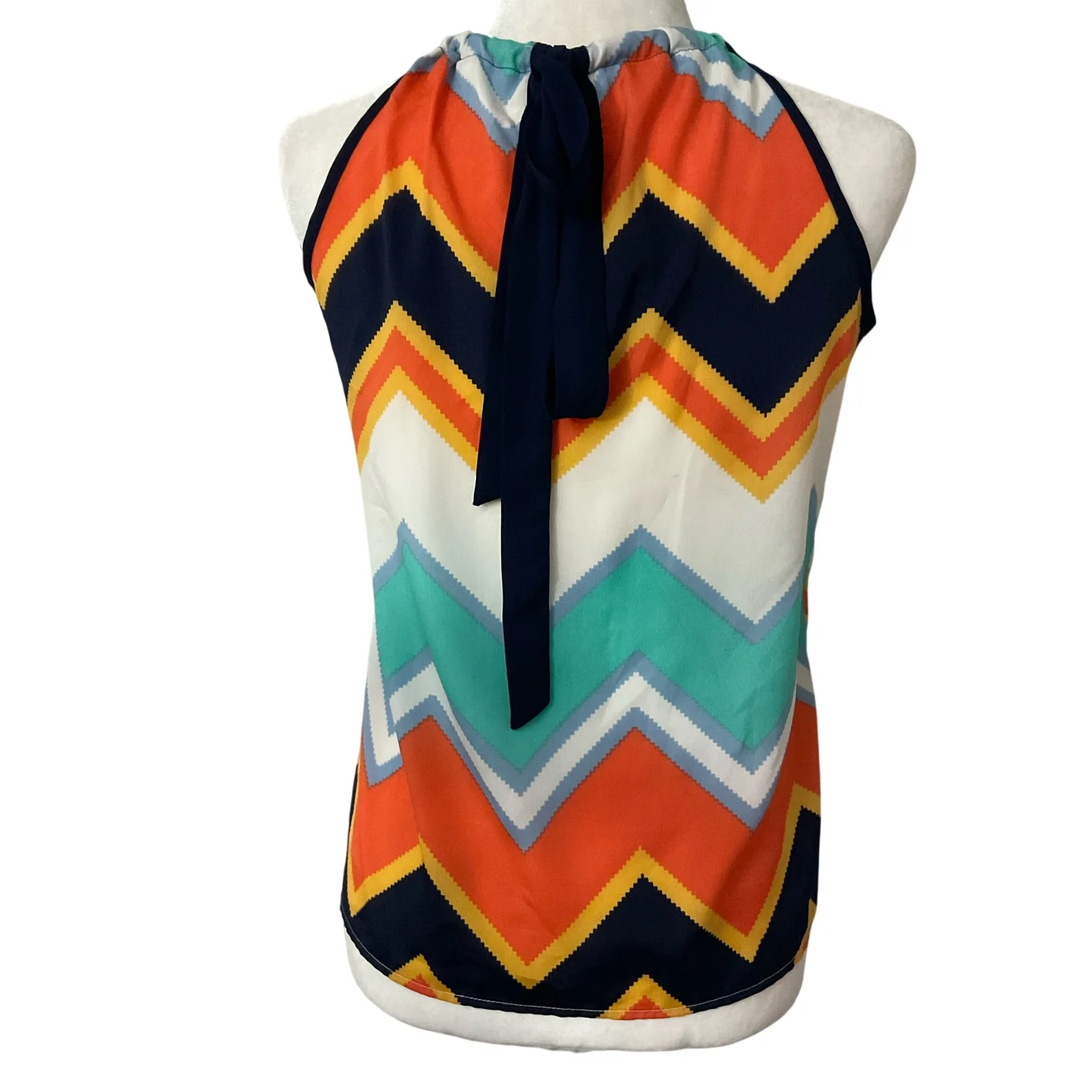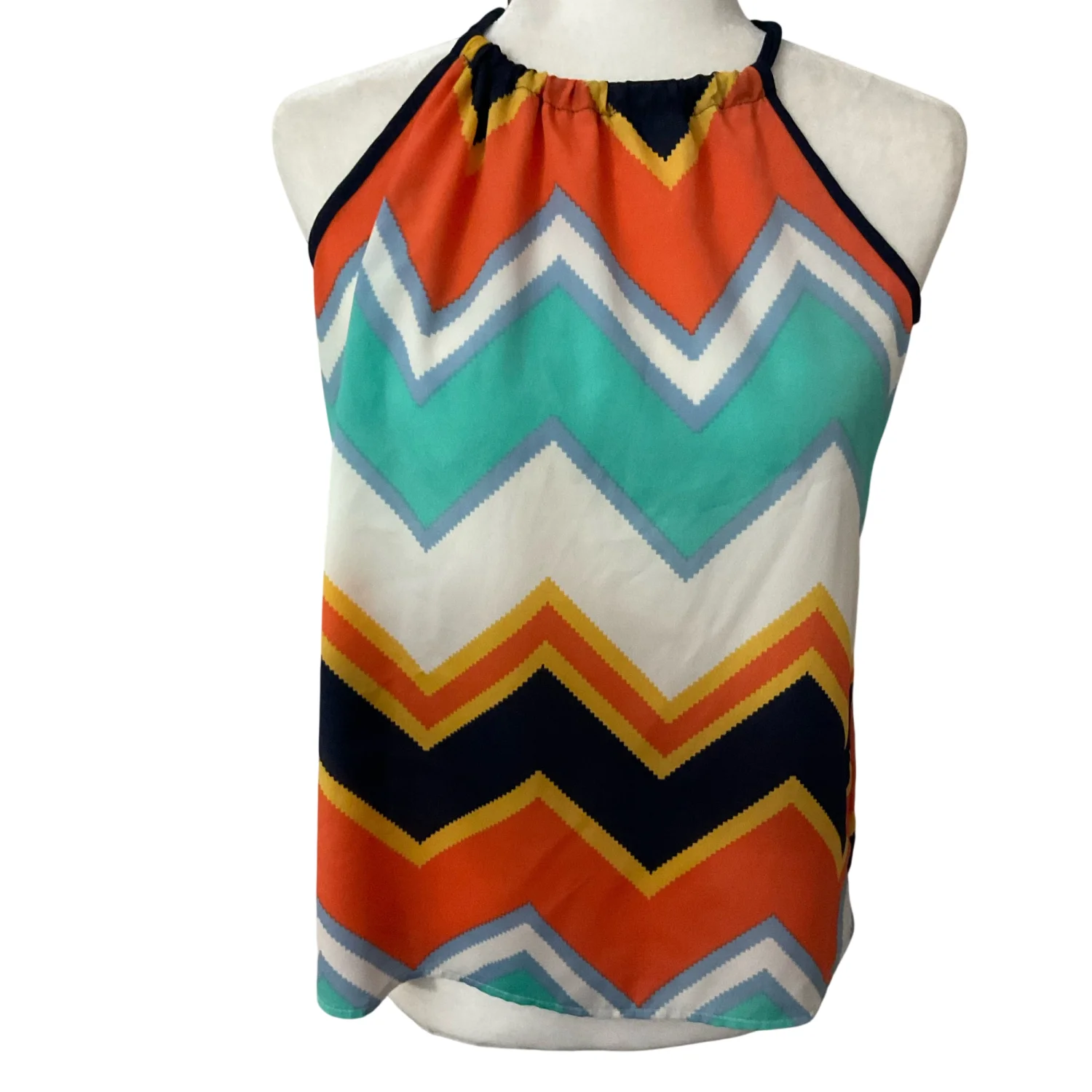 Style: Chevron print halter top blouse with tie closure on back Color: Multi Size: S Armpit: 19” Length: 24” 100% Polyester Good condition, some wear Hand wash cold