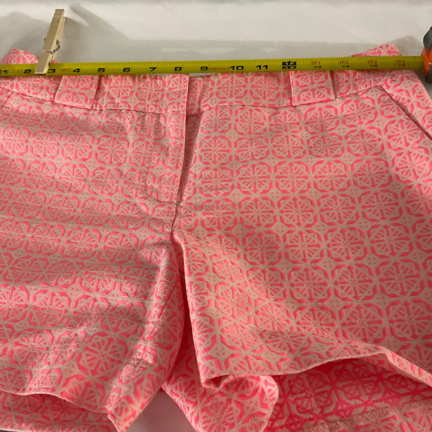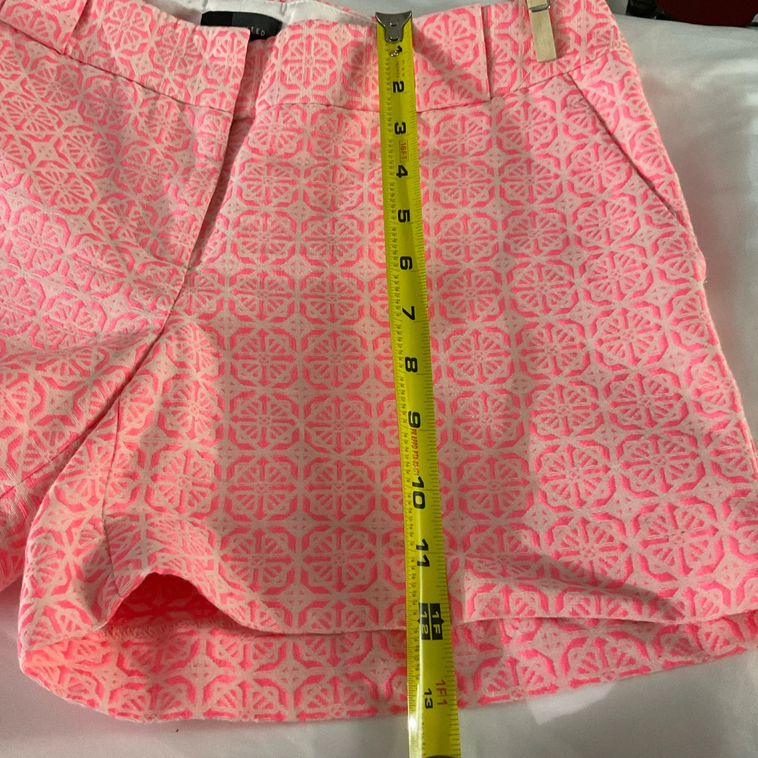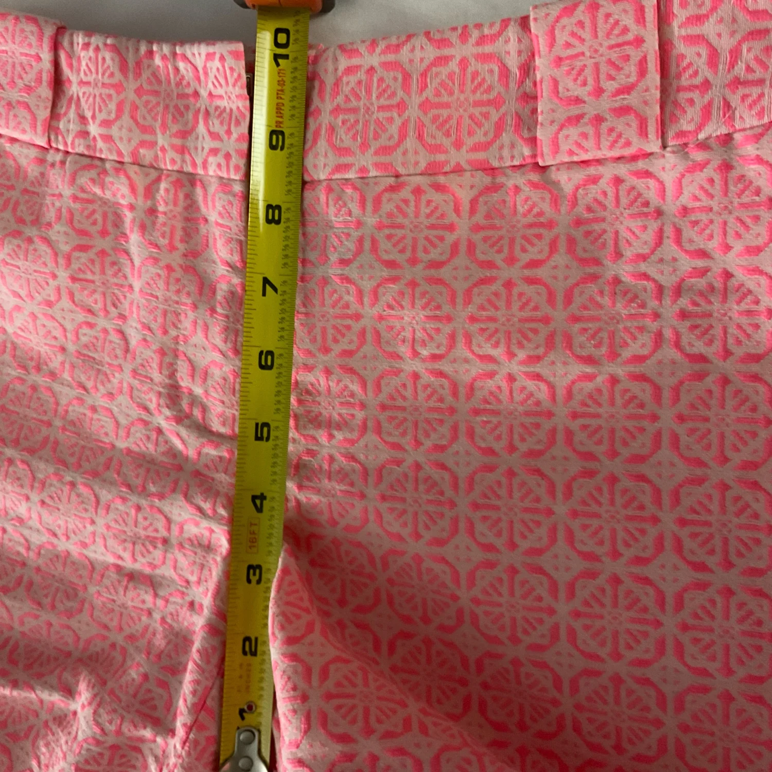 Style:Patterned textured short SH30J2443 Color: Pink/White Size: 6 Waist: 16' Length: 12" Condition: Good 57% Cotton 33% Polyester 10% Spandex Machine wash/dry clean