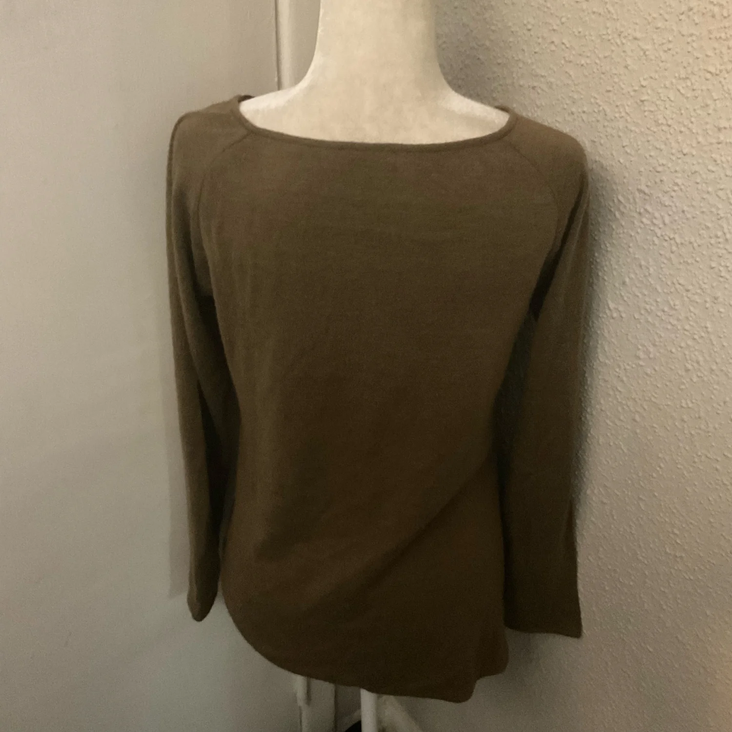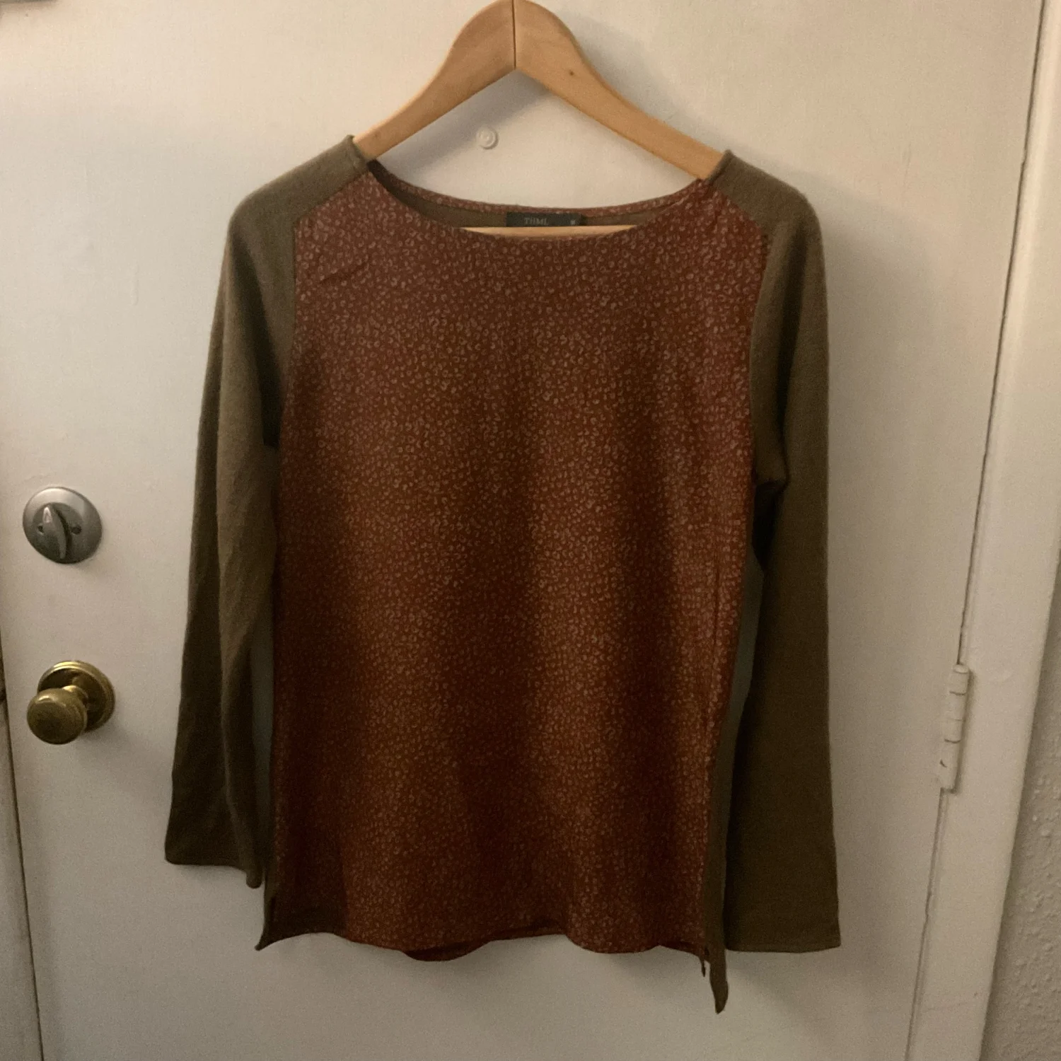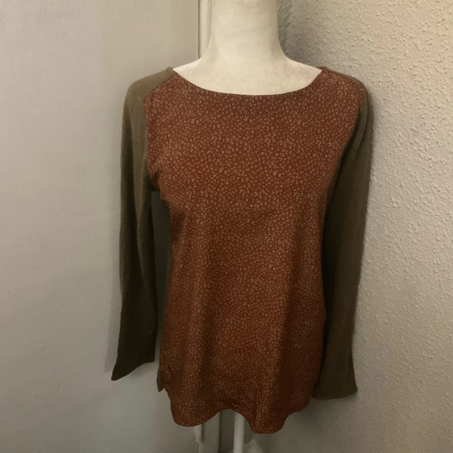 Style: Long Sleeve crew neck top with two tone fabric/ material Color: Brown/ Orange Size: M Armpit: 17” Length: 25” Sleeve: 29” Condition: Good, normal we Nylon / Cotton material Hand wash only
