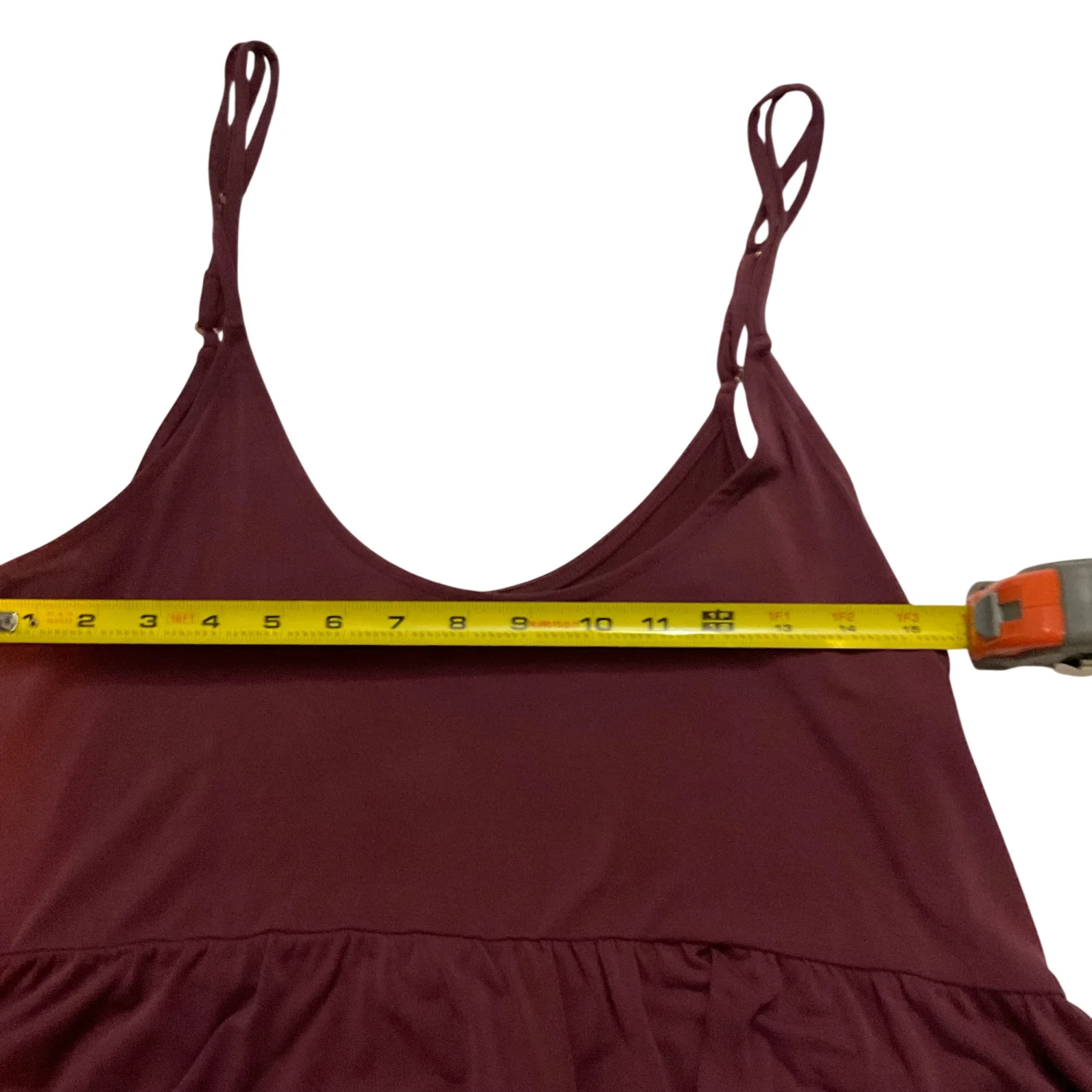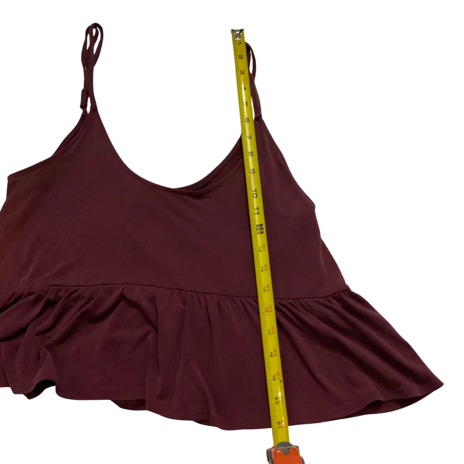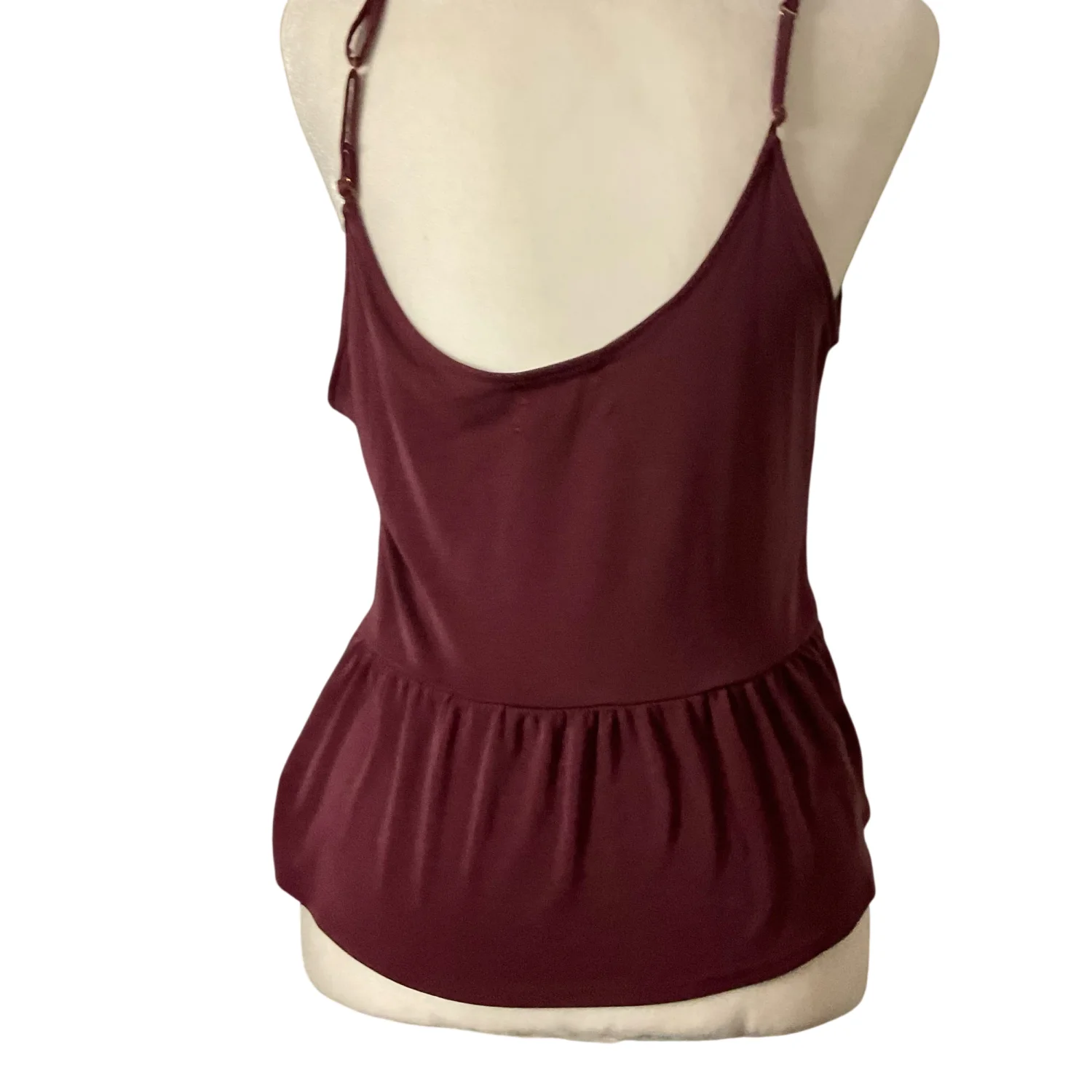 Style: Peplum tank with adjustable straps Color: Maroon Size: Small Armpit: 17" Length: 20" Condition: Good 64% Modal 36% Polyester Machine wash