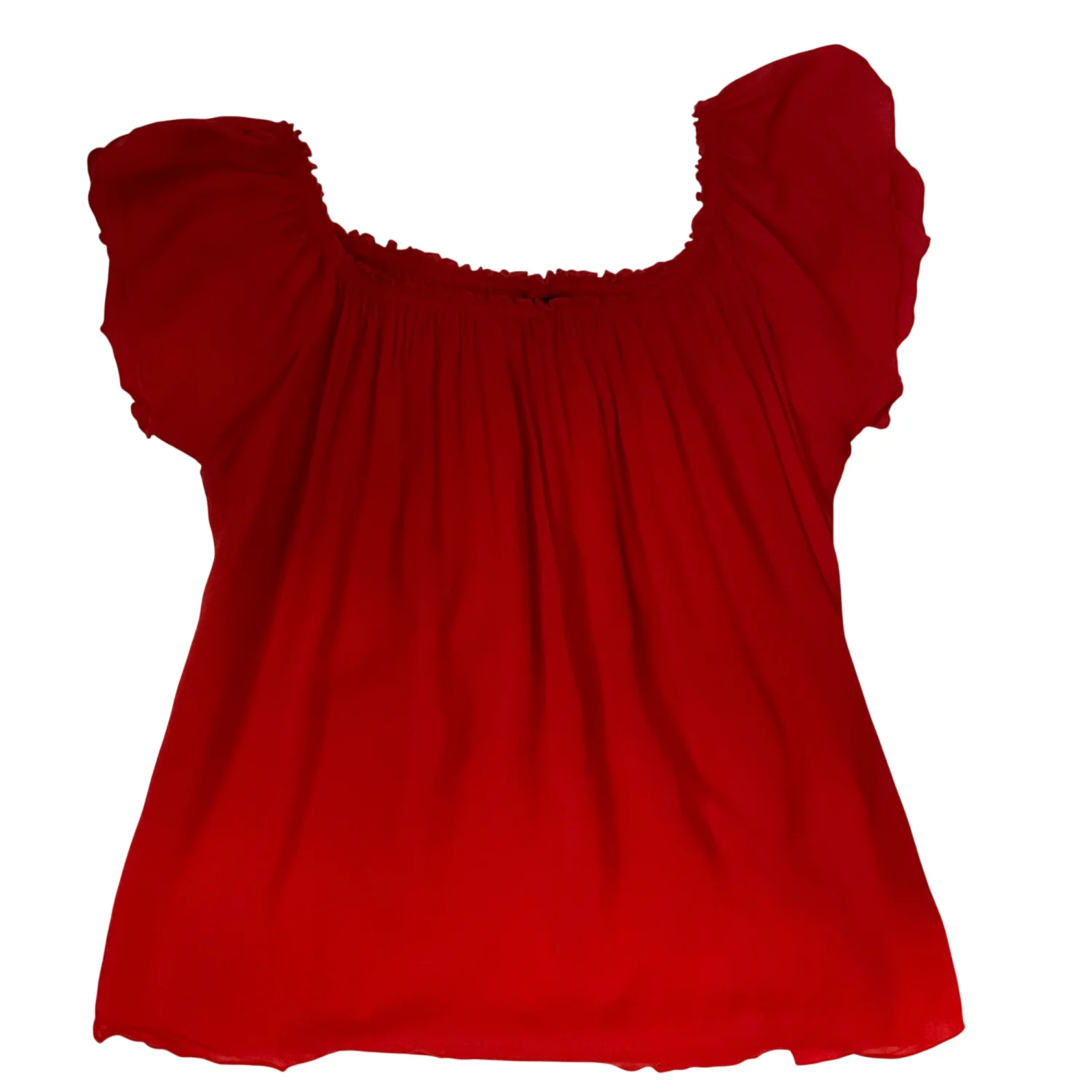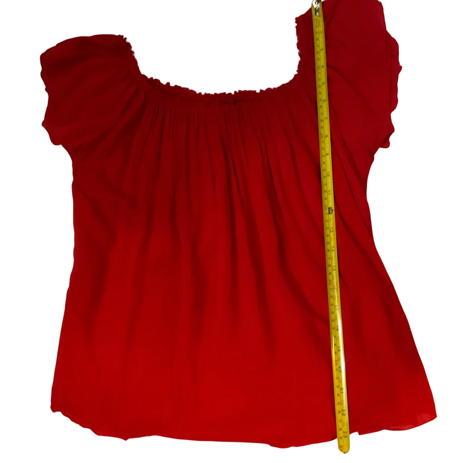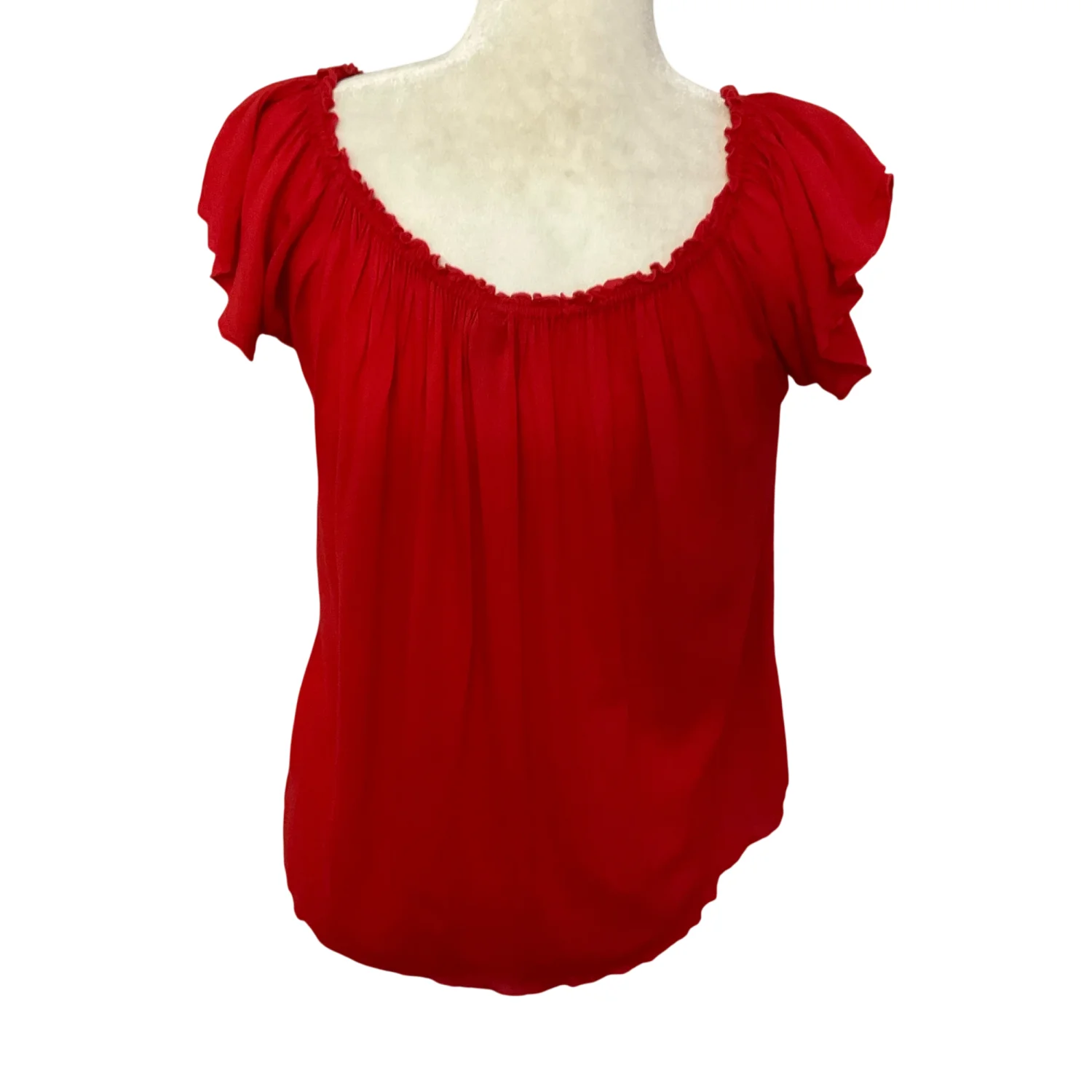 Style: Short sleeve crew neck flutter sleeve blouse Color: Red Size: S/M Armpit: 16' Length: 23" Condition: Good 100% Rayon Hand wash