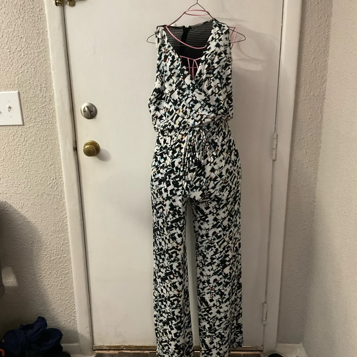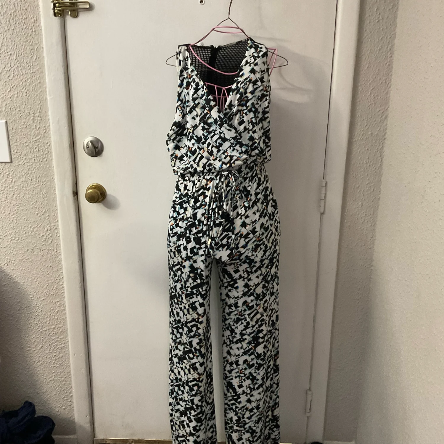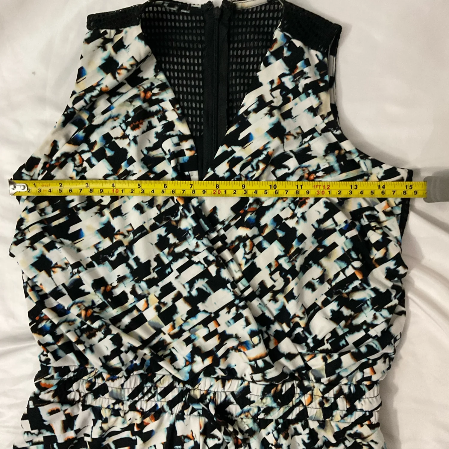 Style: V- Neck, Jumpsuit with drawstring waist , Netted back material on back top Color: White/Black/Blue Size: 0P( Zero Petite) Armpit: 15" Waist: 13" Inseam: 28" Condition: One gold piece on drawstring missing 95% Polyester 5% Spandex Hand wash cold