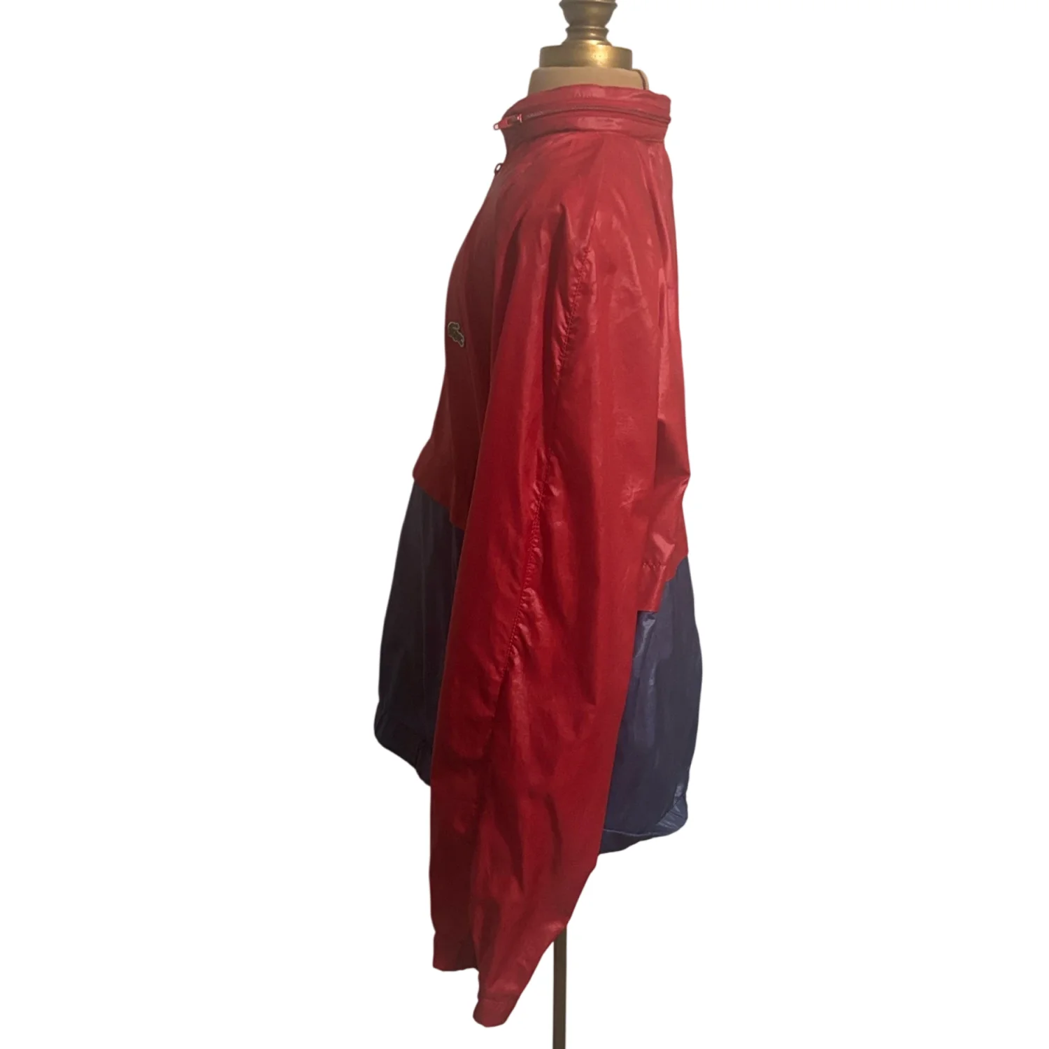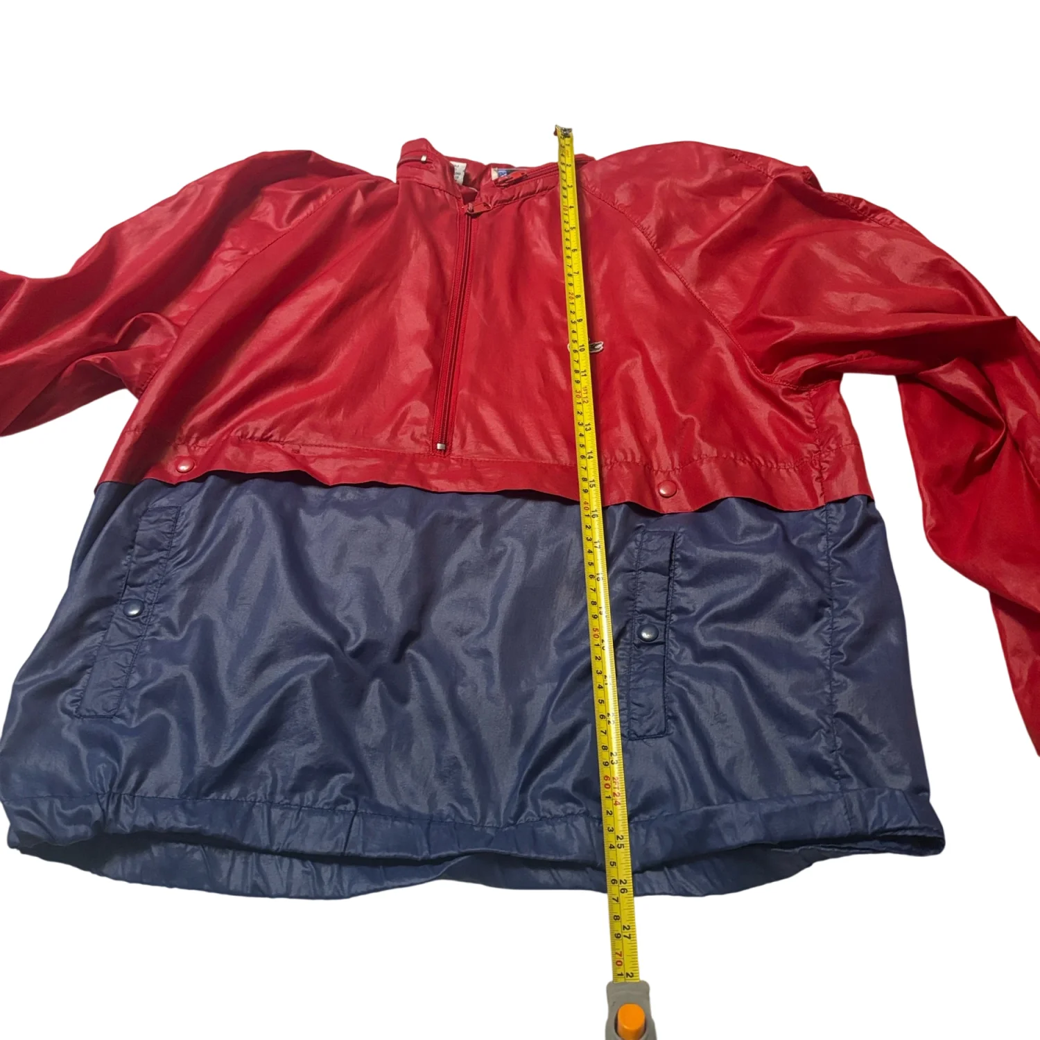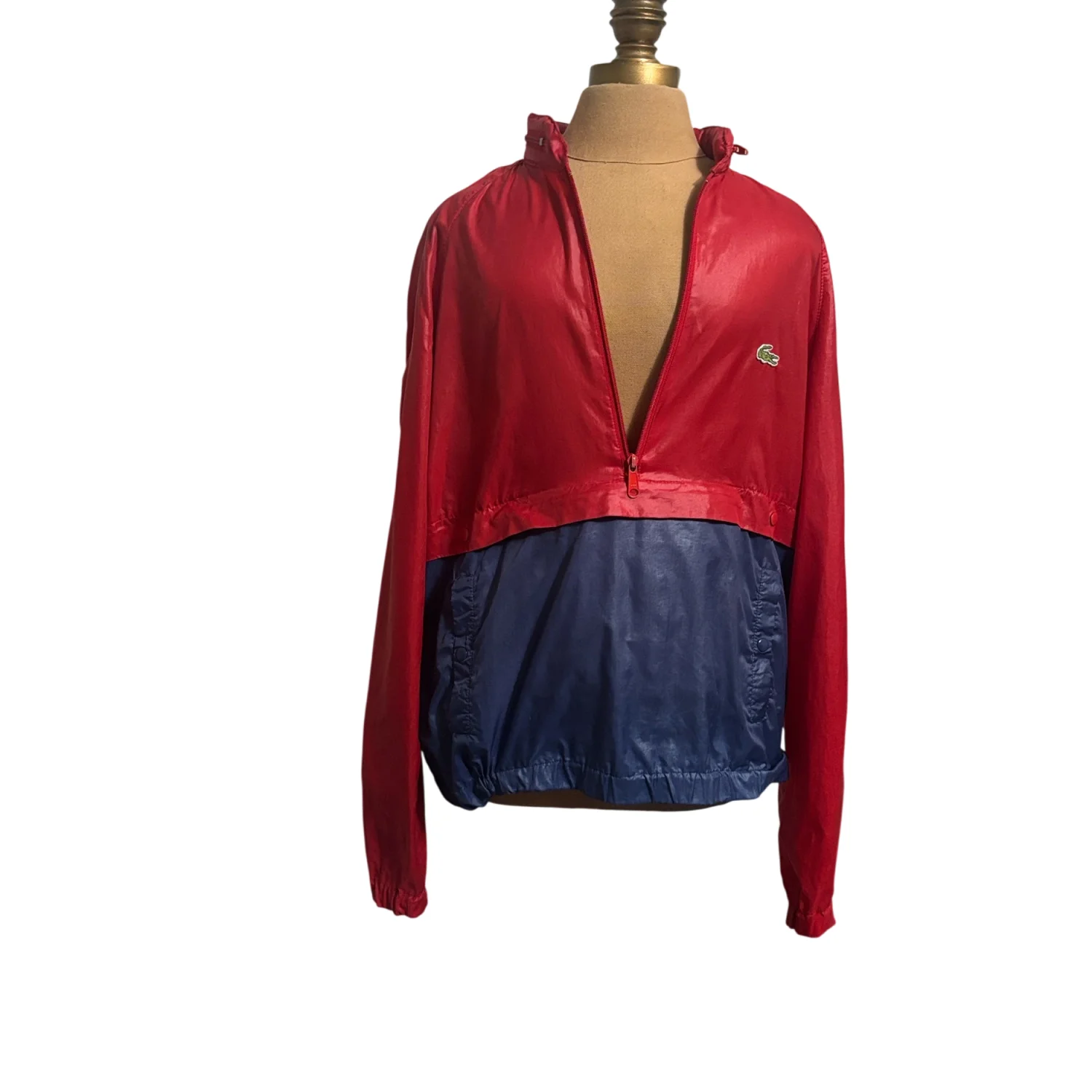 Style: Bold Lacoste pullover with a striking red and navy design. Hidden hood in top zip fold. Also features a half-zip closure with three pockets ( 1 hidden) and iconic logo. Color: Red/Blue Size: L Armpit: 23" Length: 26" Condition: Good, elastic has turned in bottom of jacket as pictured. Does not affect wearability. 100% Nylon