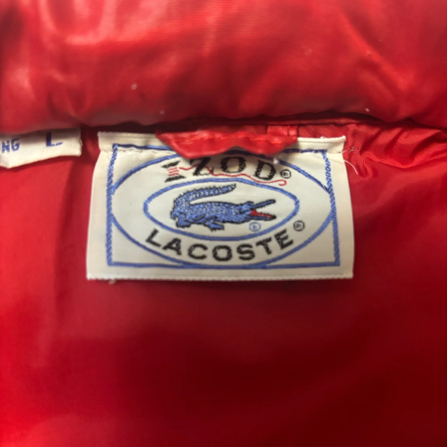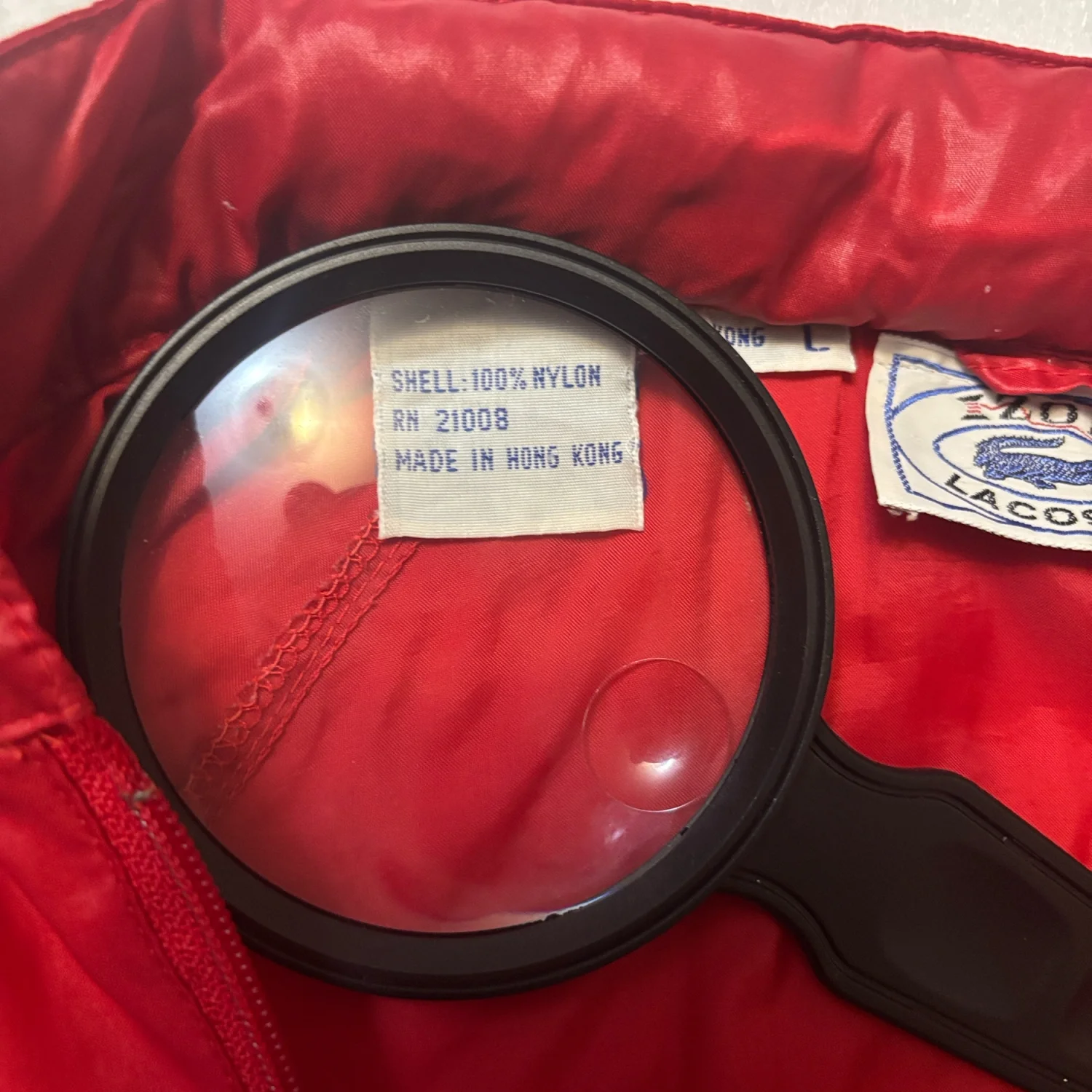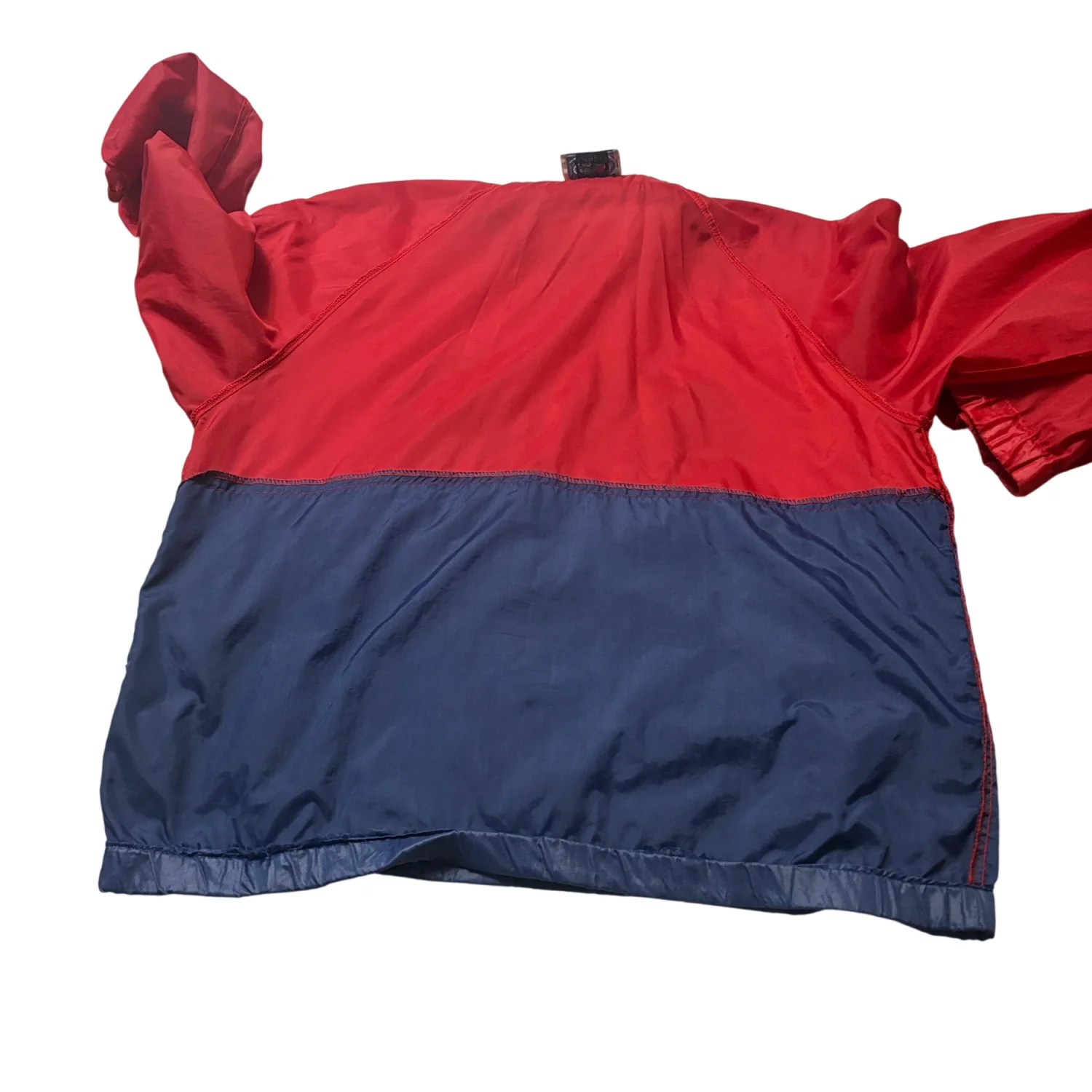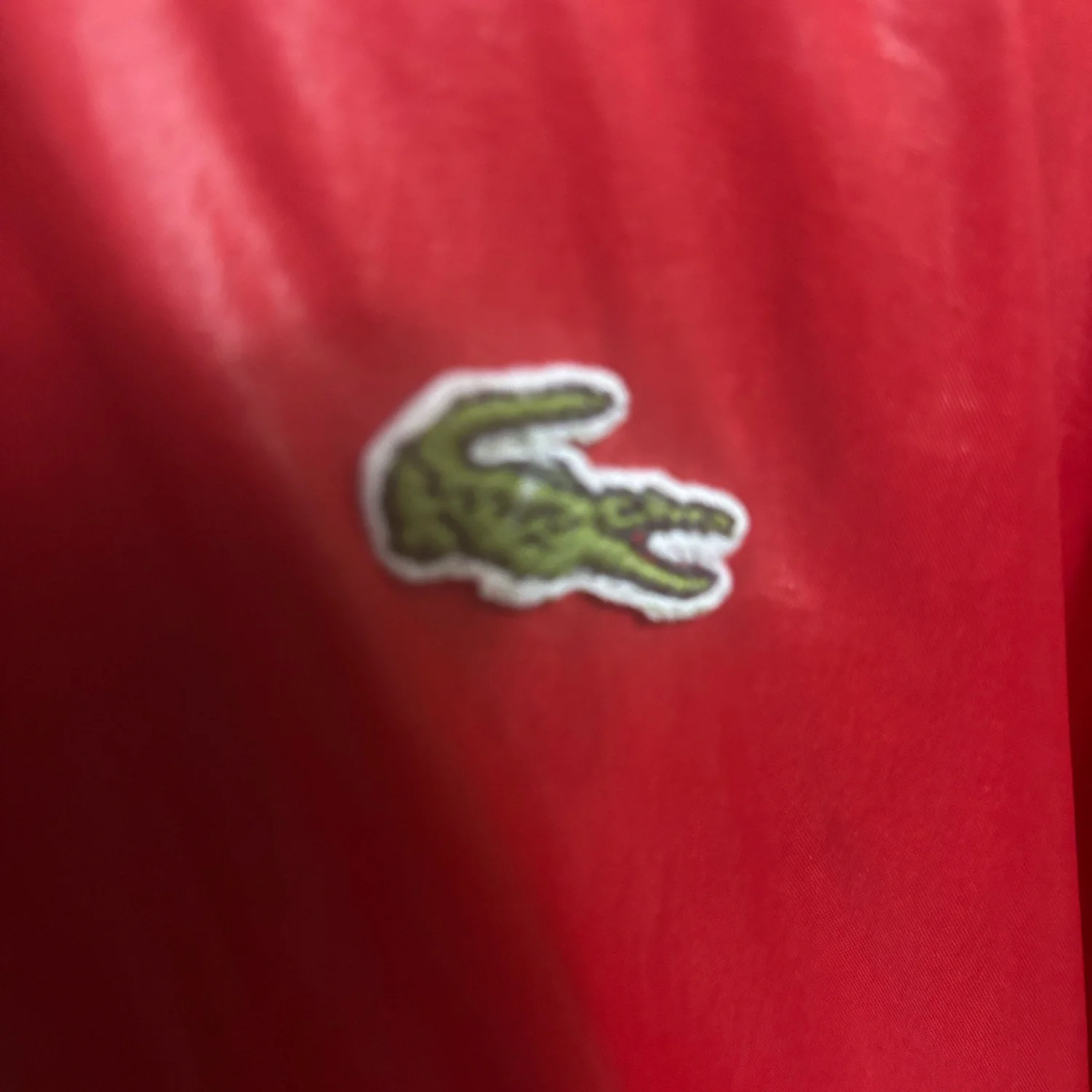 Style: Bold Lacoste pullover with a striking red and navy design. Hidden hood in top zip fold. Also features a half-zip closure with three pockets ( 1 hidden) and iconic logo. Color: Red/Blue Size: L Armpit: 23" Length: 26" Condition: Good, elastic has turned in bottom of jacket as pictured. Does not affect wearability. 100% Nylon