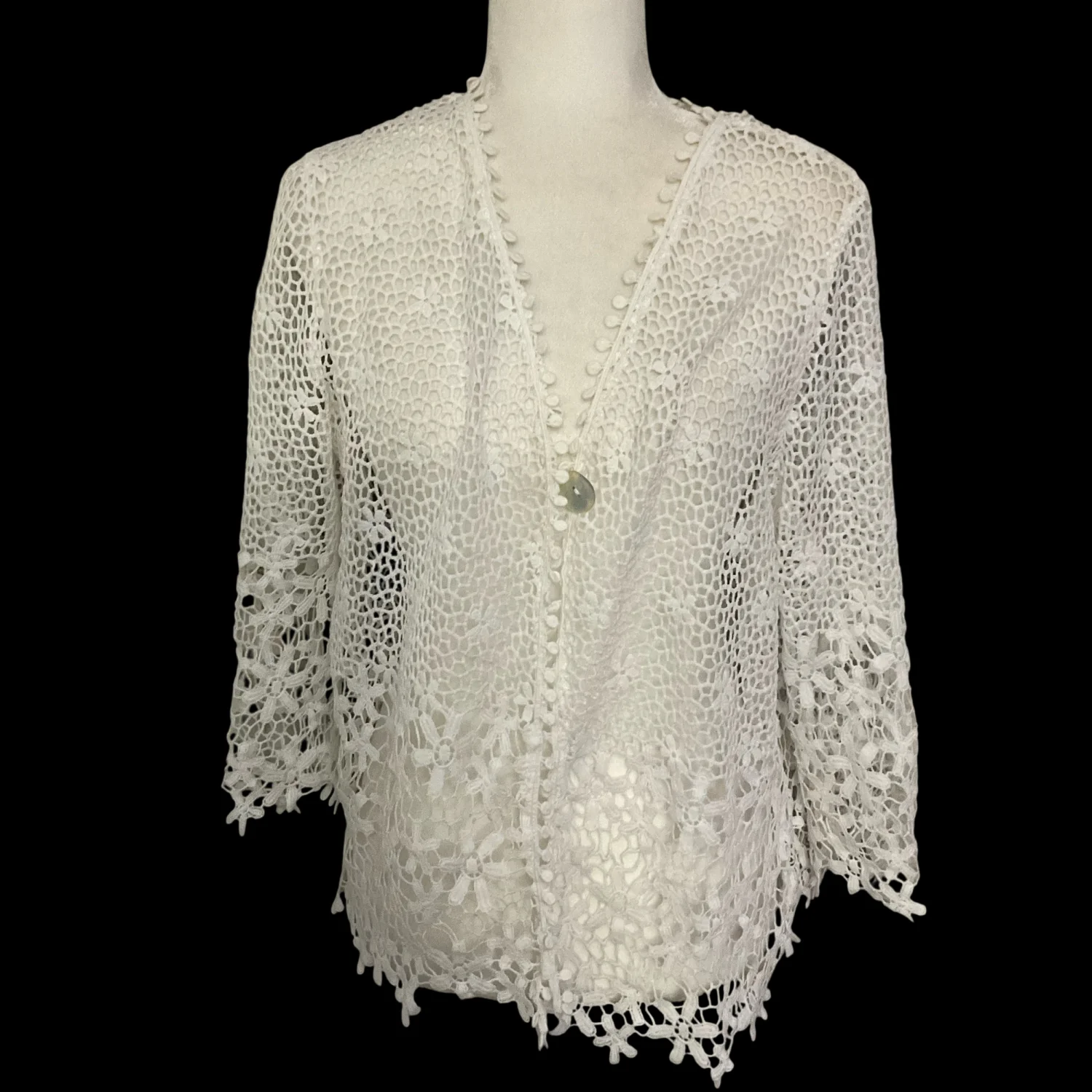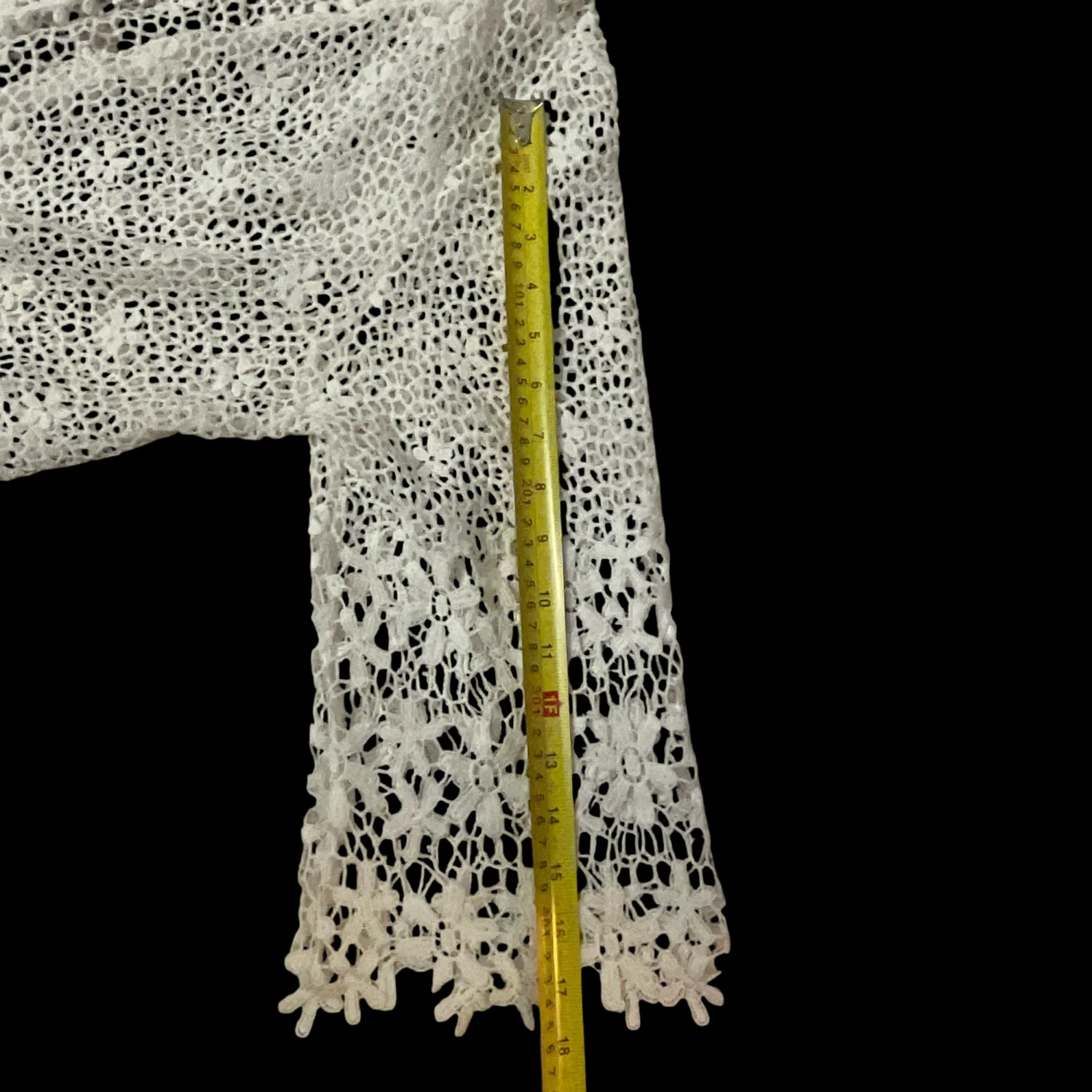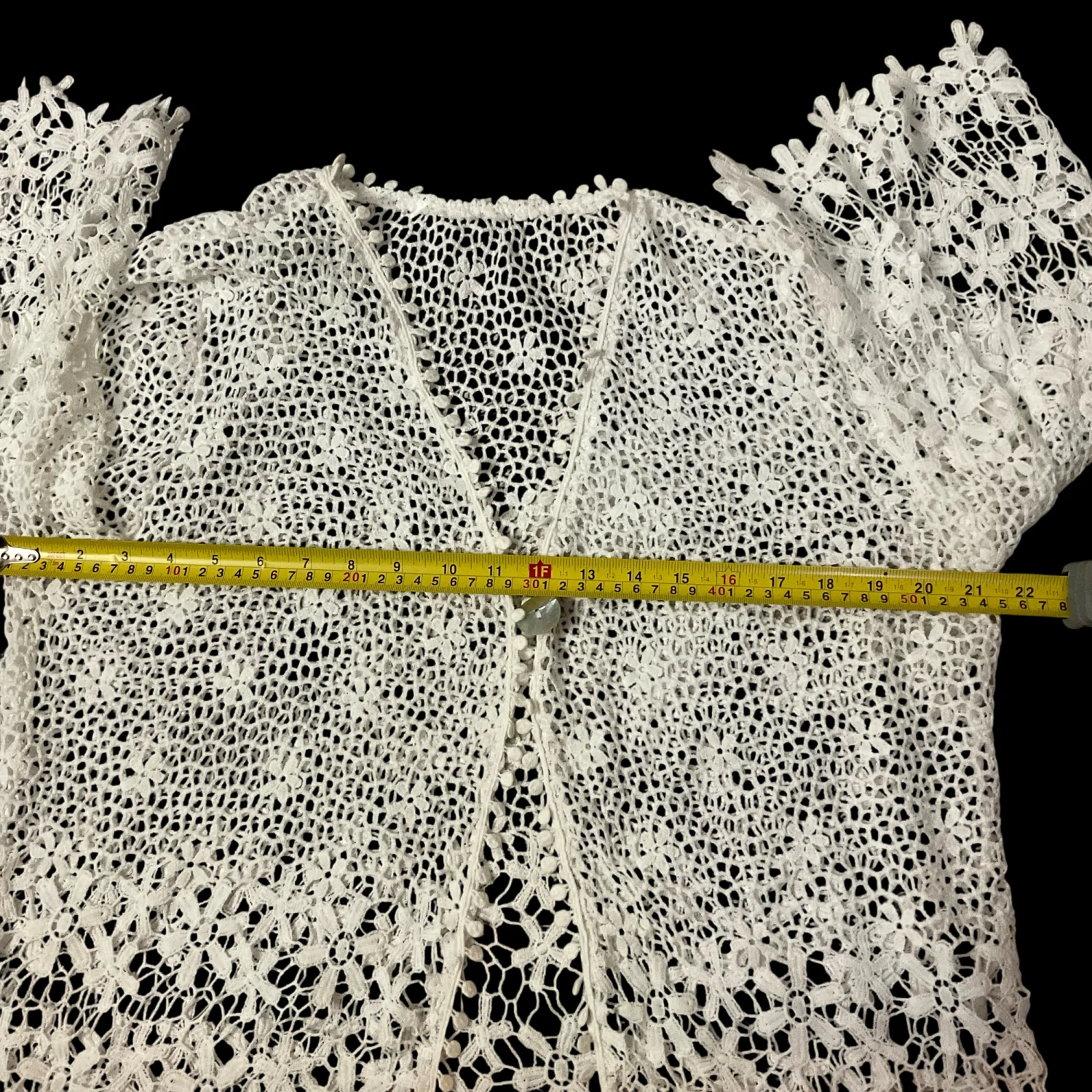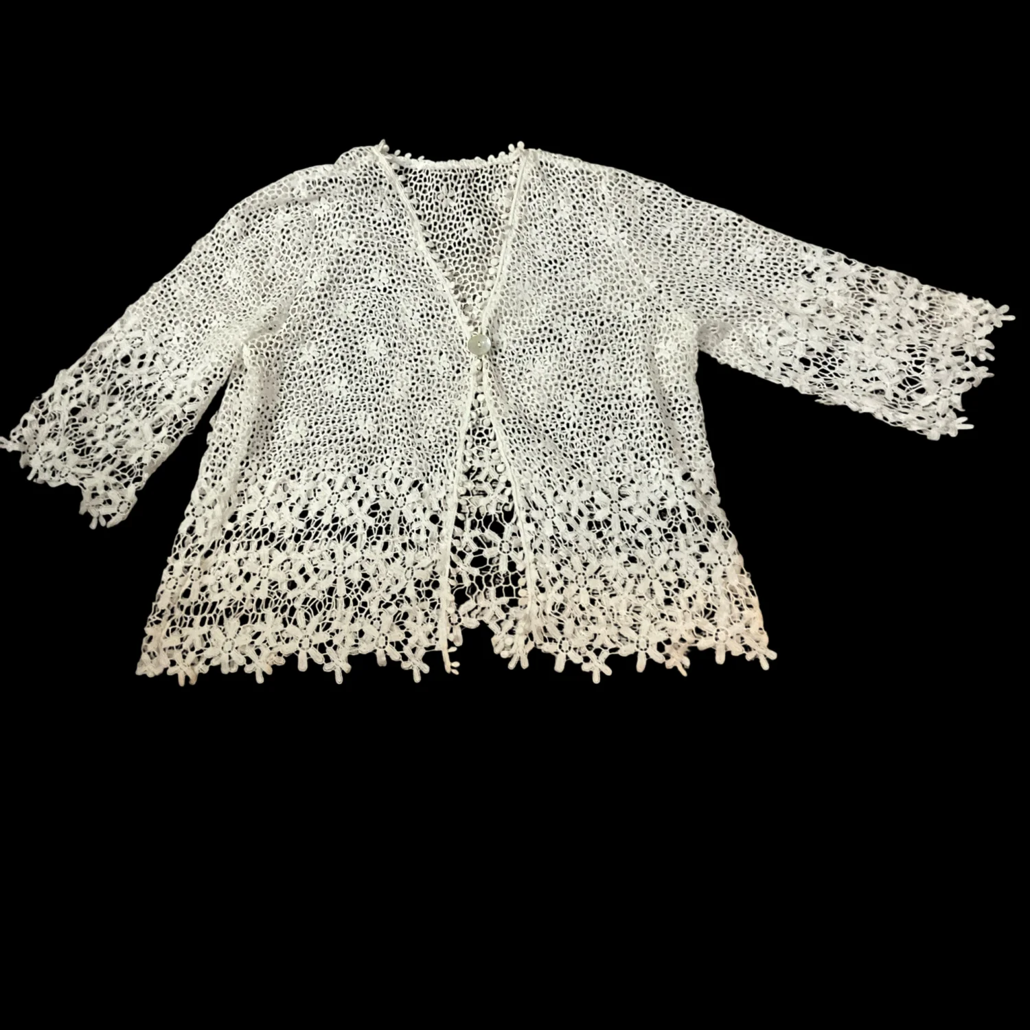 Style: Lace Cardigan, one button Color: White Size: No Size Label Armpit: 21” Length: 23” Arm length: 17” Condition: Good