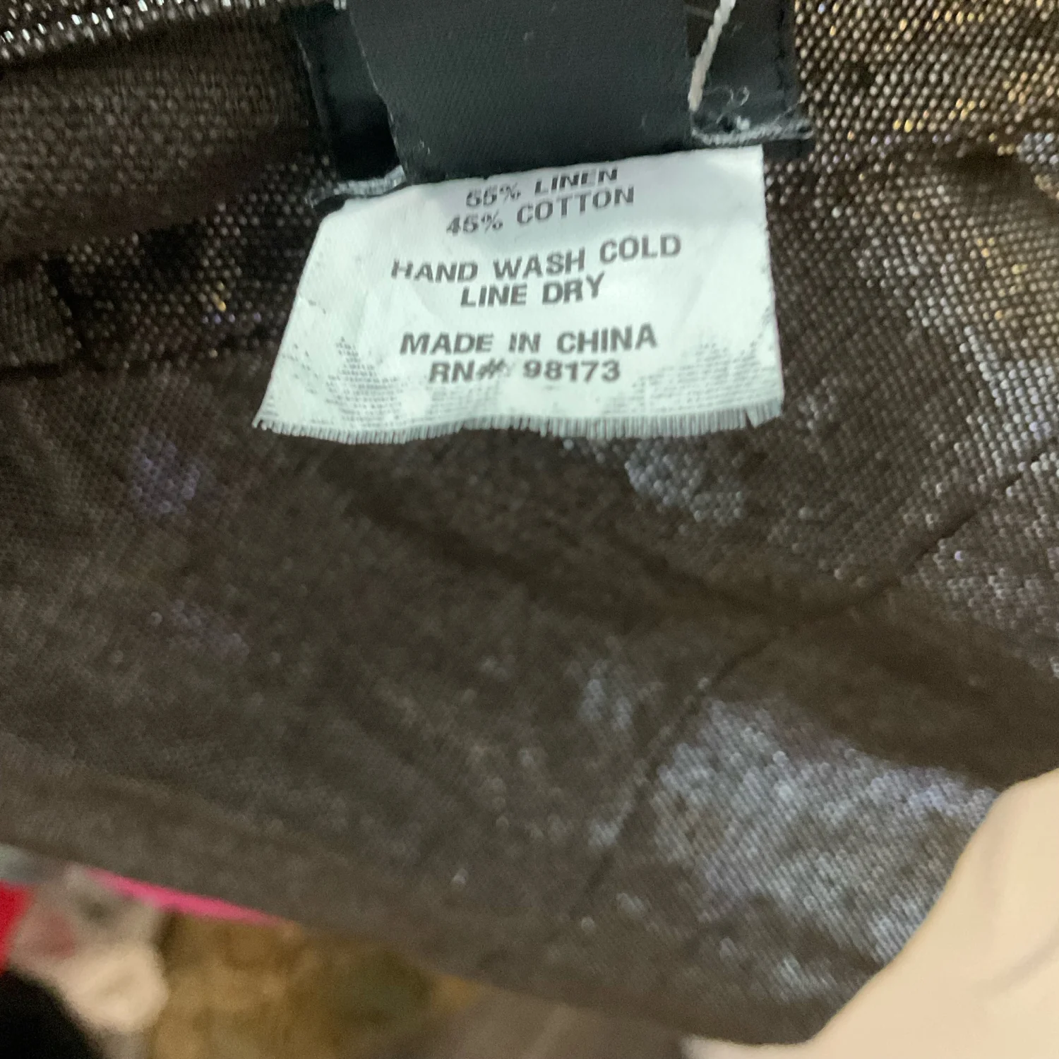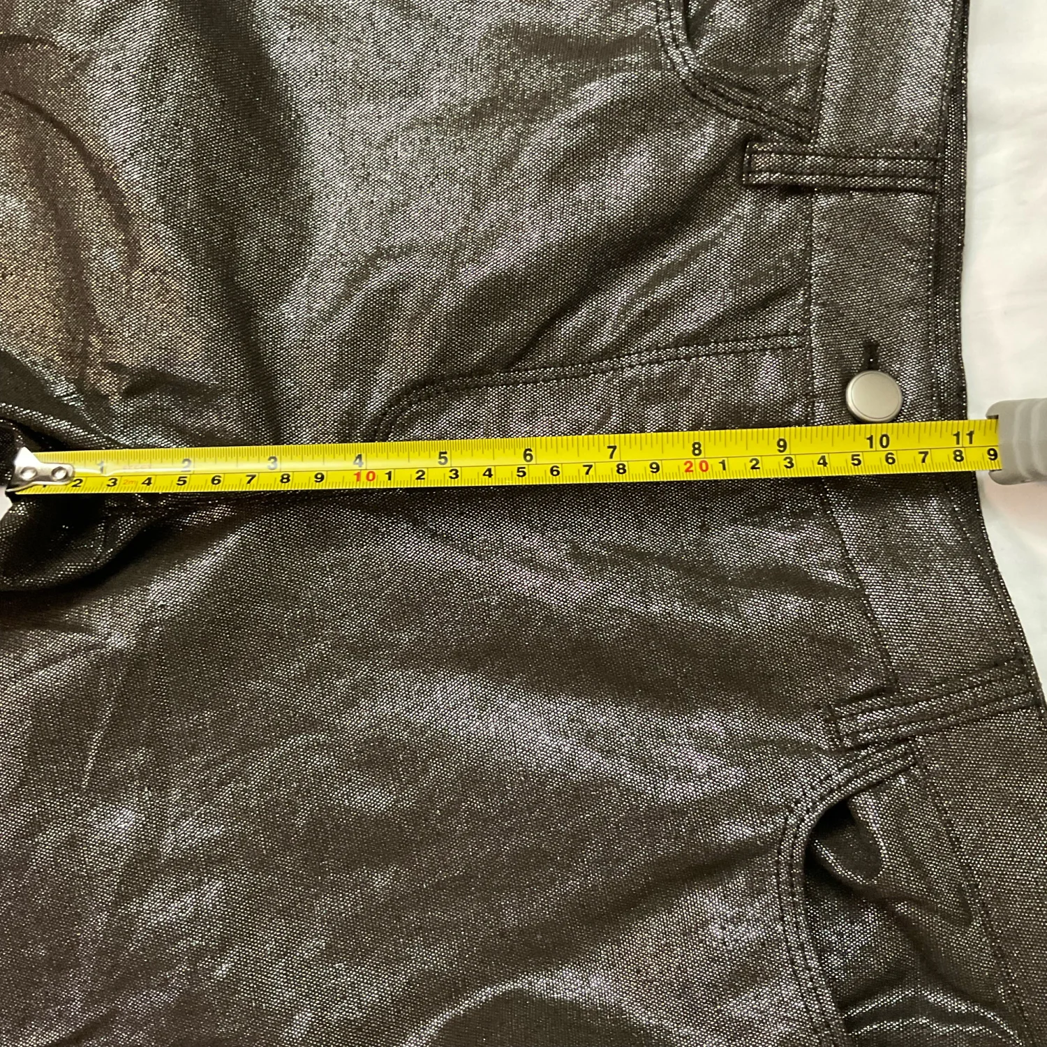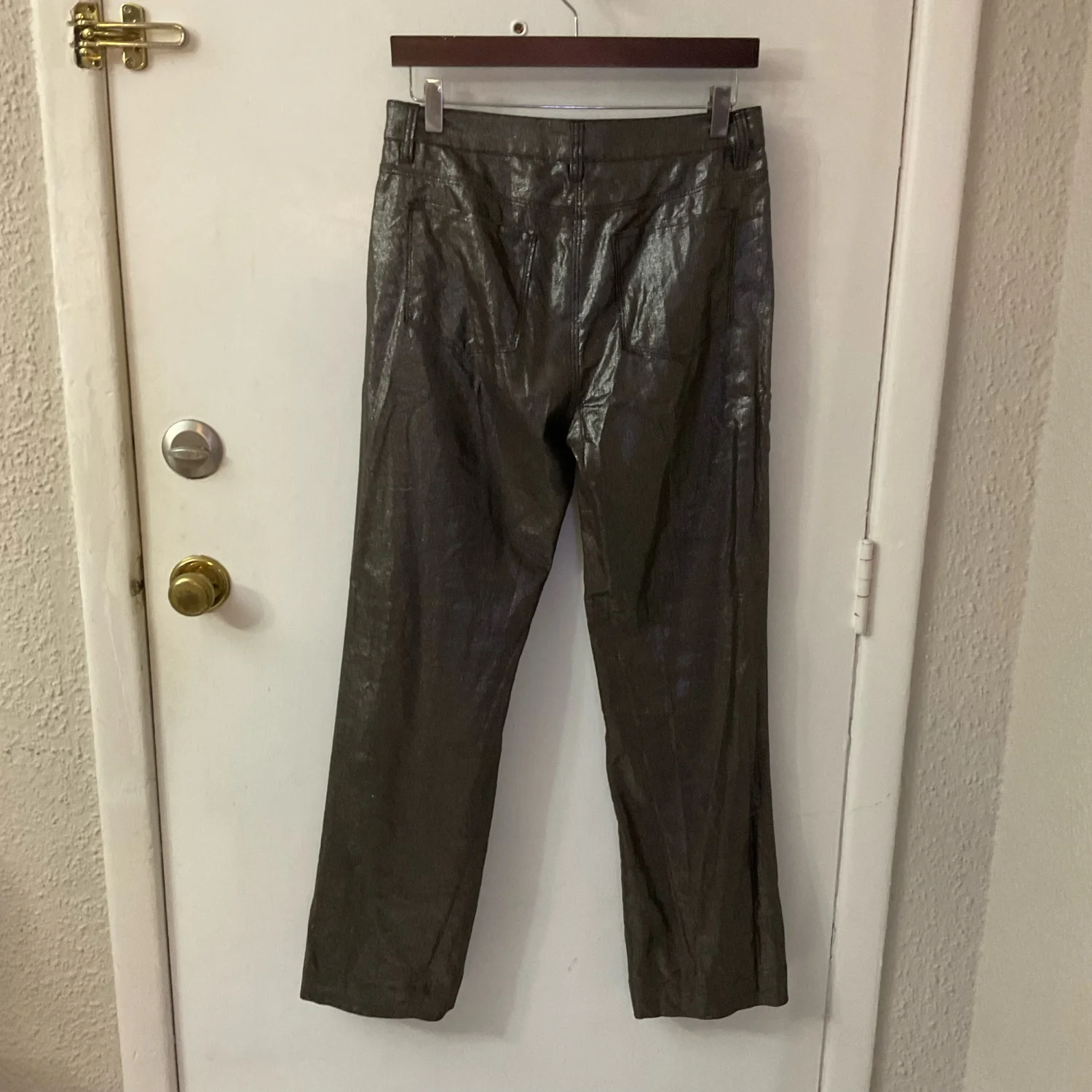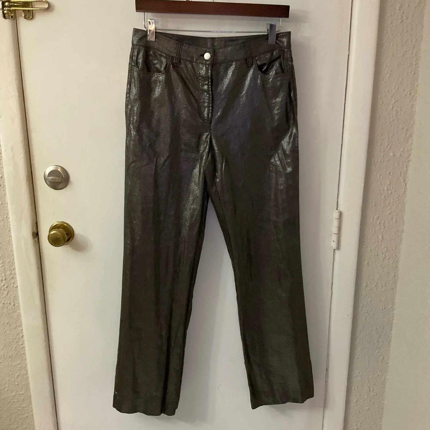 Style: Button front, 4pocket, metallic finish Color: Brown Size: 8 W: 15” Rise: 11” Inseam: 30” Condition: Good 55% Linen 45% Cotton