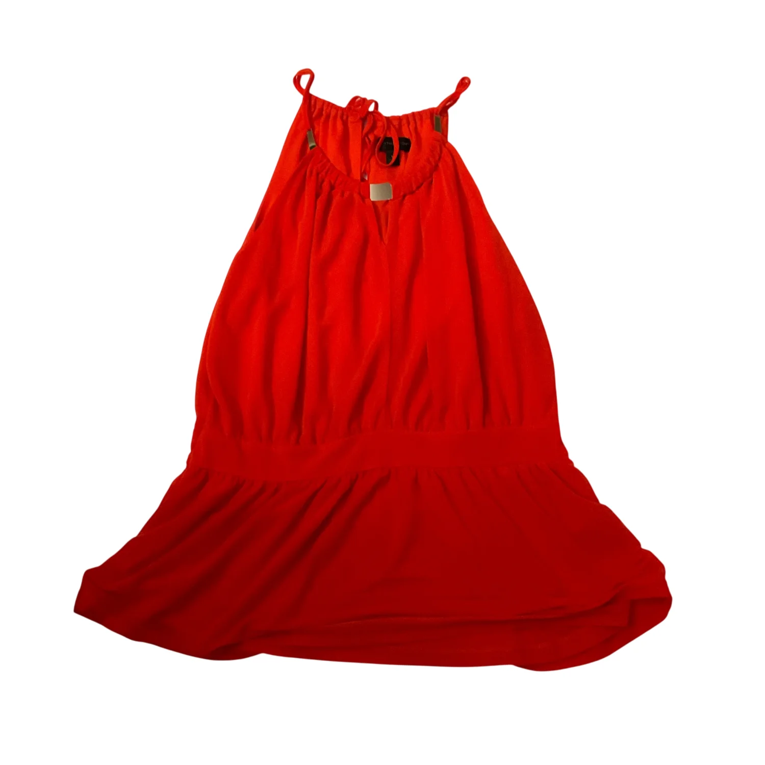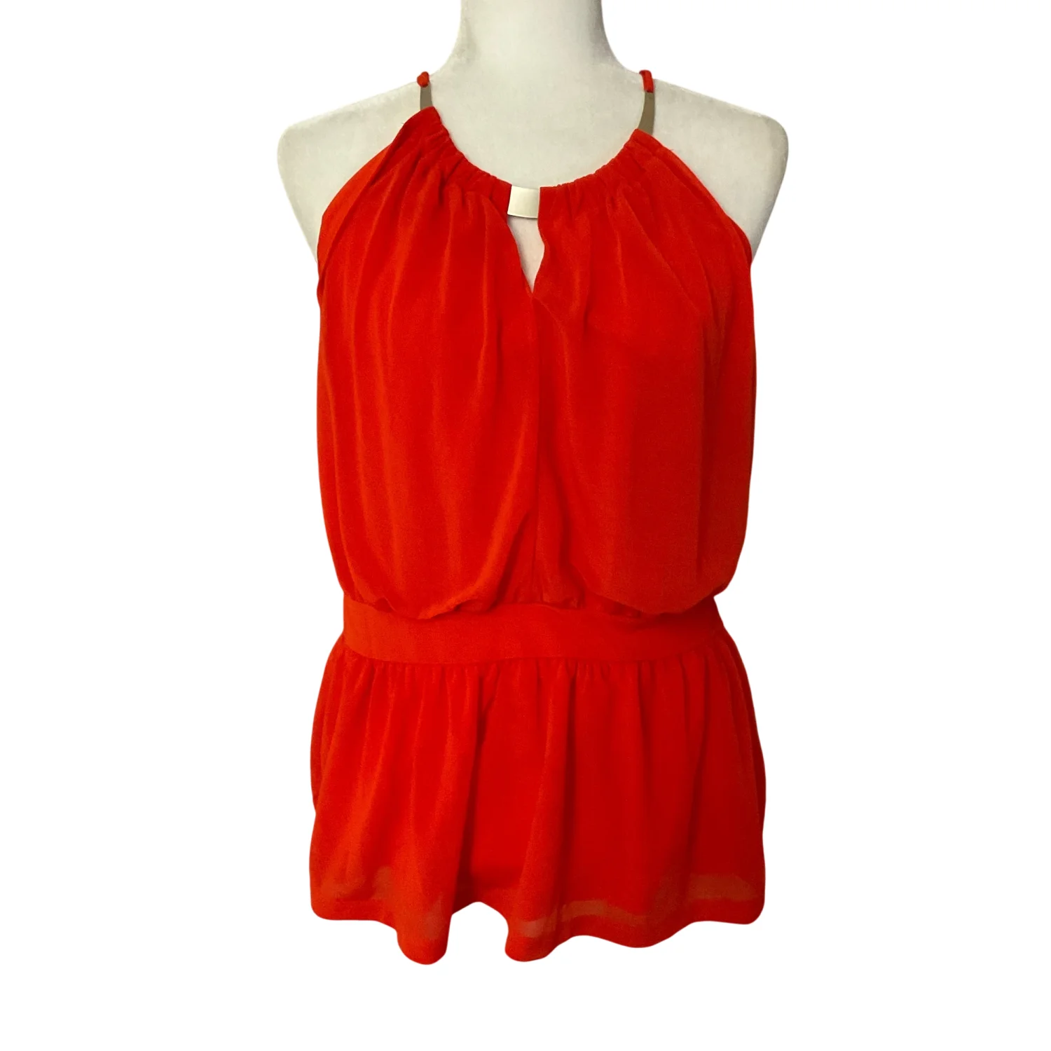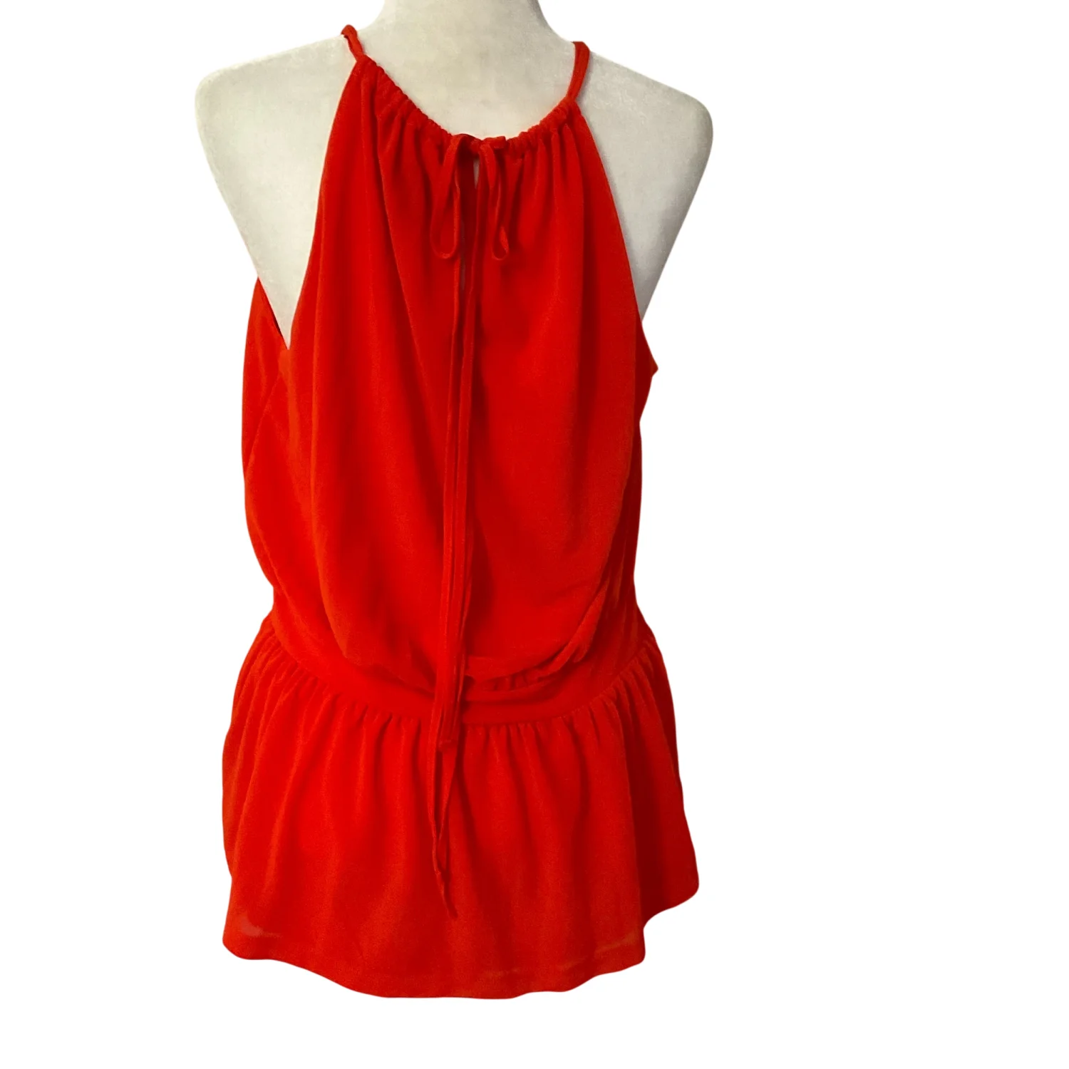 Style: Sleeveless tank with necklace collar in front Color: Orange Size: L Armpit: 17” Length: 25” Condition: Good 100% Polyester Machine wash cold, gentle cycle