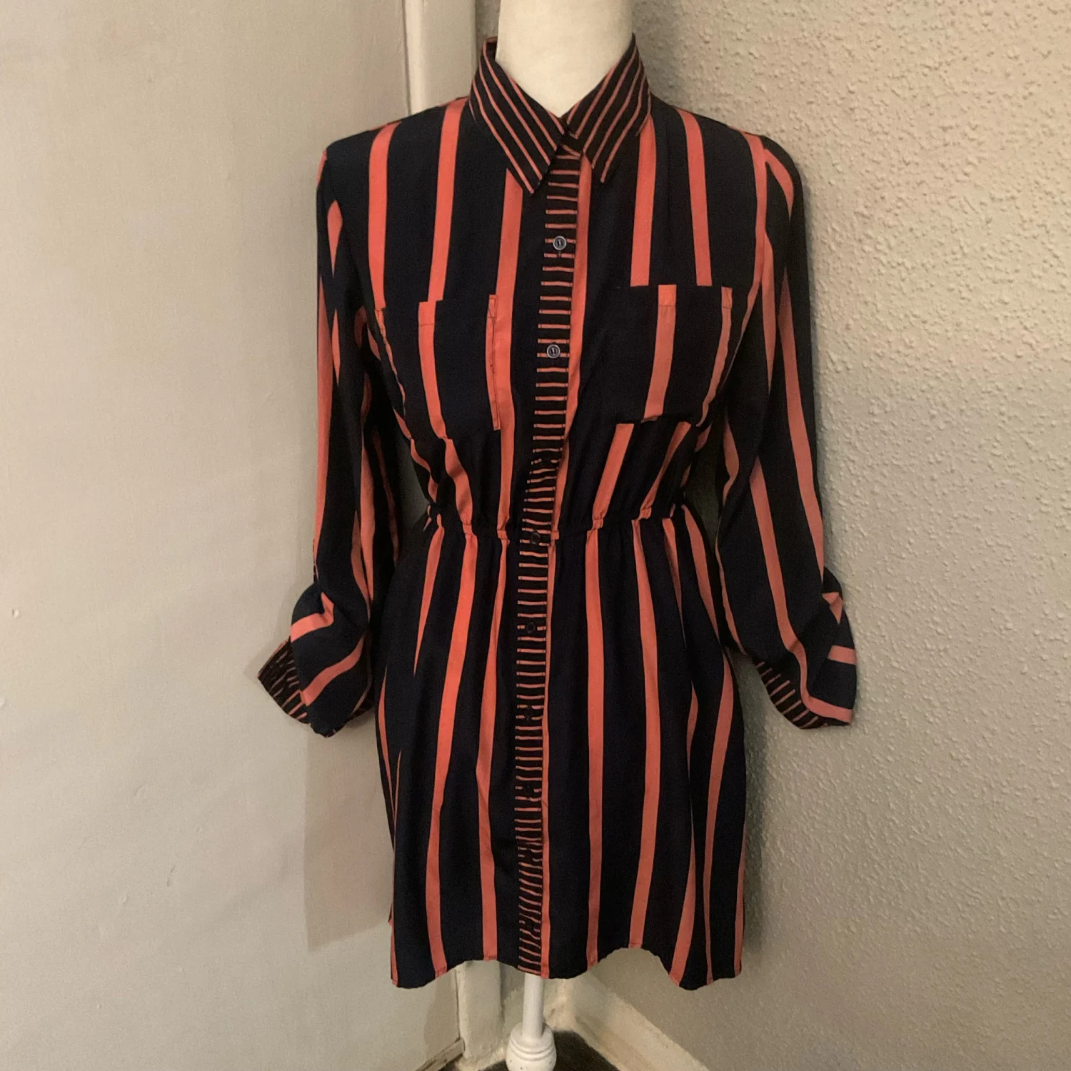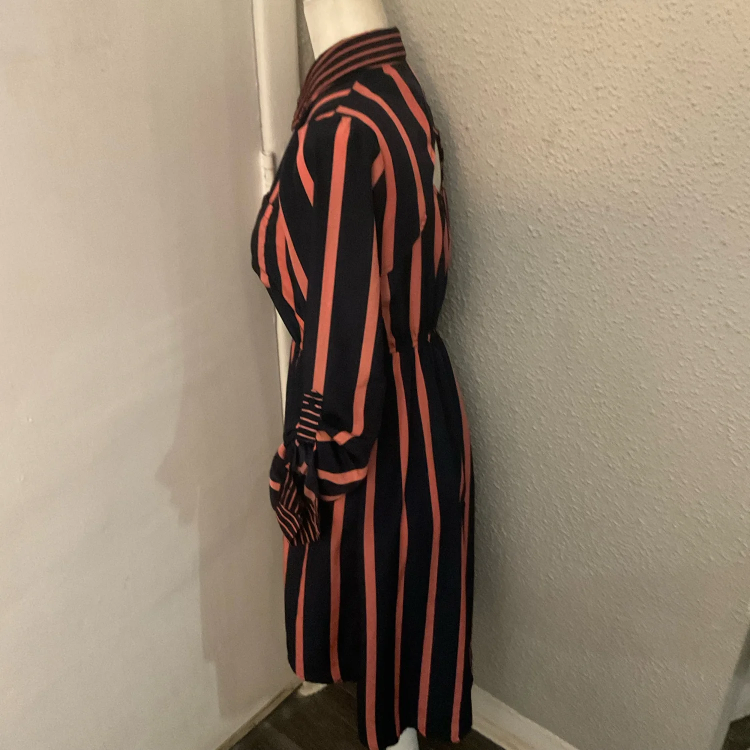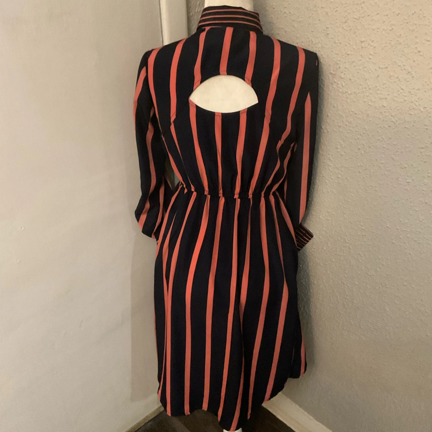 Style: Long sleeve striped shirt dress with cutout back and roll tab sleeves Color: Navy/ Salmon Pink Size: S Armpit: 16” Waist: 12” Length: 41” 100% Polyester Machine wash cold