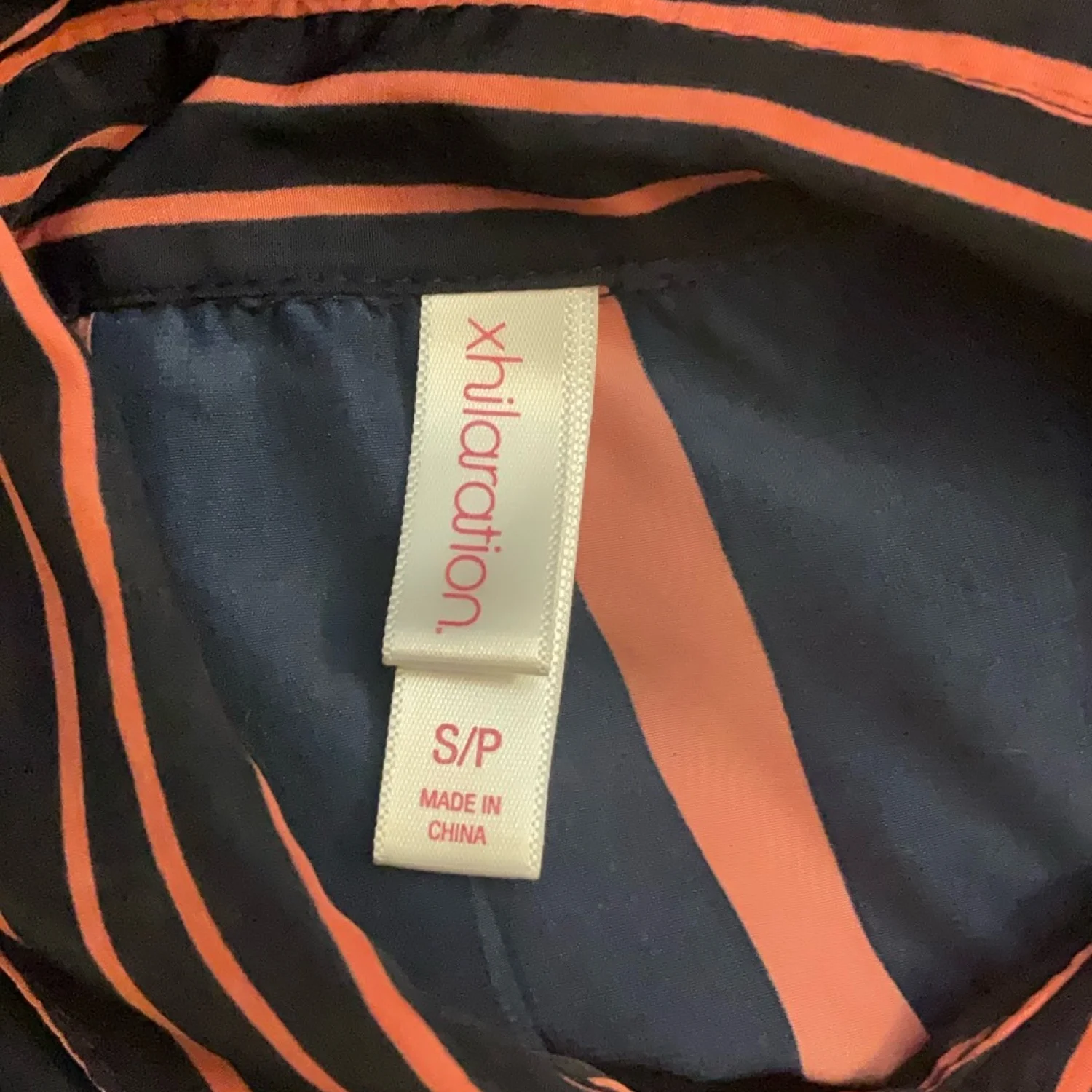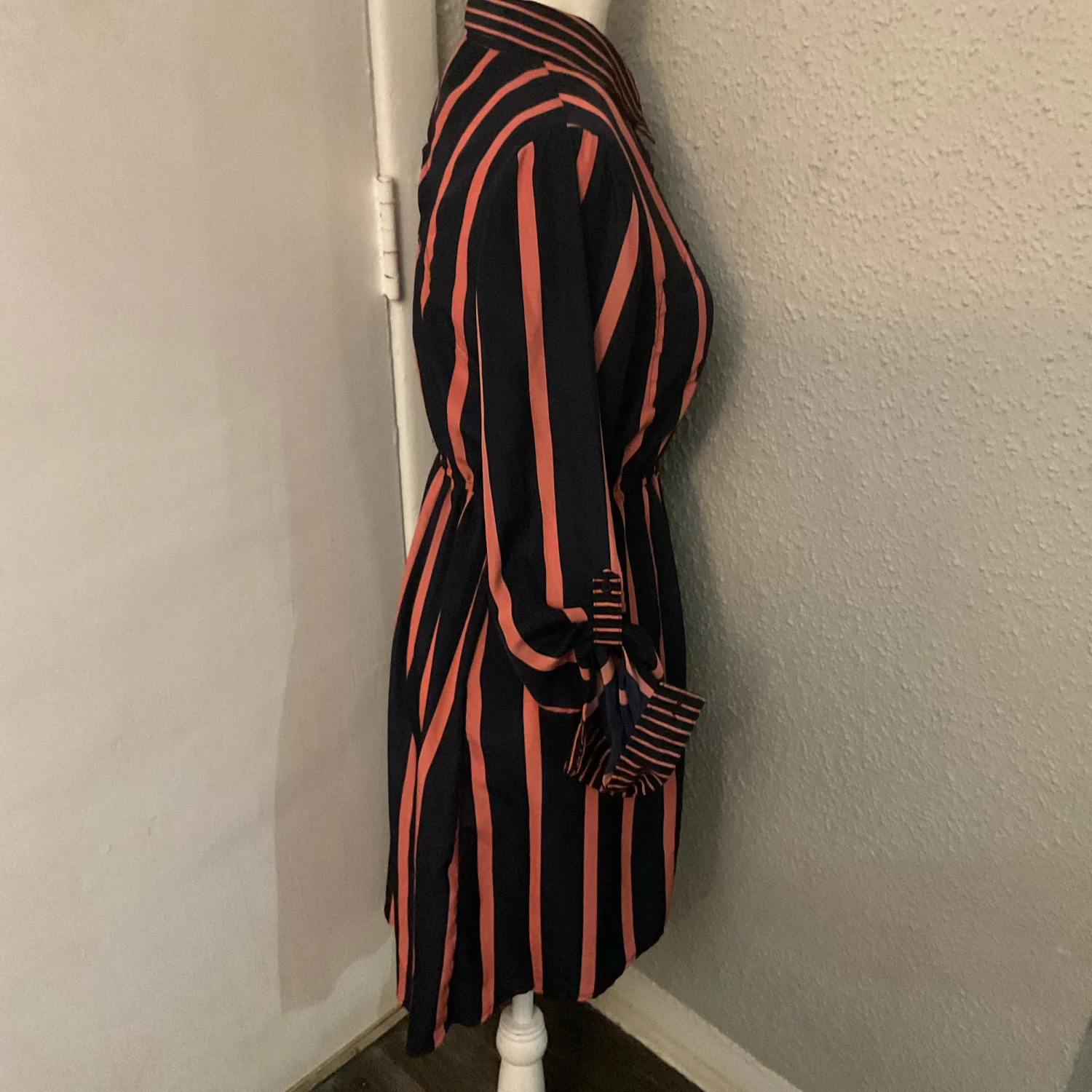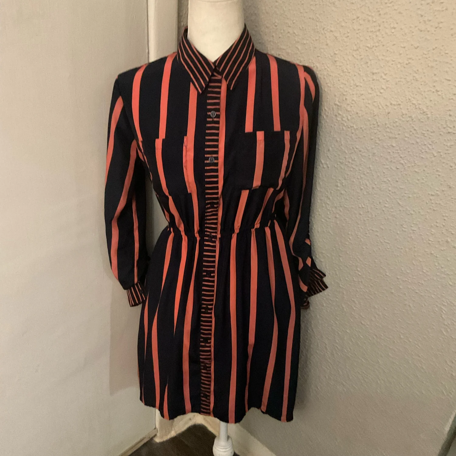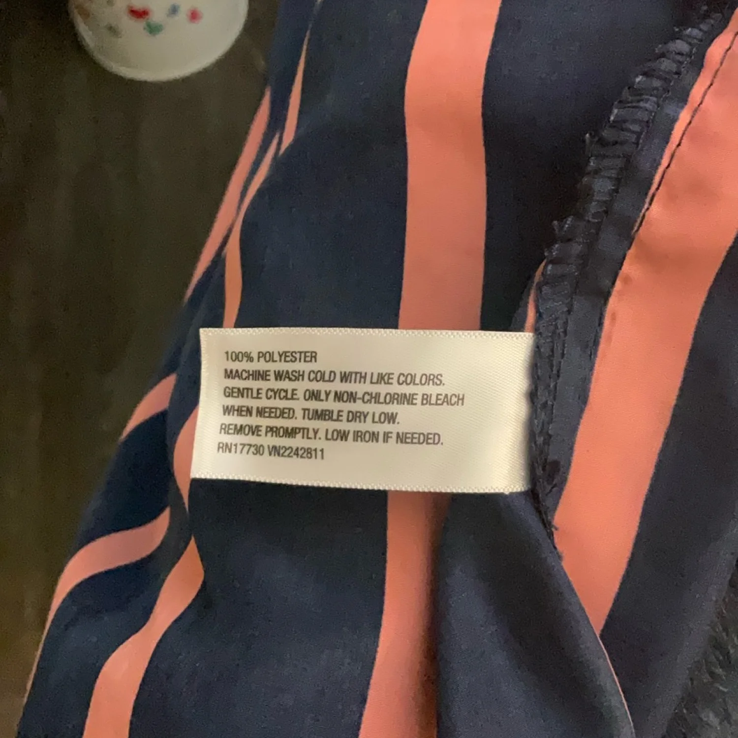 Style: Long sleeve striped shirt dress with cutout back and roll tab sleeves Color: Navy/ Salmon Pink Size: S Armpit: 16” Waist: 12” Length: 41” 100% Polyester Machine wash cold
