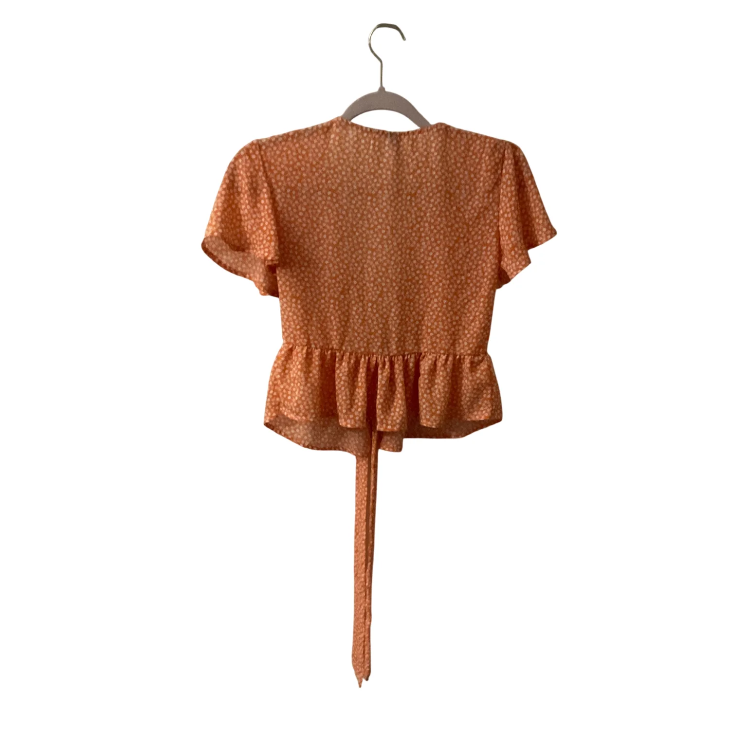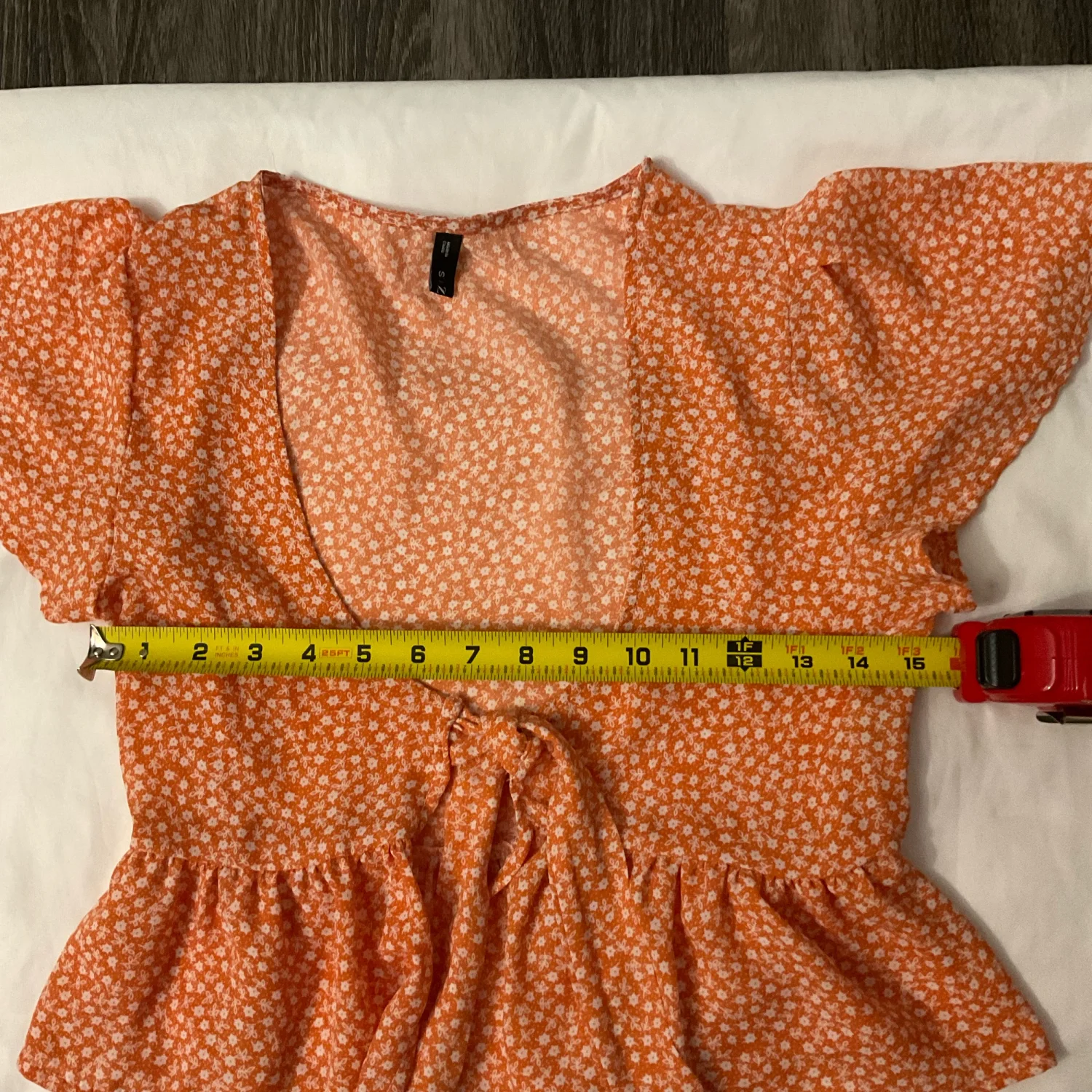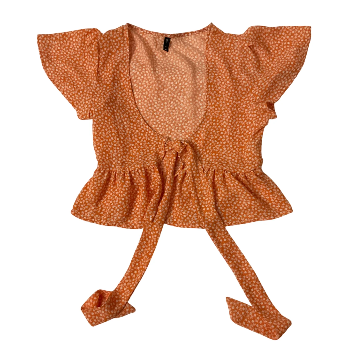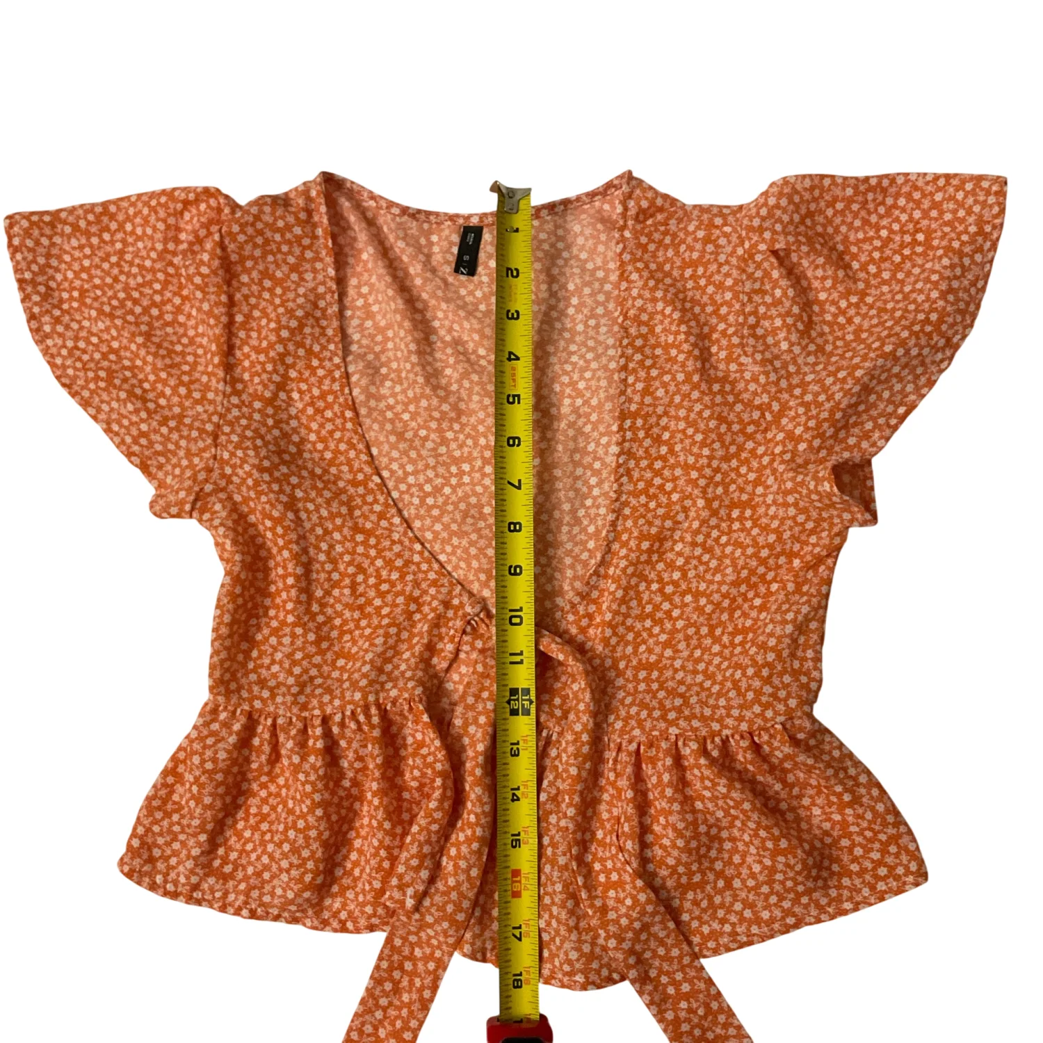 Style: Tie front, ruffled flutter sleeve blouse Color: Orange/ White Size: 4 Armpit: 15” Length: 18” Condition: Good 100% Polyester Machine wash