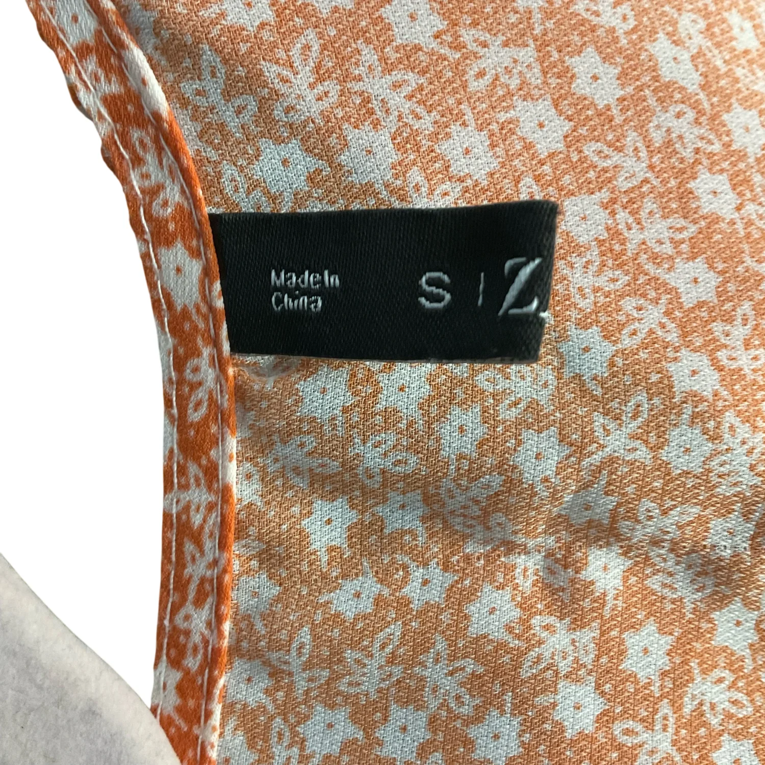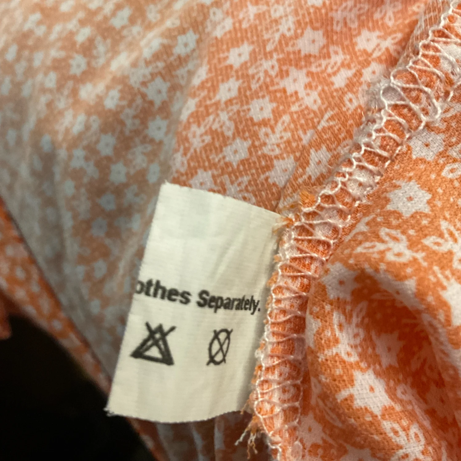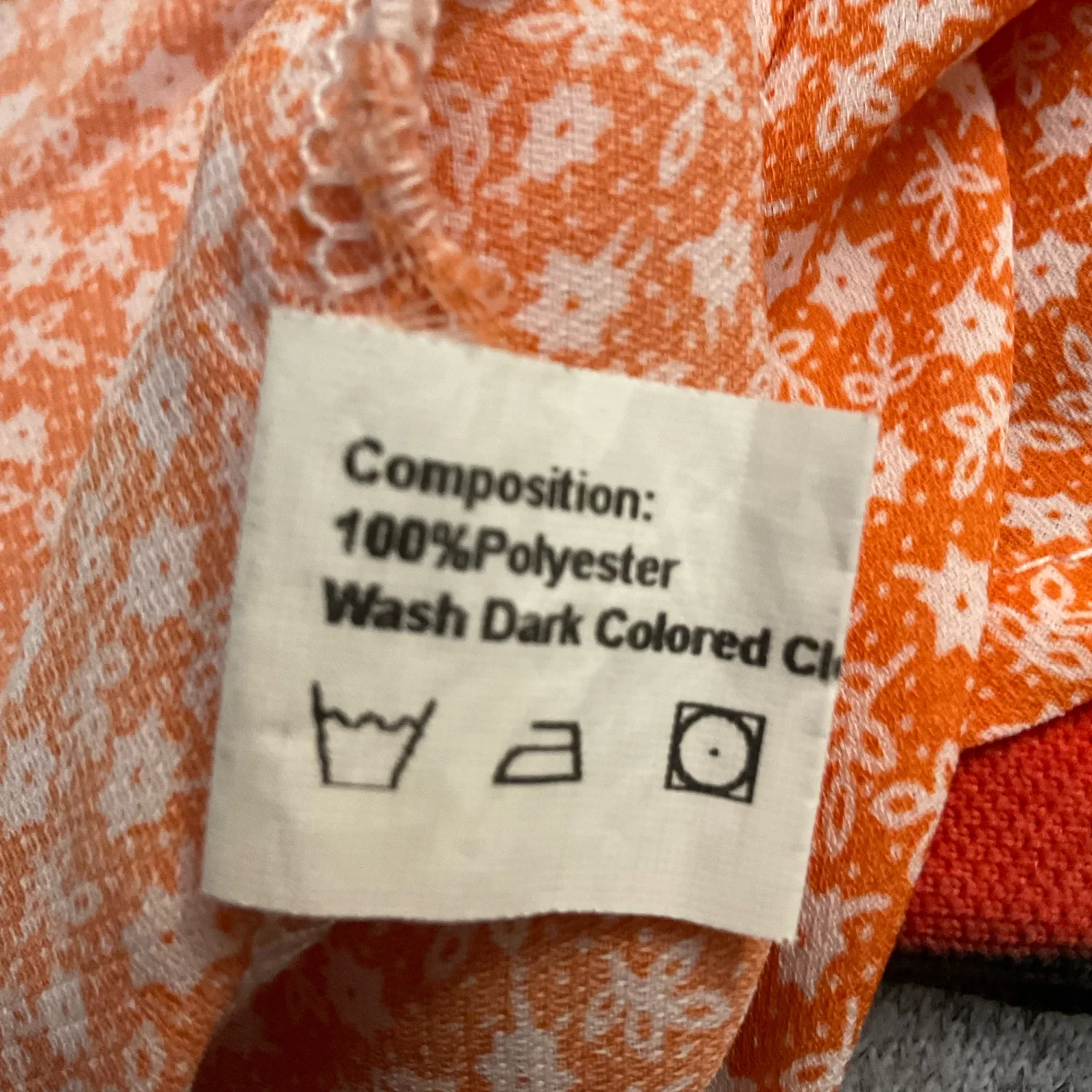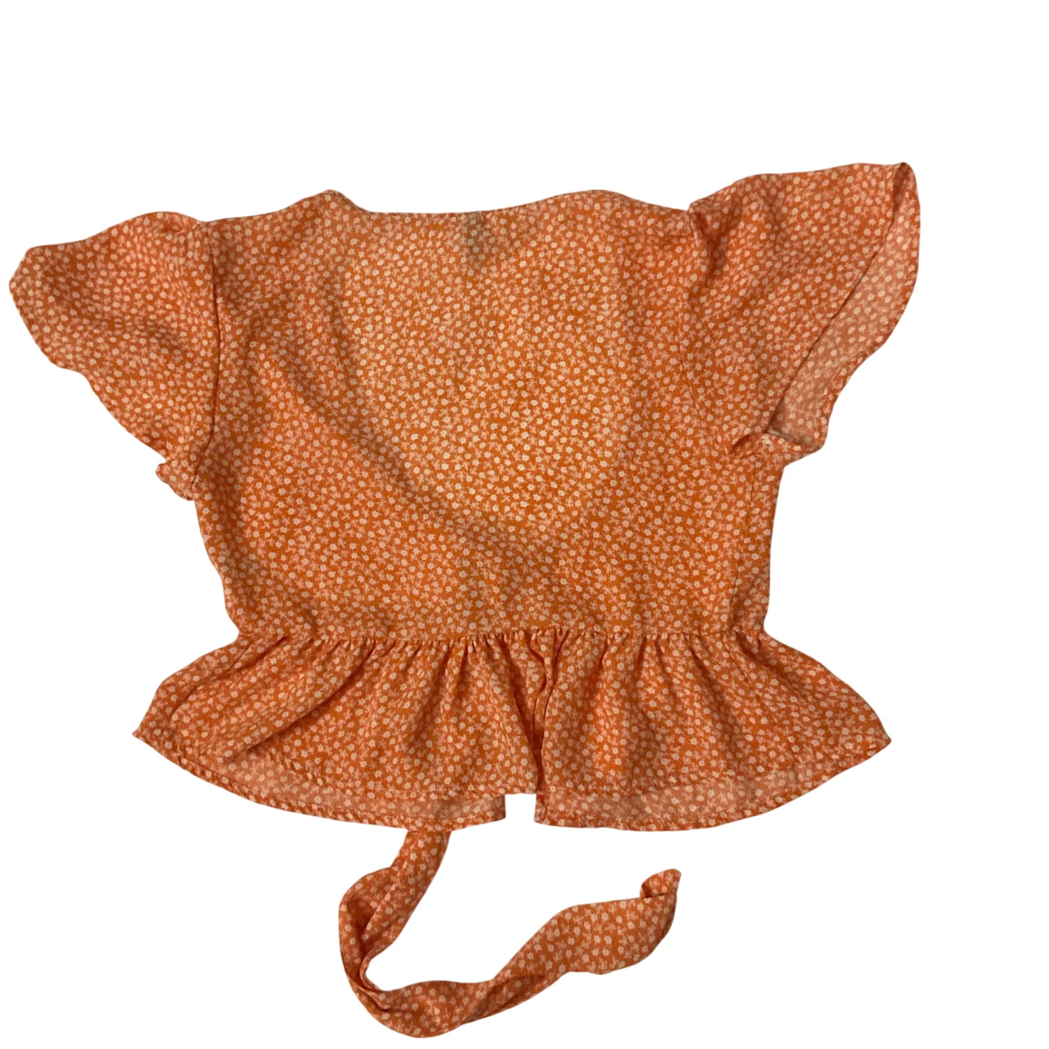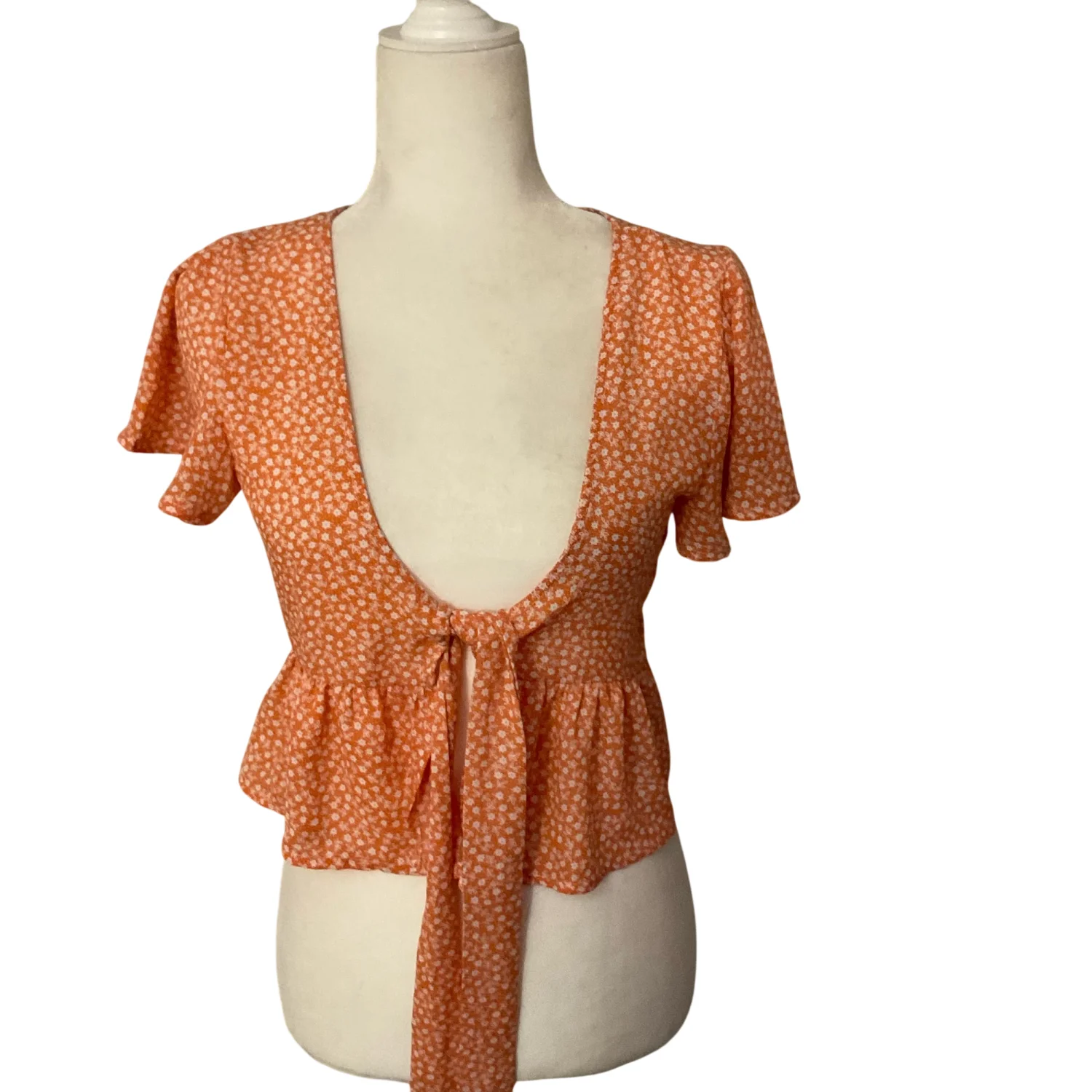 Style: Tie front, ruffled flutter sleeve blouse Color: Orange/ White Size: 4 Armpit: 15” Length: 18” Condition: Good 100% Polyester Machine wash