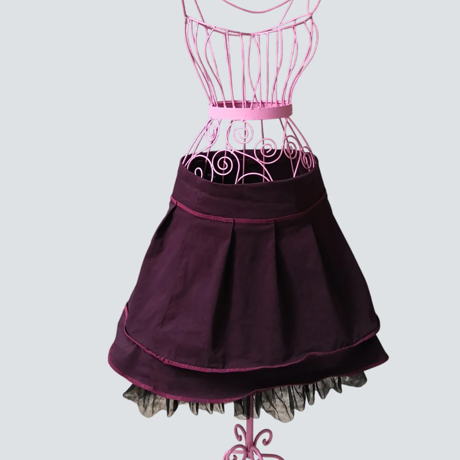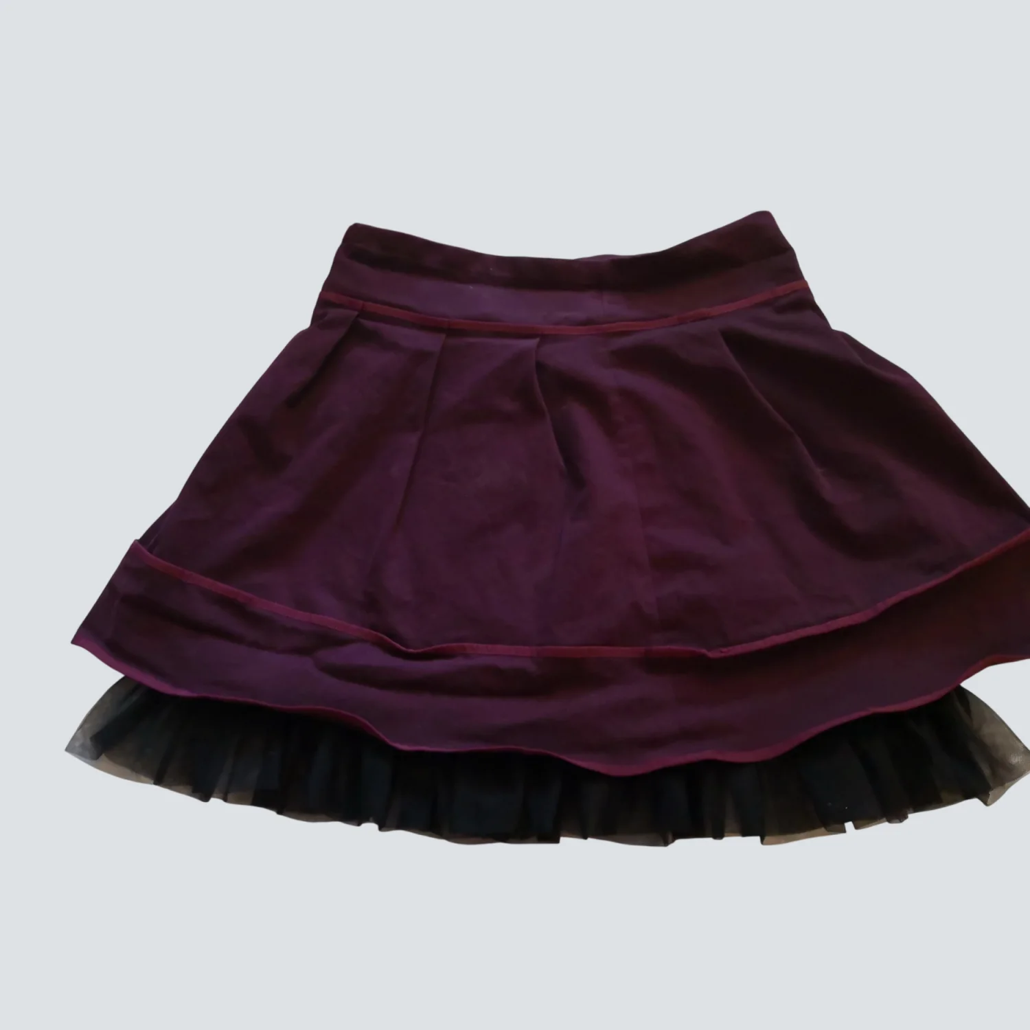 Style: A-line skirt with black tutu material coming out from the bottom. Color: Maroon Size: 13/14 Condiition: Good Waist: 15" Length: 18"