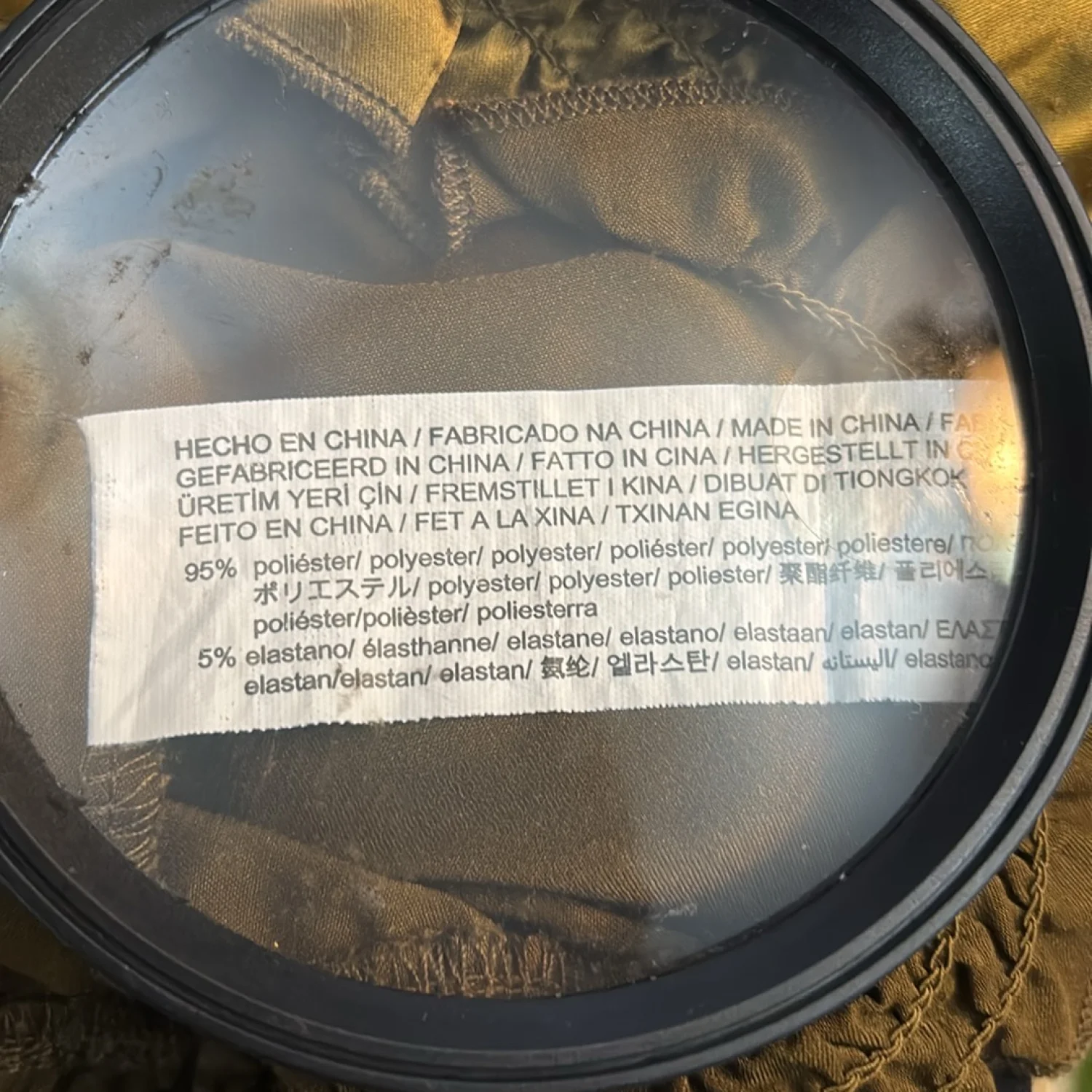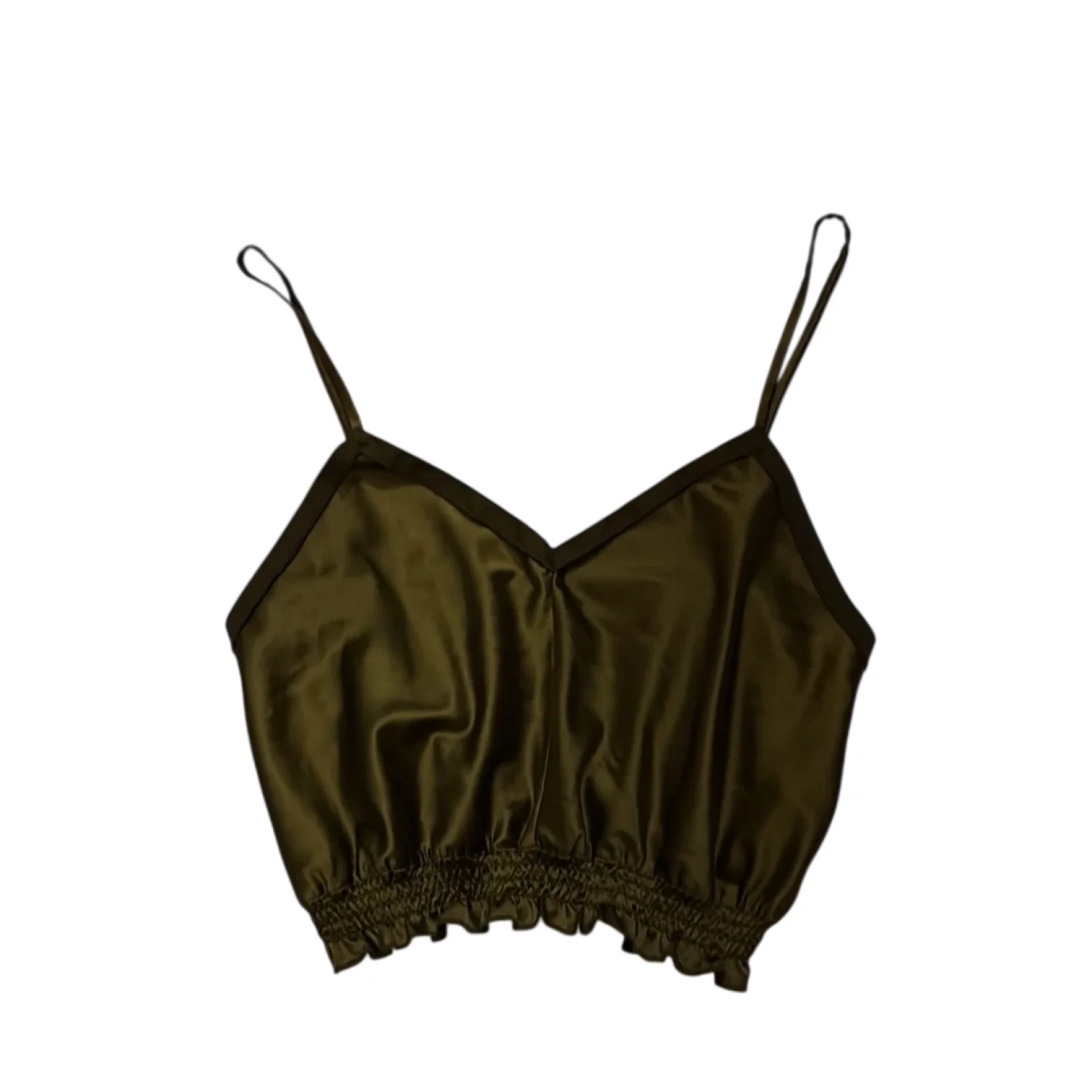 Style: Strappy crop top with smocked hemline Color: Bronze/Olive Green Size: M Armpit: 15” Length: 18” Condition: Good 95% Polyester 5% Elastane Machine wash