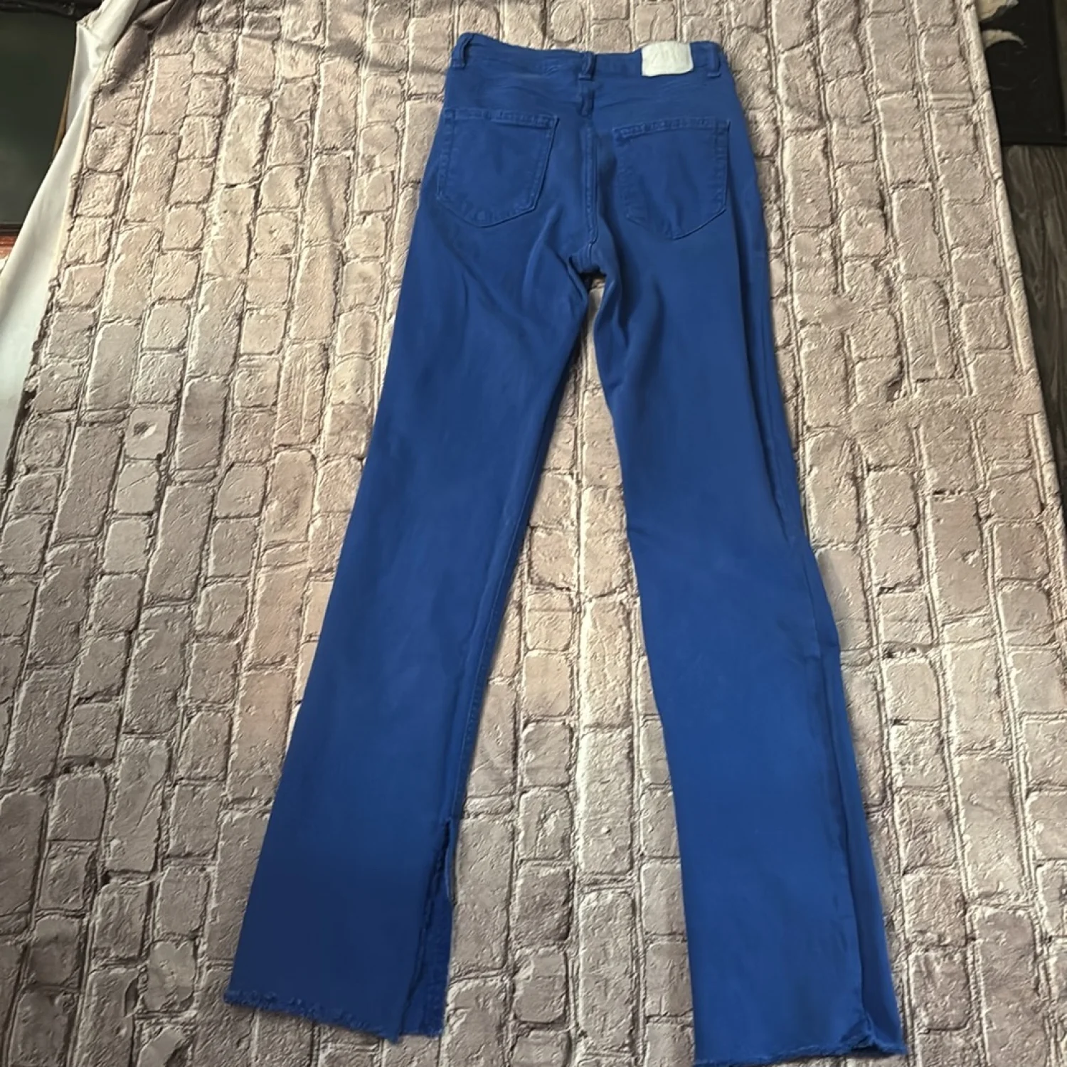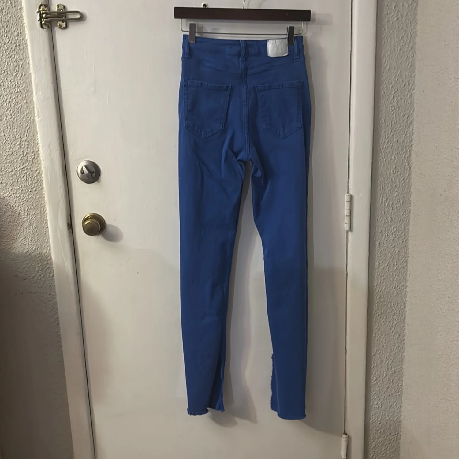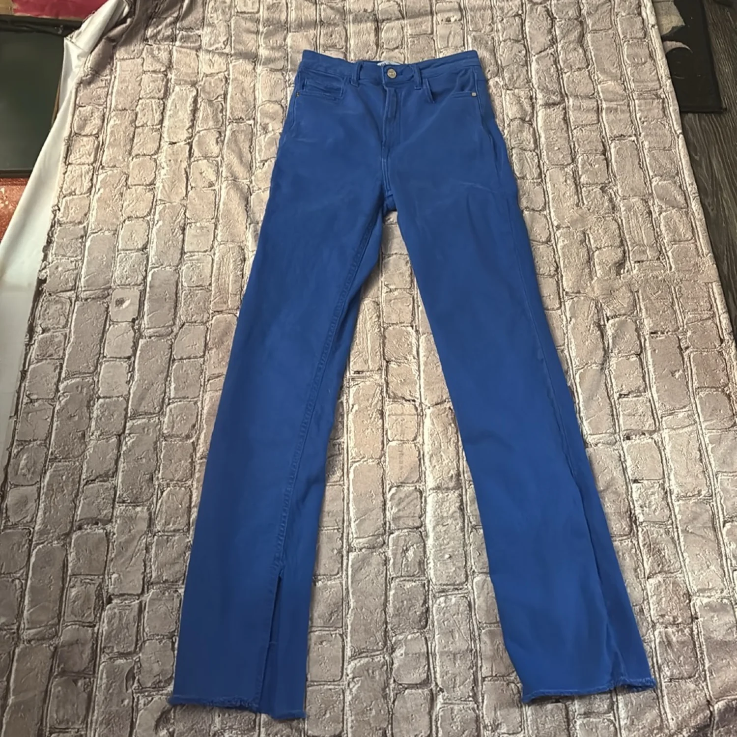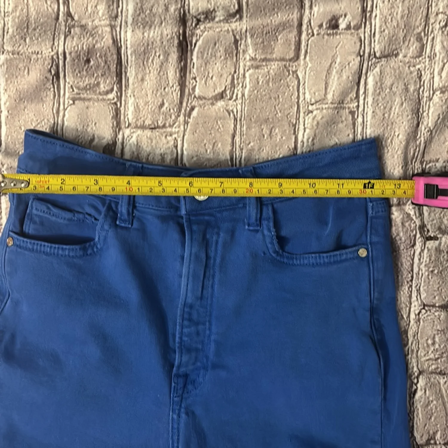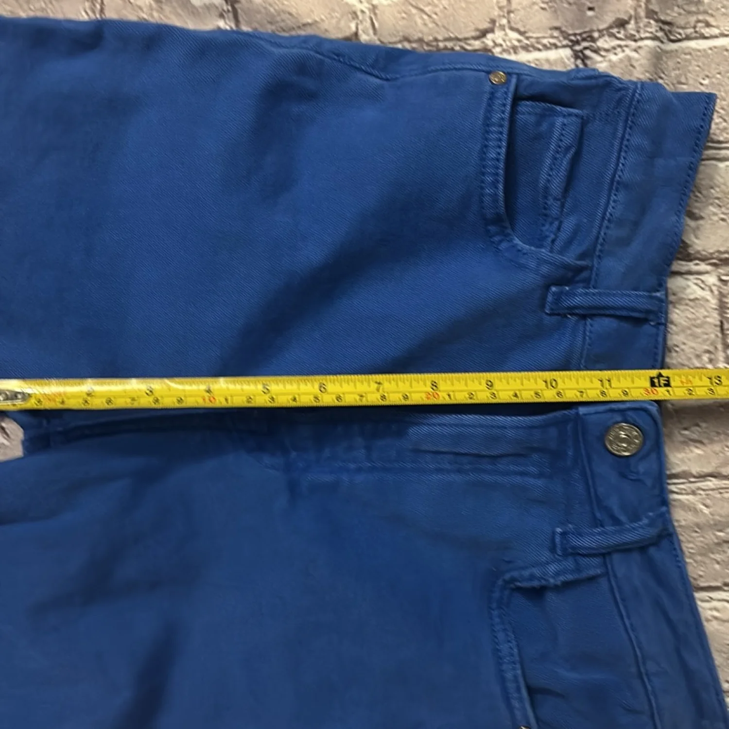 Style: 5 pocket straight leg high rise with raw frayed hems with slit. Leg opening 7" across. Color: Deep cobalt blue color. Size: 2 Waist: 13” Rise: 12” Length: 32” Good condition Fabric contents: 98% cotton/2% elastane. Machine wash cold