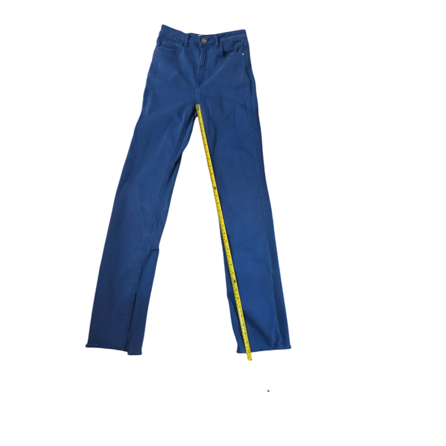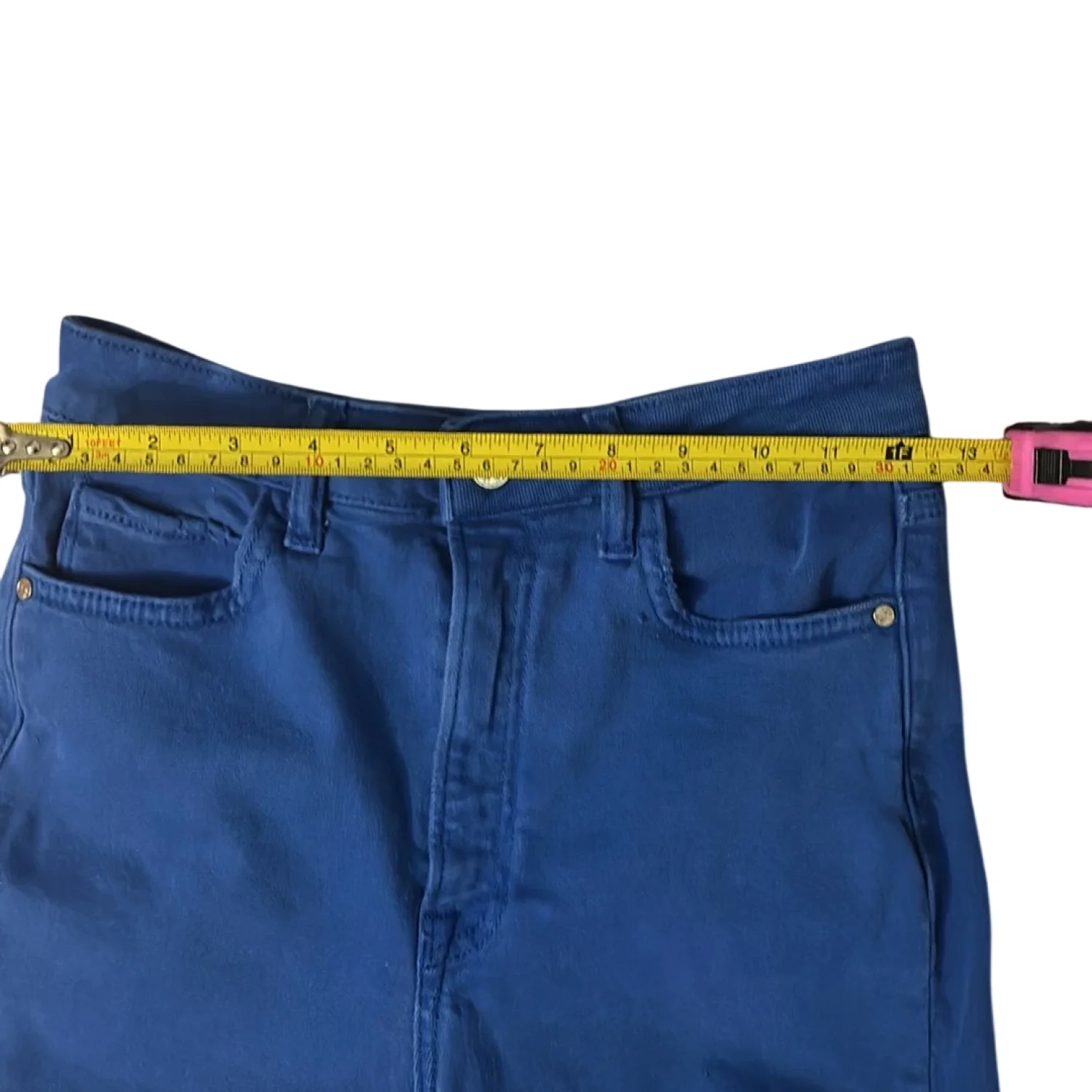 Style: 5 pocket straight leg high rise with raw frayed hems with slit. Leg opening 7" across. Color: Deep cobalt blue color. Size: 2 Waist: 13” Rise: 12” Length: 32” Good condition Fabric contents: 98% cotton/2% elastane. Machine wash cold