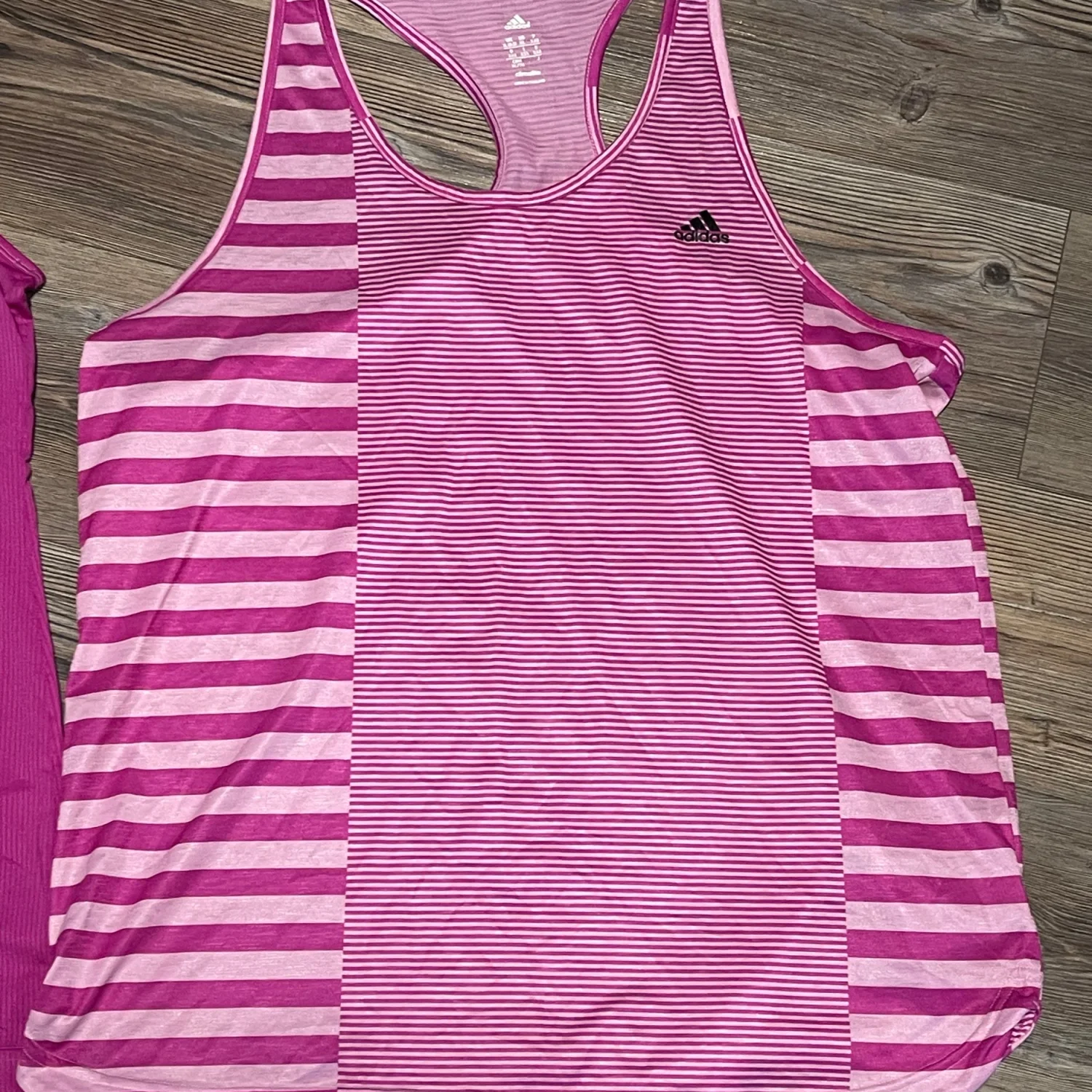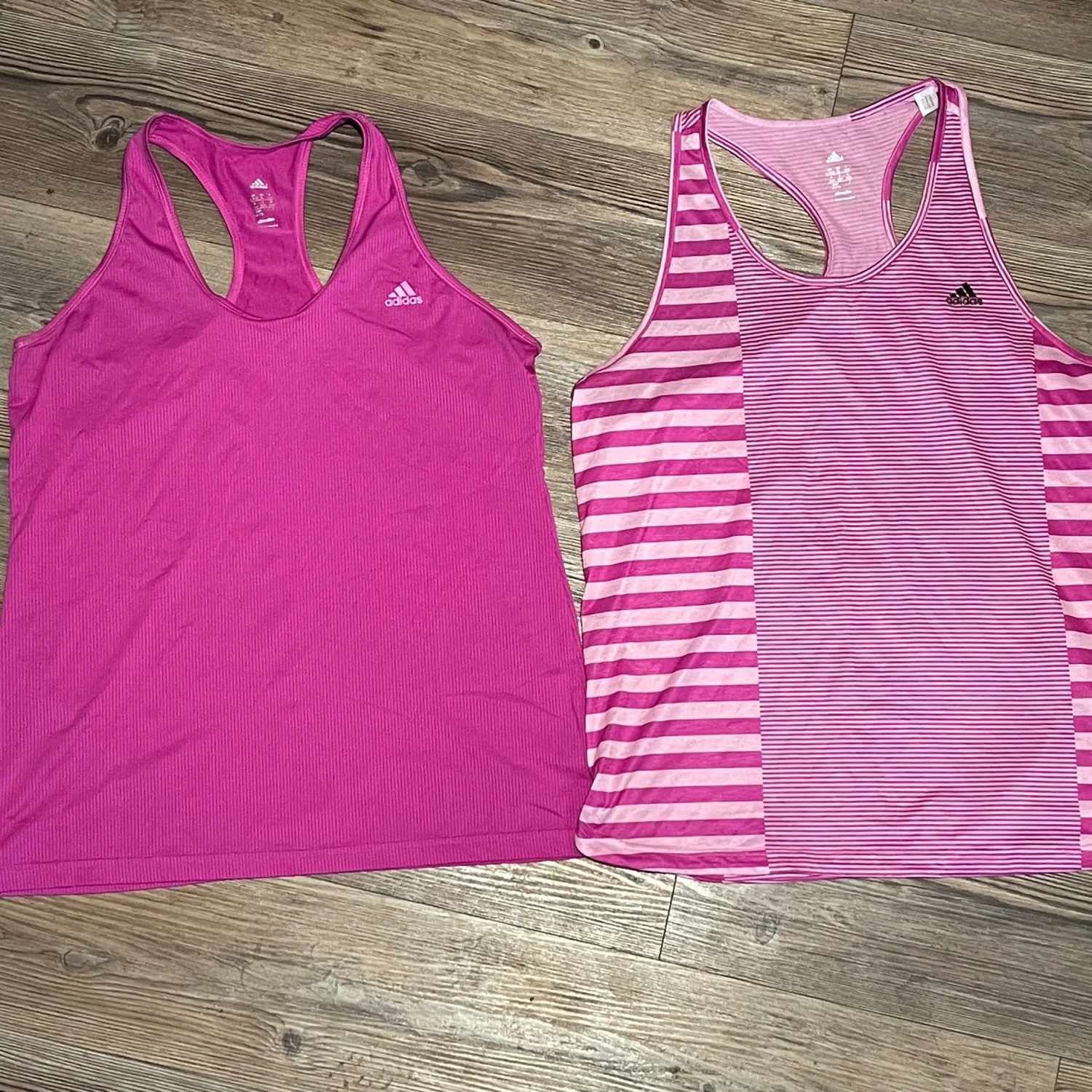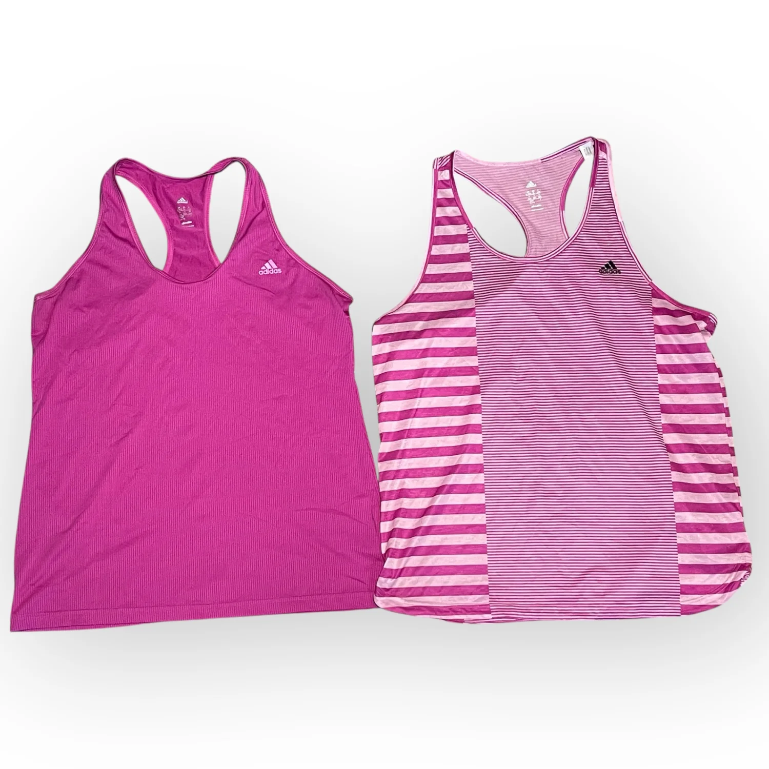 The bundle includes one solid magenta/purple tank and one coordinating pink striped tank, both offering a lightweight, breathable feel. With a relaxed fit and athletic silhouette, these are perfect for running, yoga, gym sessions, or as stylish athleisure base layers. • Brand: Adidas • Technology: Climalite (Moisture-Wicking) • Size: Women’s XL • Quantity: Bundle of 2 • Colors: Purple / Magenta and Pink Stripe • Condition: Very Good Used Condition (VGUC). Both tops have been well-cared for with no major flaws. #Adidas #AdidasClimalite #WorkoutTanks #Activewear #SizeXL #RacerbackTank #GymClothes #FitnessApparel #Athleisure #MoistureWicking #RunningGear #YogaTop #PurpleActivewear #AdidasWomen #VGUC Measurements for both shirts are approximate lying flat: Chest 20” Length 28”
