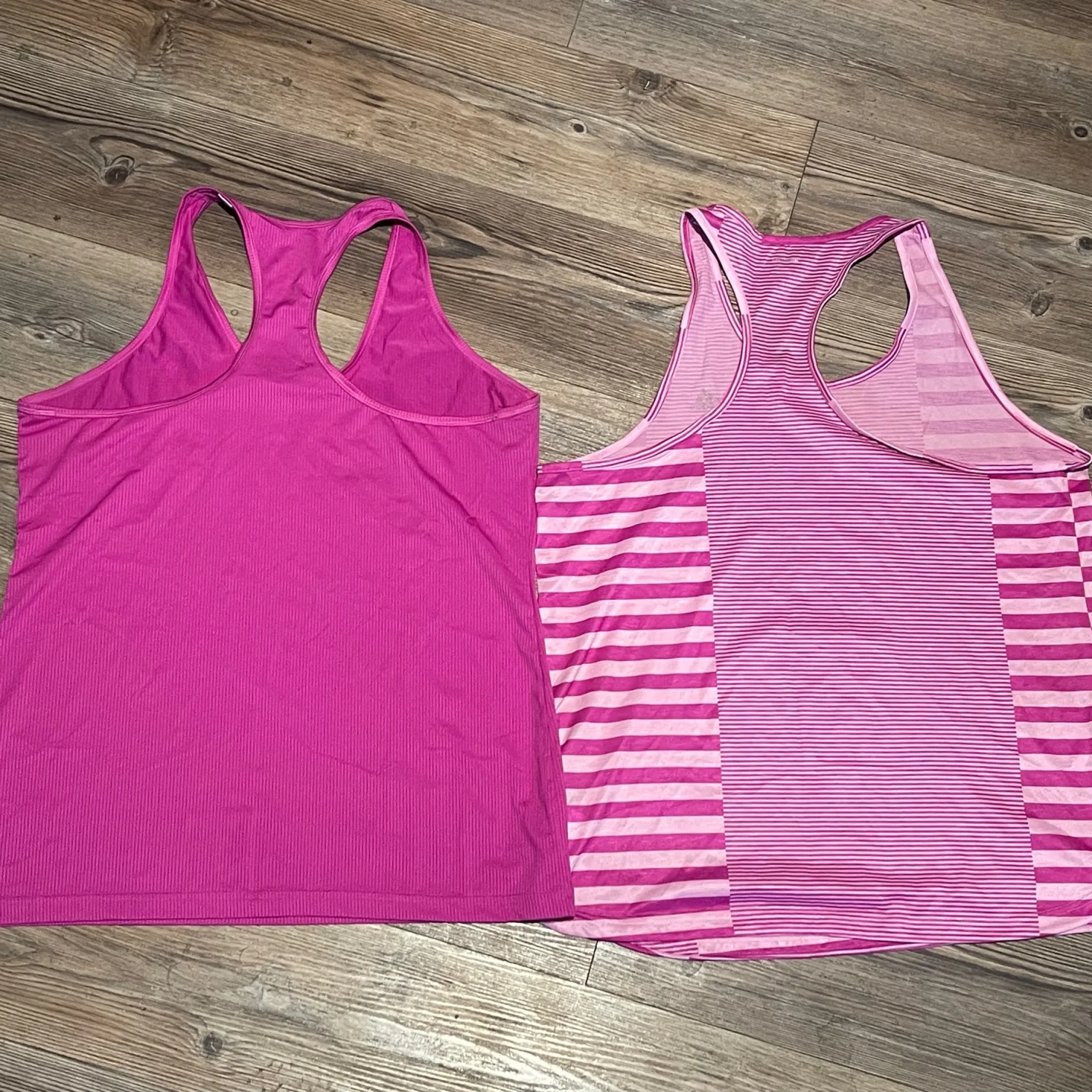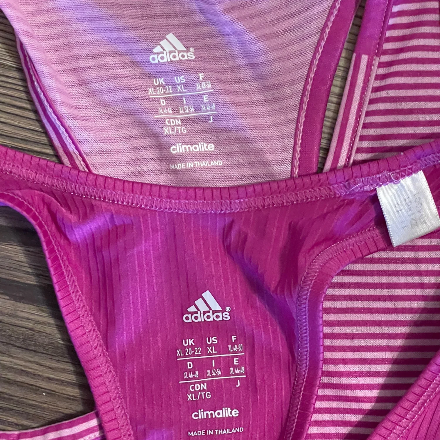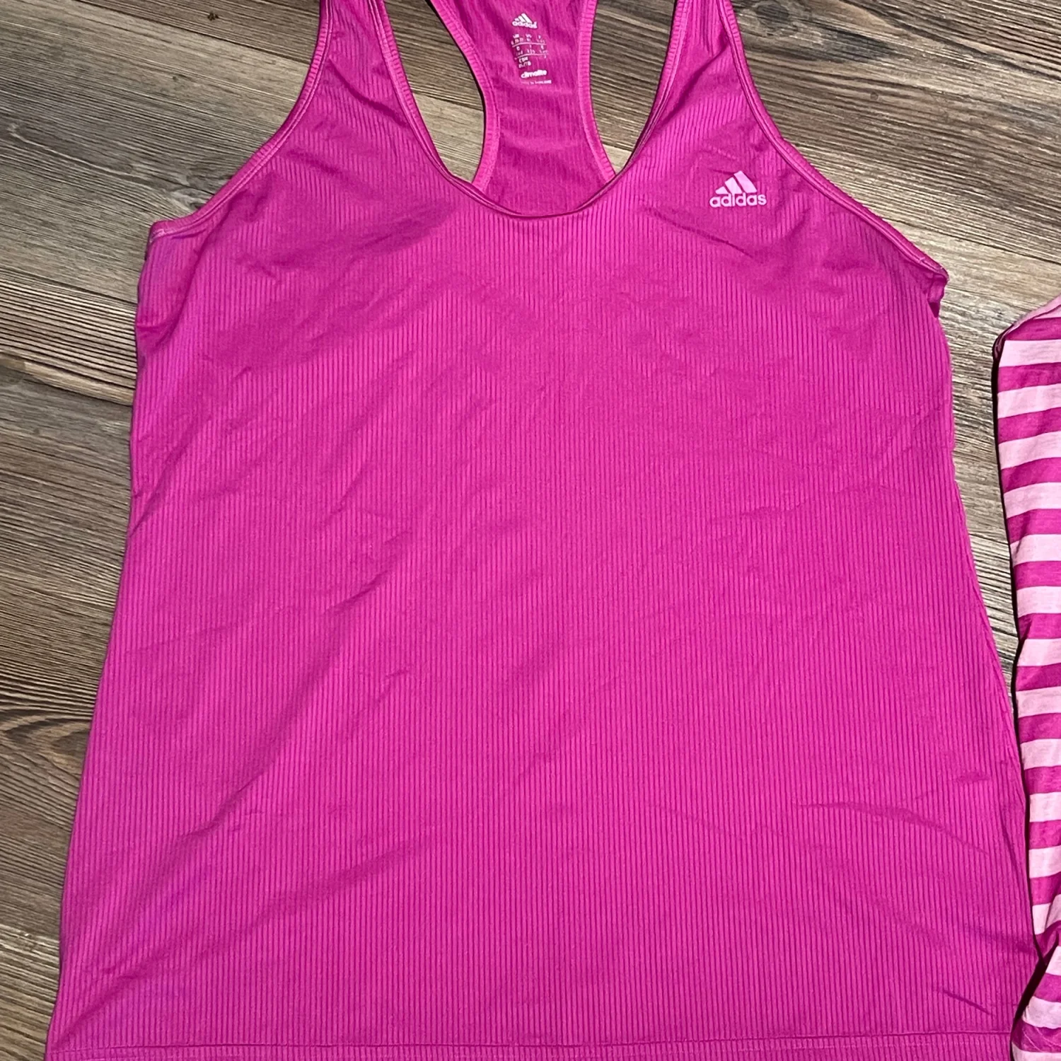 The bundle includes one solid magenta/purple tank and one coordinating pink striped tank, both offering a lightweight, breathable feel. With a relaxed fit and athletic silhouette, these are perfect for running, yoga, gym sessions, or as stylish athleisure base layers. • Brand: Adidas • Technology: Climalite (Moisture-Wicking) • Size: Women’s XL • Quantity: Bundle of 2 • Colors: Purple / Magenta and Pink Stripe • Condition: Very Good Used Condition (VGUC). Both tops have been well-cared for with no major flaws. #Adidas #AdidasClimalite #WorkoutTanks #Activewear #SizeXL #RacerbackTank #GymClothes #FitnessApparel #Athleisure #MoistureWicking #RunningGear #YogaTop #PurpleActivewear #AdidasWomen #VGUC Measurements for both shirts are approximate lying flat: Chest 20” Length 28”
