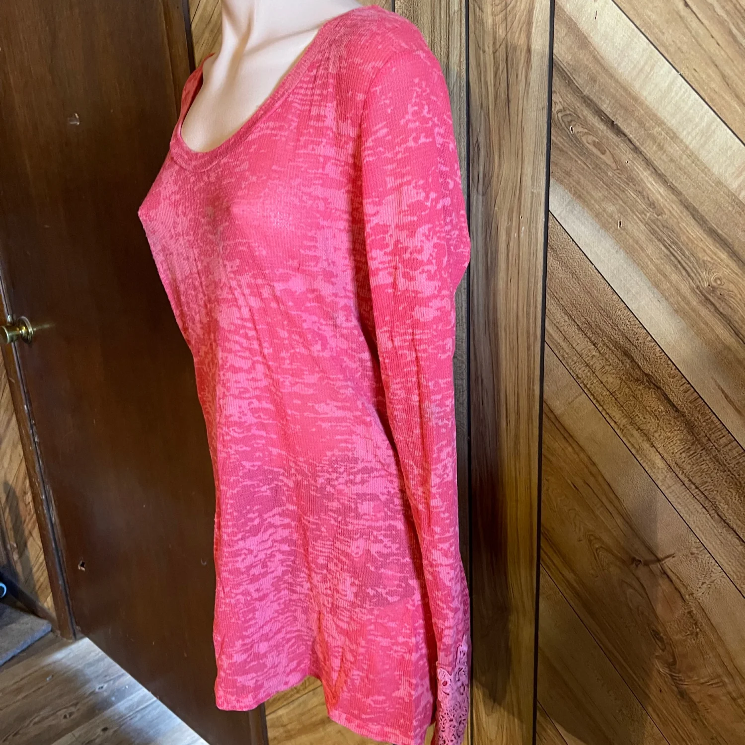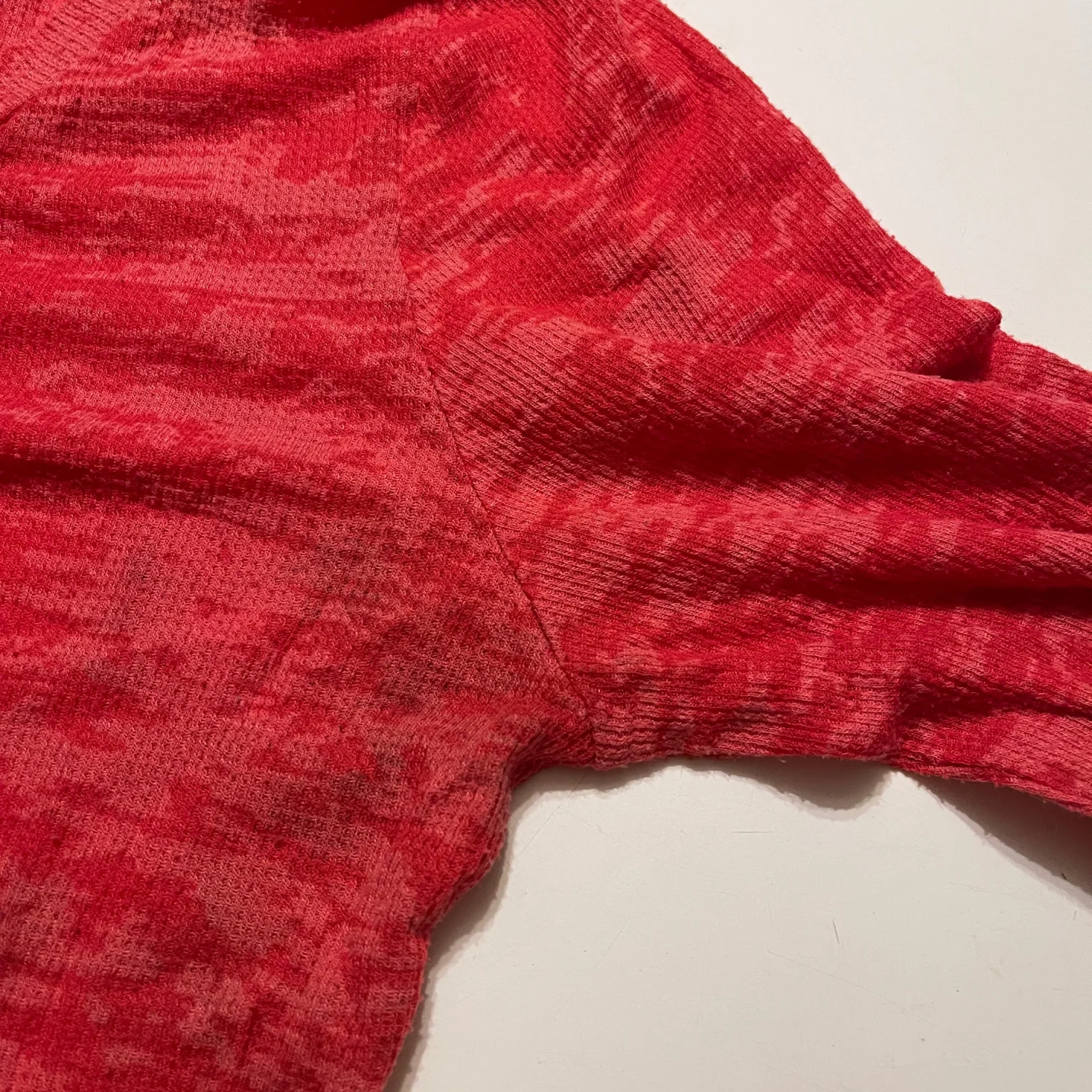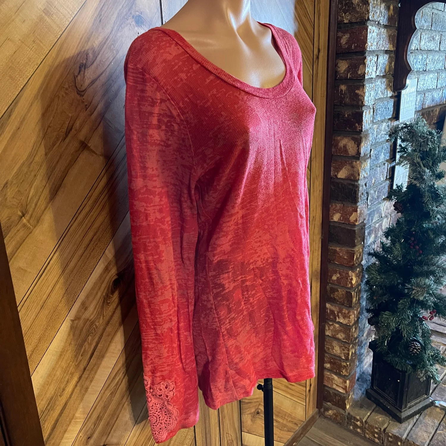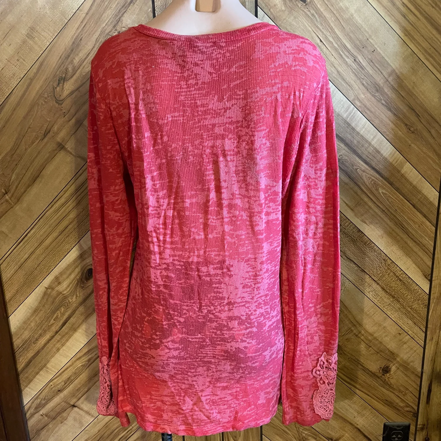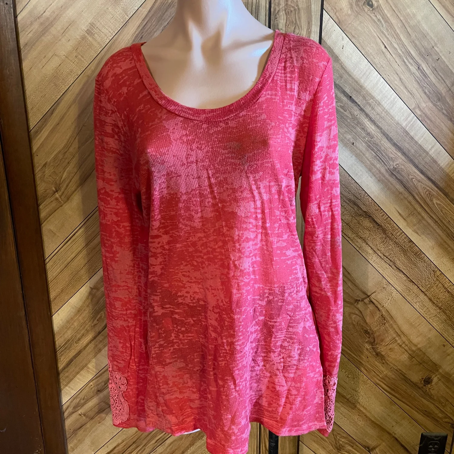 The relaxed, eased fit and scoop neckline make it an effortless choice for layering or wearing on its own. Whether you're heading to a bonfire or just running errands, this boutique-style knit offers both comfort and a unique, feminine aesthetic. • Condition: Good Used Condition (GUC) — please note some light underarm discoloration (priced accordingly). • Size: XL • Material: Soft, stretchy waffle knit (thermal texture). • Color: Red / Coral Heather. • Features: Embroidered sleeves, lace cuff trim, waffle knit fabric, eased fit. #BKE #BuckleStyle #WaffleKnit #EmbroideredSleeves #BohoWestern #ThermalTop #SizeXL #RedKnit #CasualChic #BoutiqueFashion #FallStyle #LayeringPiece #GUC #ResaleFashion Measurements are approximate lying flat: Chest 19” Length 29”