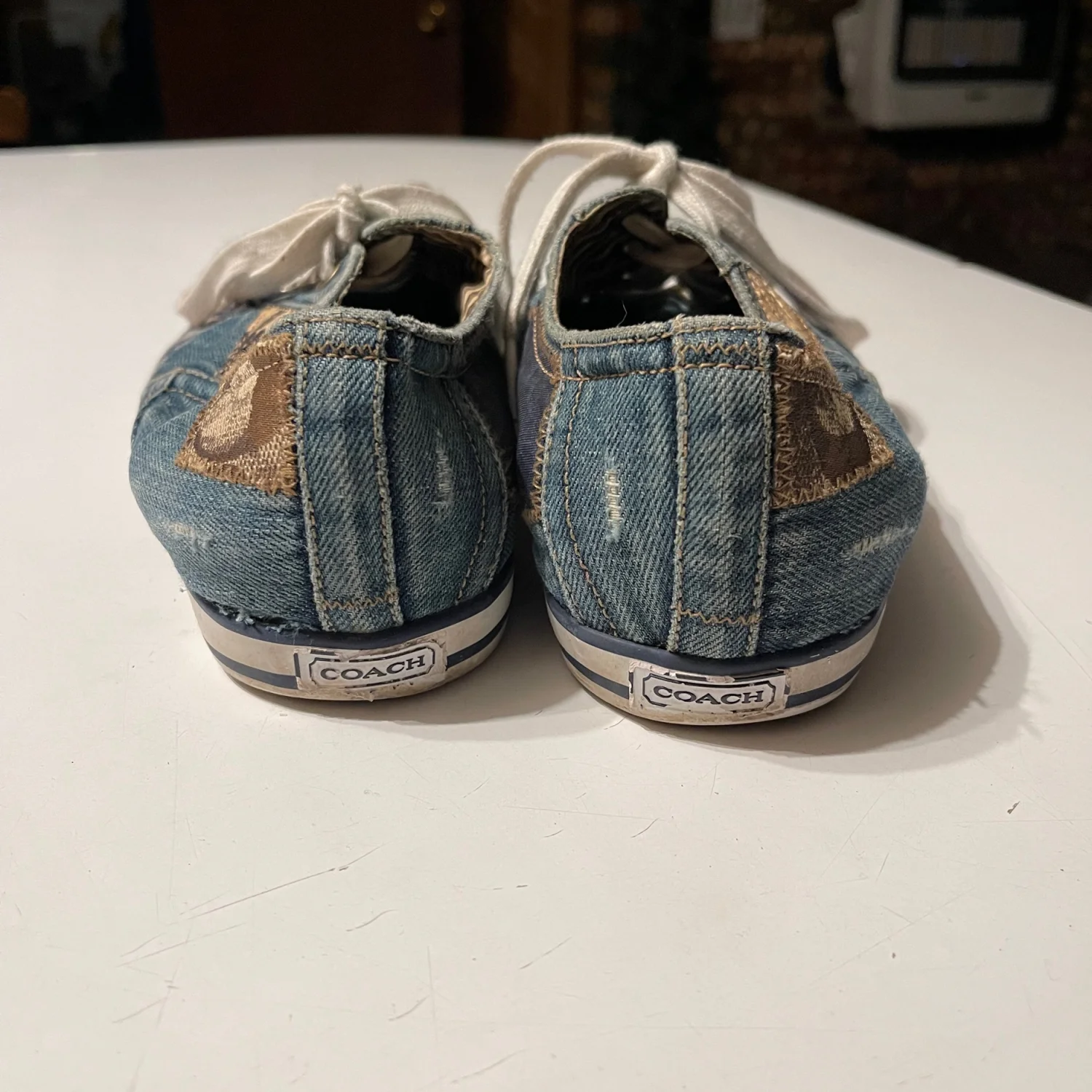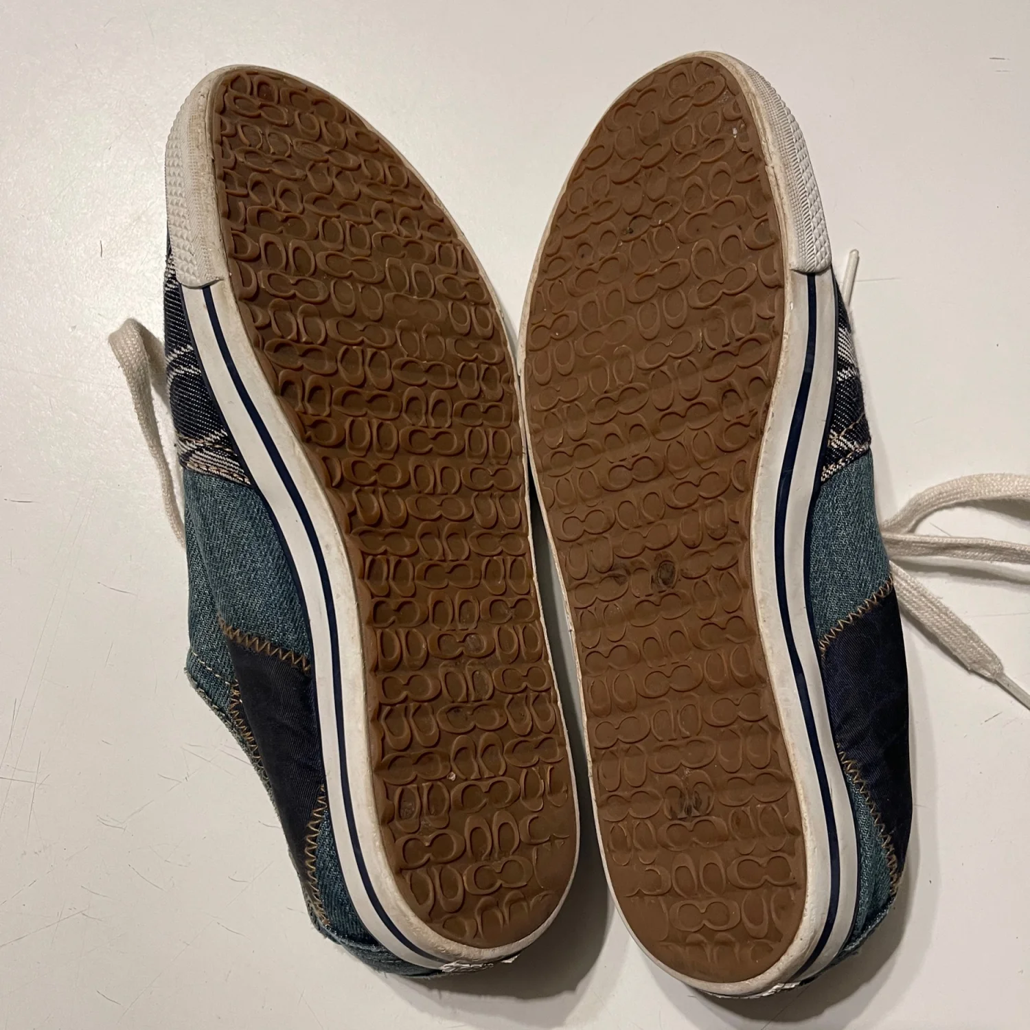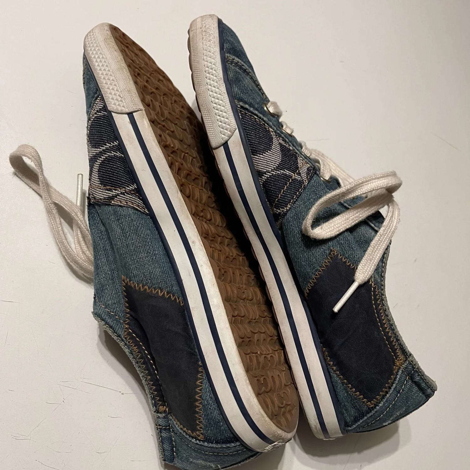 Crafted with a comfortable fabric lining and a durable rubber outsole, these sneakers offer lightweight support and a stylish "it-girl" aesthetic. Pair them with your favorite jeans for a denim-on-denim vibe or with a sundress for a boho-chic look. • Brand: Coach Leatherworks • Model: Tonya Patchwork Sneakers • Size: Women’s 9.5 • Color: Blue Denim Tonal Patchwork • Condition: Very Good Used Condition (VGUC). • Notes: There is some light discoloration on the left shoestring, which can easily be replaced or cleaned. The denim uppers and soles are in great shape with lots of life left! #Coach #CoachSneakers #DenimPatchwork #Y2KStyle #BohoChic #SignatureDenim #VintageCoach #Size9.5 #DenimSneakers #Americana #CasualChic #PatchworkShoes #Streetwear #DesignerSneakers #LowTopSneakers