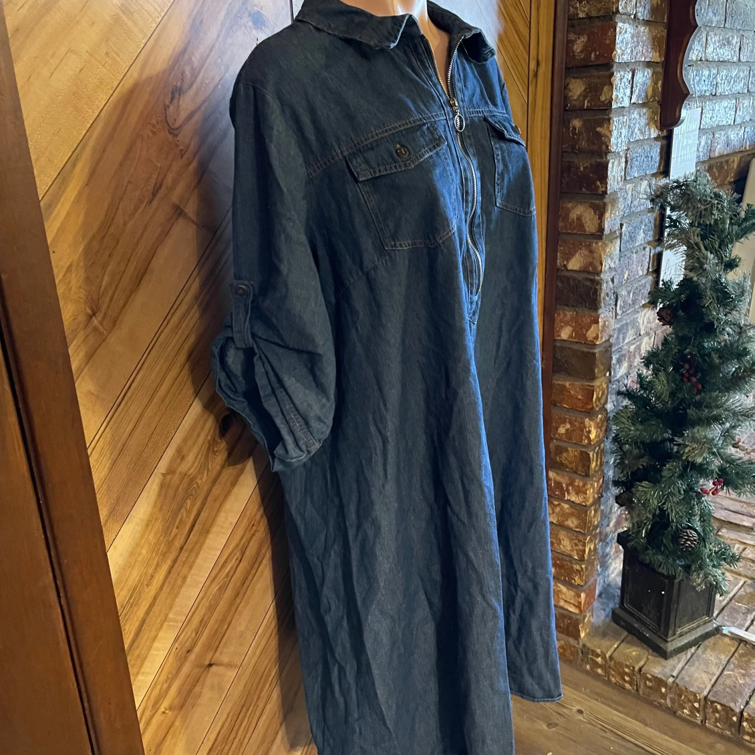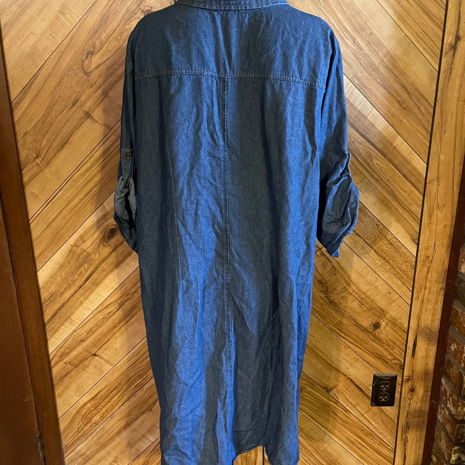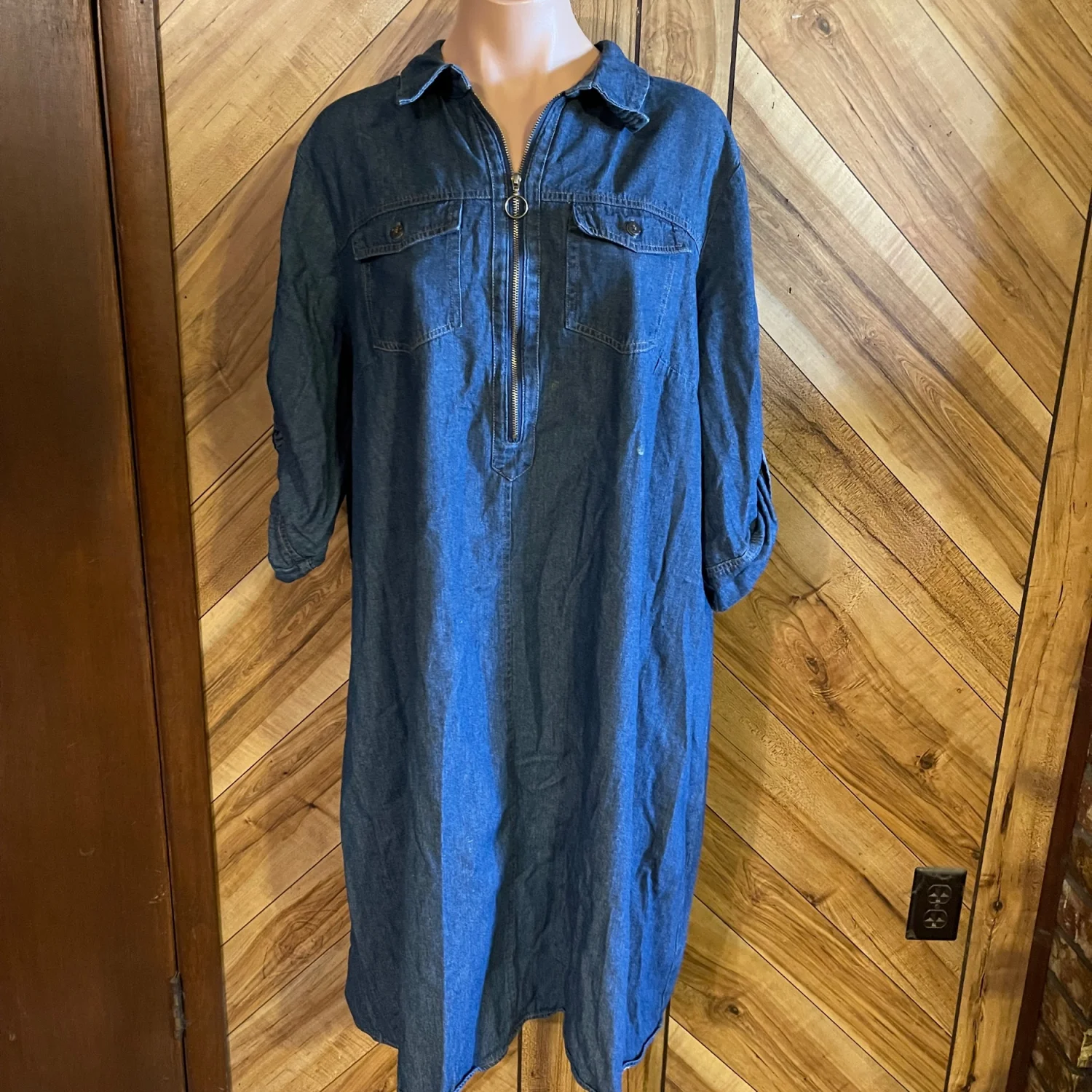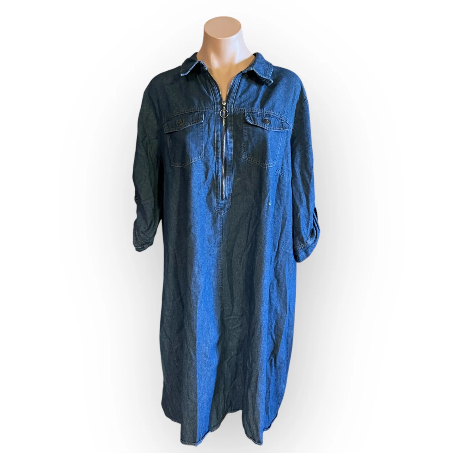 Featuring comfortable 3/4 length sleeves and a relaxed, flowy silhouette, this dress is crafted from a soft denim-style fabric that drapes beautifully. Its classic blue wash makes it easy to pair with leggings, boots, or sneakers for a boho-chic or casual weekend look. • Condition: Very Good Used Condition (VGUC) — please note a small, barely noticeable spot (appears to be paint) on the chest area, as shown in photos. • Size: Plus Size 2X. • Color: Medium Blue Denim. • Material: Soft, lightweight denim / lyocell blend. • Features: 3/4 sleeves, knee-length hem, split neck or button detailing, relaxed shift fit. #JGee #PlusSizeFashion #Size2X #DenimDress #TunicDress #BohoChic #CasualStyle #KneeLengthDress #BlueDenim #WorkToWeekend #CurvyFashion #VGUC #ResaleFashion Measurements are approximate lying flat: Chest 24” Length 40”
