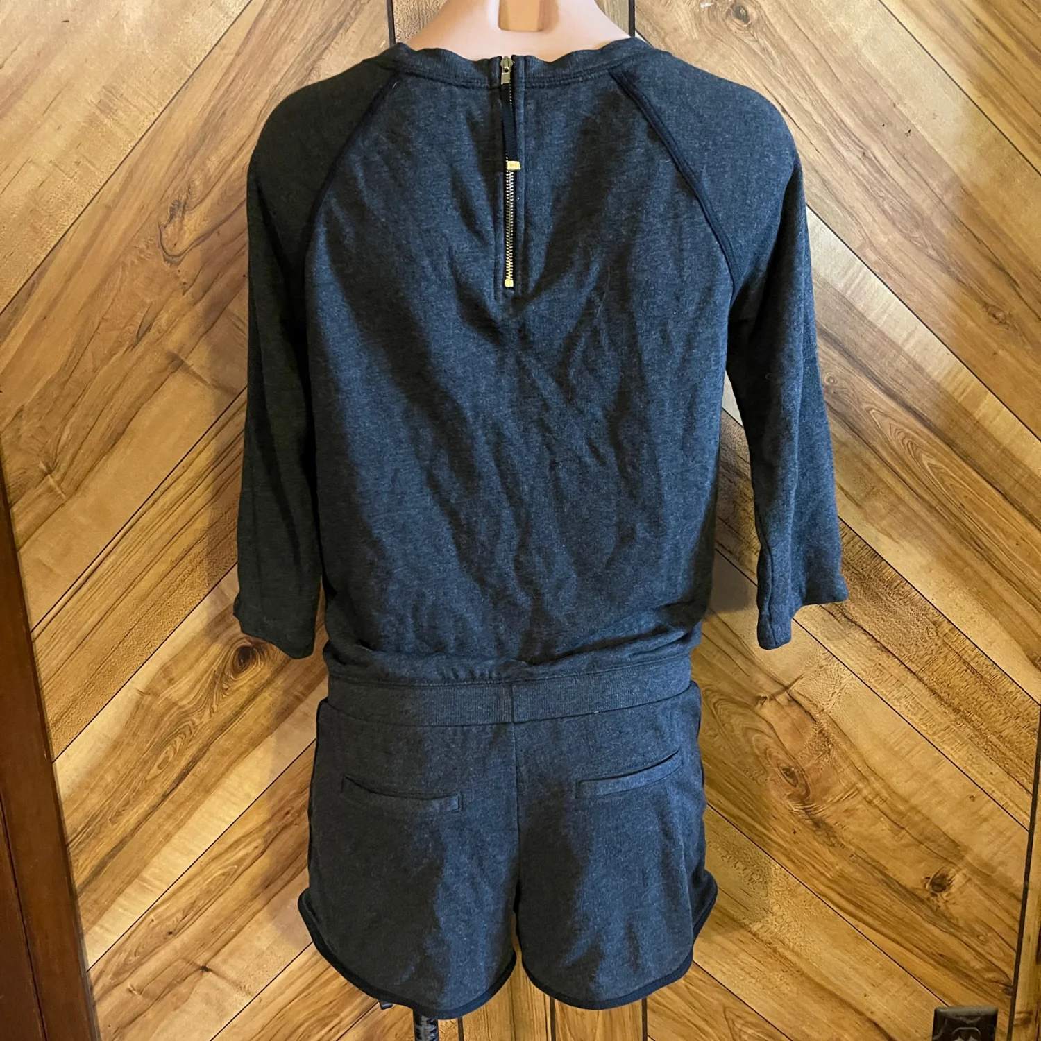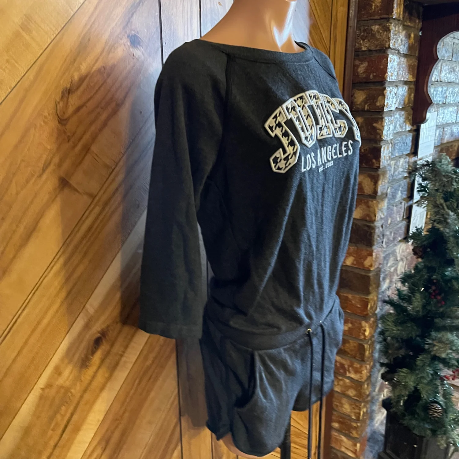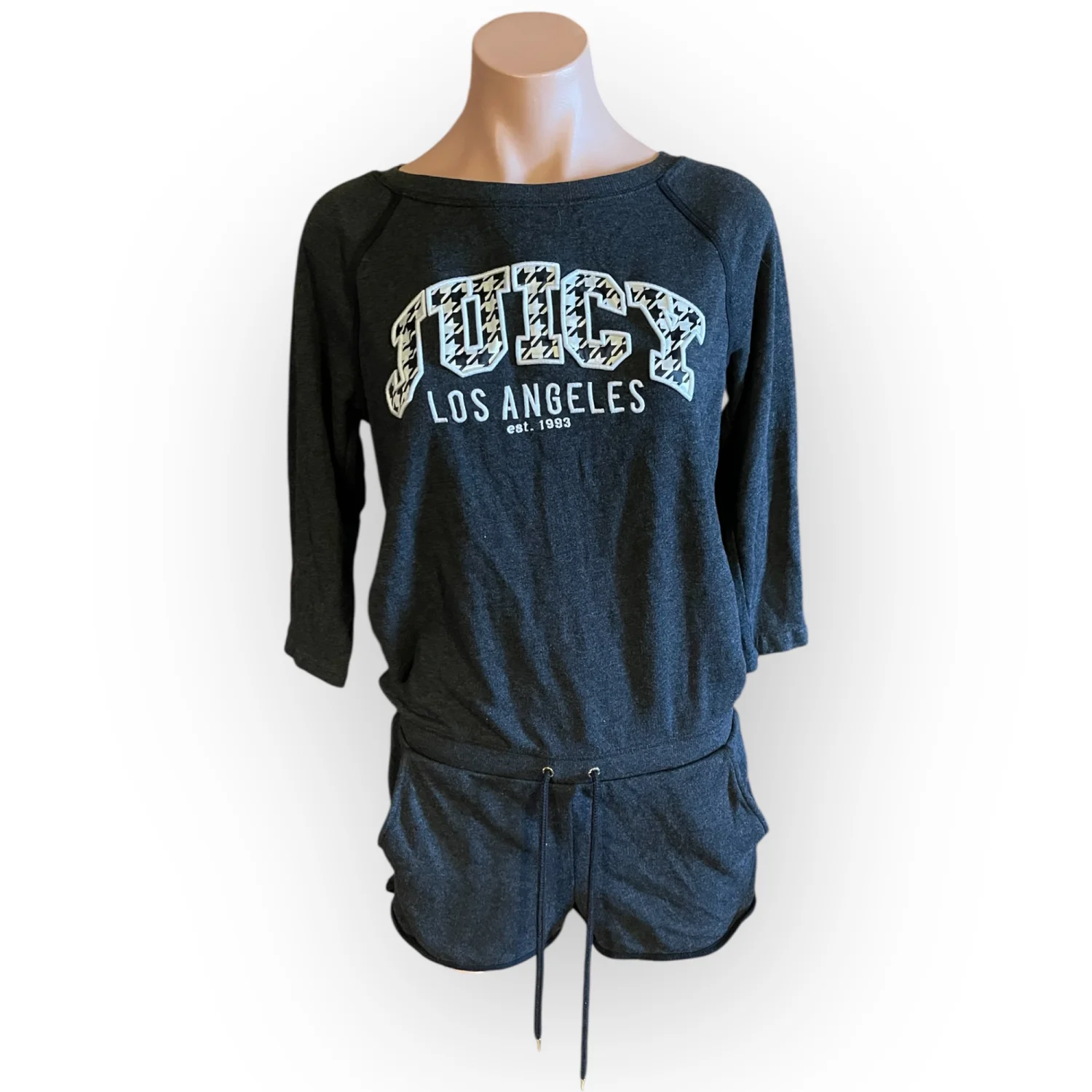 Crafted from a soft, high-quality cotton blend fabric, it features 3/4 length sleeves, a relaxed scoop neckline, and a flattering drawstring waist to customize your fit. Perfect for running errands, a cozy airport outfit, or elevated lounging. • Condition: Very Good Used Condition (VGUC) • Size: Women's Small • Color: Charcoal / Dark Heather Gray • Features: Front pockets, adjustable drawstring, graphic logo hit #JuicyCouture #Y2KFashion #JuicyCoutureRomper #LoungeWear #CharcoalGray #Houndstooth #Streetwear #Athleisure #CozyCore #RetroFashion #Small #OnePiece #Jumpsuit #VGUC #PoshmarkSeller Measurements are approximate lying flat: Chest 17” Inseam 3” Total length 31”