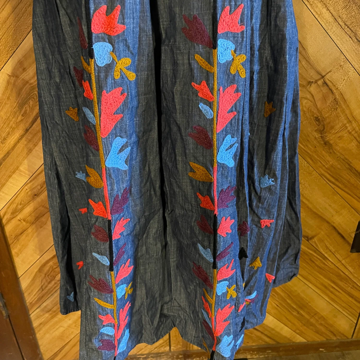 Crafted from a soft, breathable cotton denim, this knee-length dress features a flattering V-neckline and a relaxed, flowy silhouette that is perfect for summer garden parties, brunch, or casual weekend wear. • Condition: Excellent Used Condition (EUC) • Size: Large (L) • Color: Medium Blue Denim with multi-color embroidery • Features: Sleeveless, V-neck, intricate embroidery, high-quality construction • Style: Bohemian, Folk, Eclectic, Artsy, Summer Denim #WaywardFancies #eShakti #EmbroideredDress #DenimDress #SizeLarge #BohoChic #MaximalistFashion #SleevelessDress #FloralEmbroidery #SummerFashion #ArtsyStyle #EUC #ResaleFashion Measurements are approximate lying flat: Chest 20” Length 39”