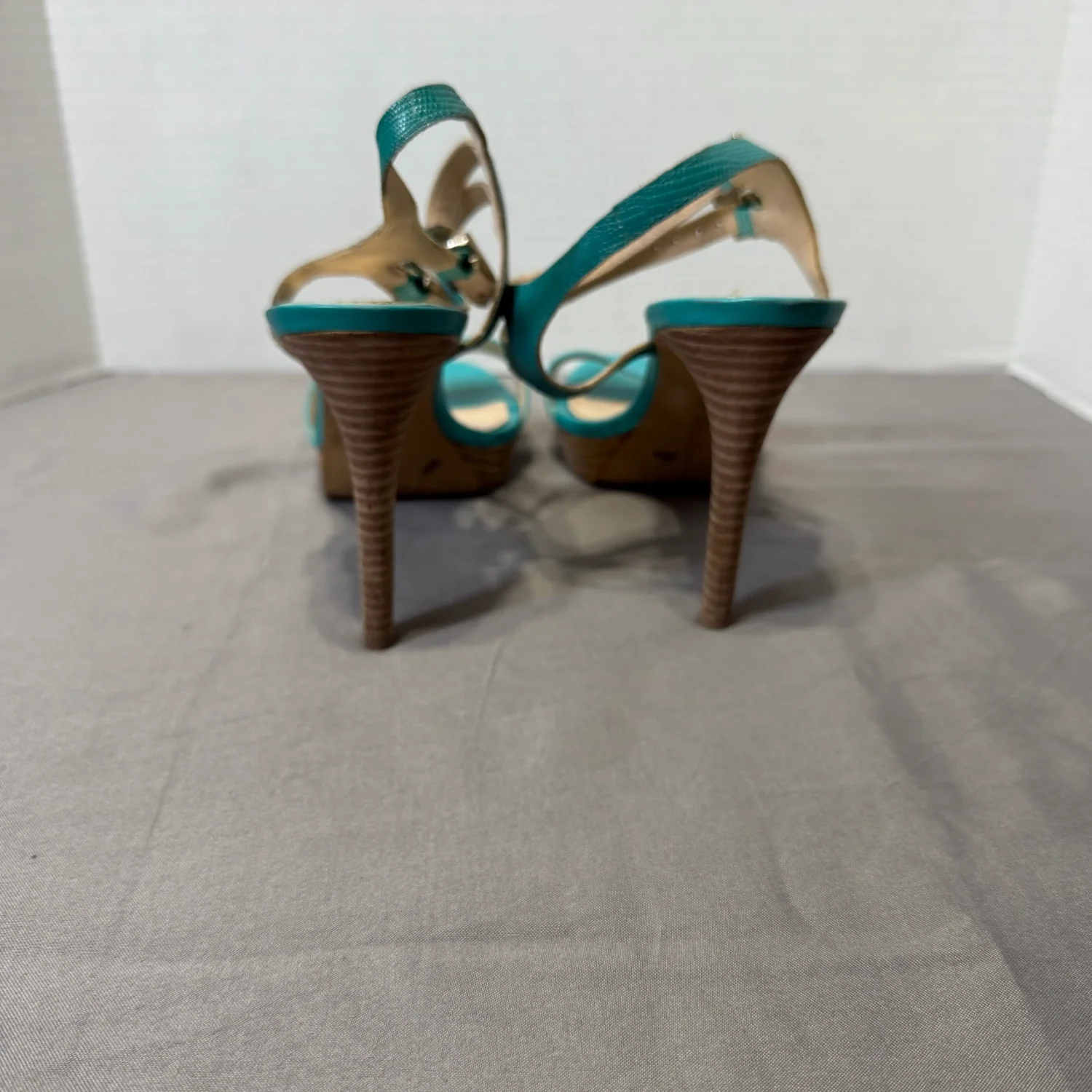 Vince Camuto 4" heel; 1" platform Adjustable ankle straps with buckle closure. Leather upper/synthetic lining/leather sole.