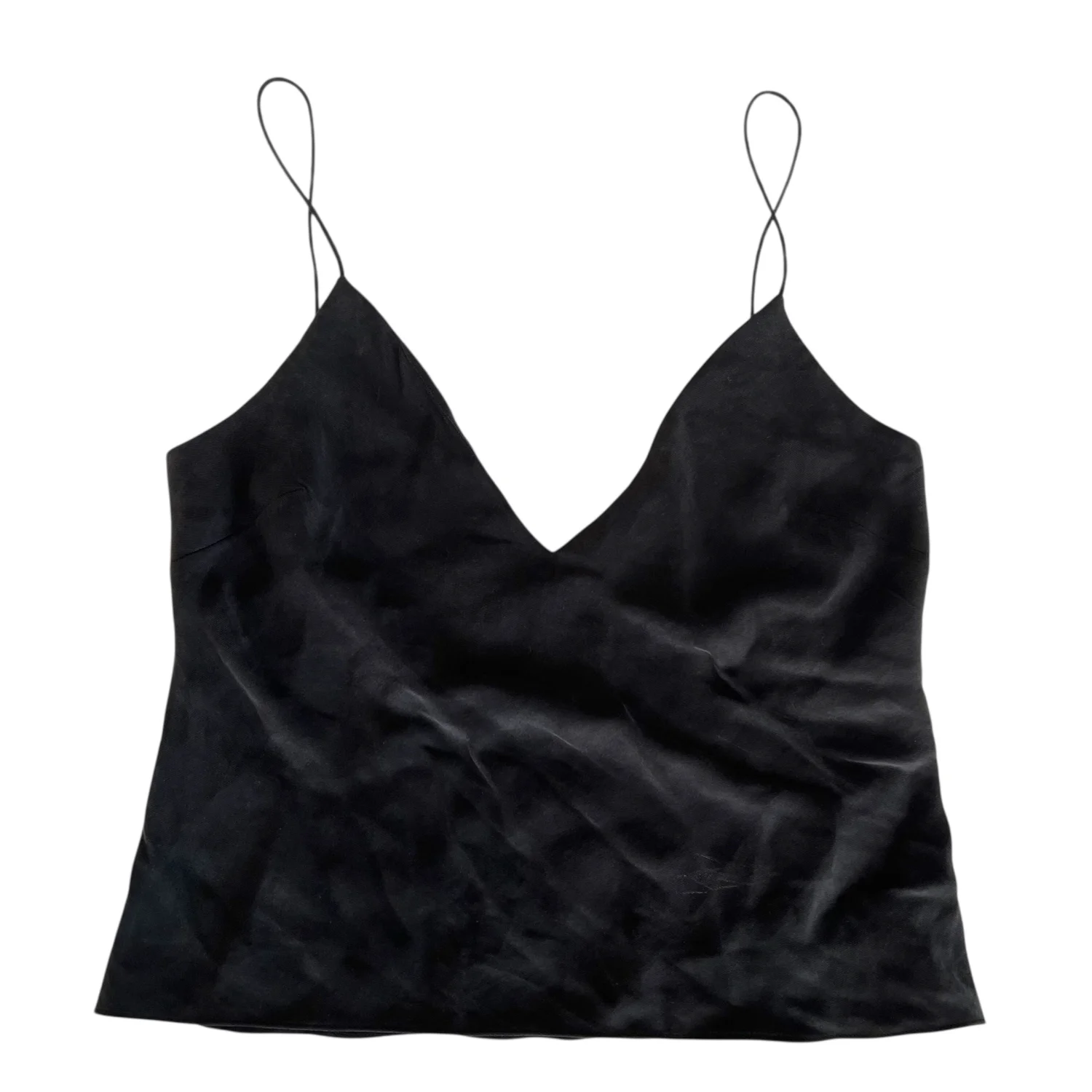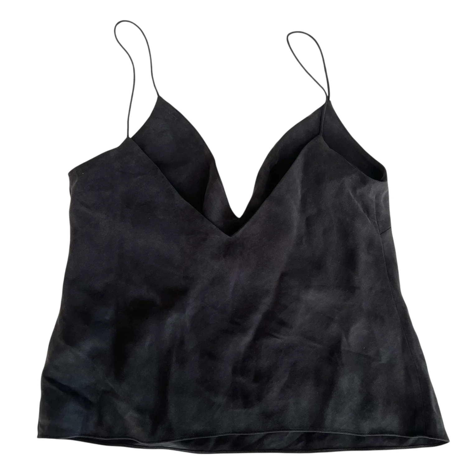 A black camisole with a V-neckline. The camisole is made of soft, smooth fabric and has a lightweight feel. It has a sleek and elegant design, with a fitted silhouette that hugs the body. A slight marking that is pictured, but it might come out pretty easily. First pic is the front view. 4th pic is the back view.