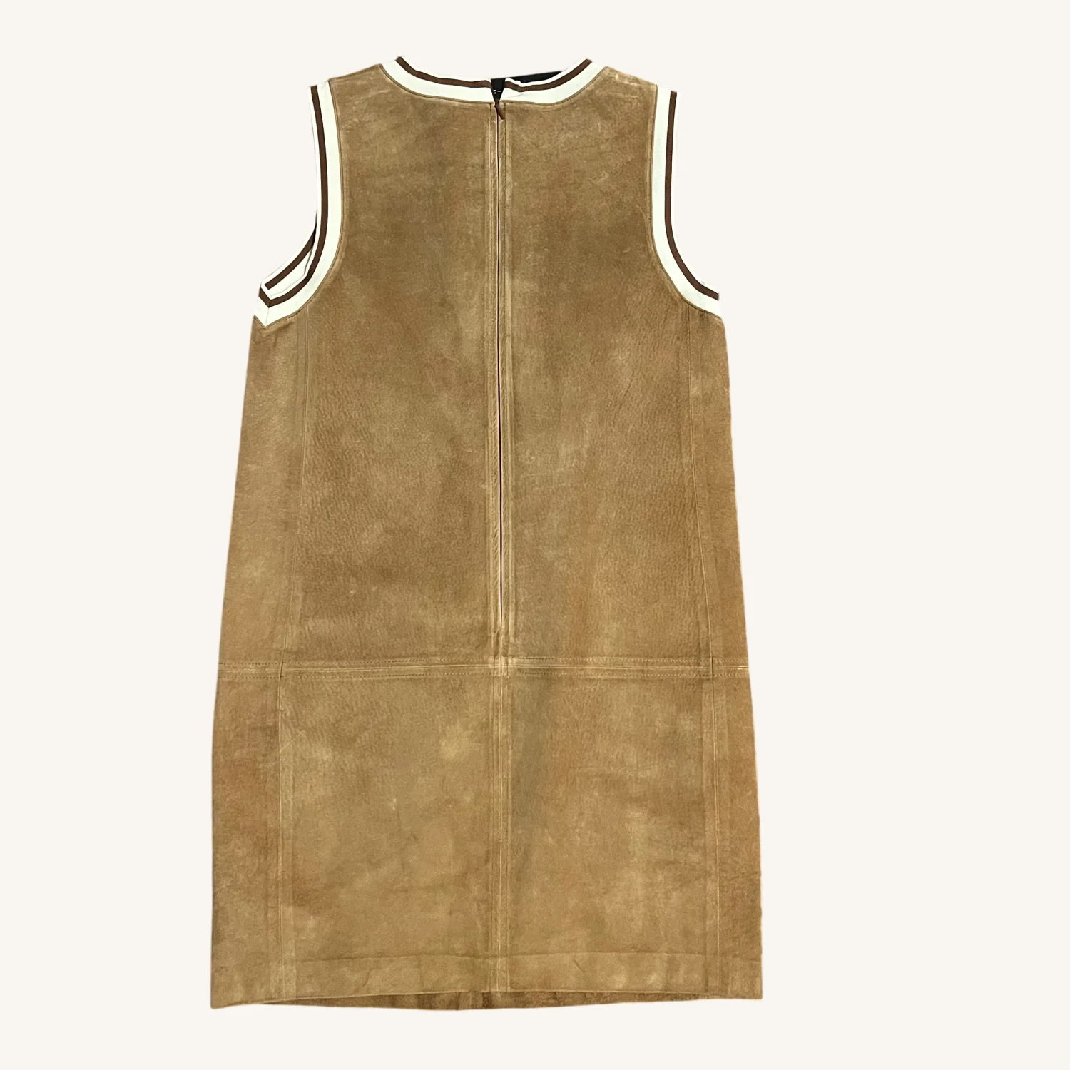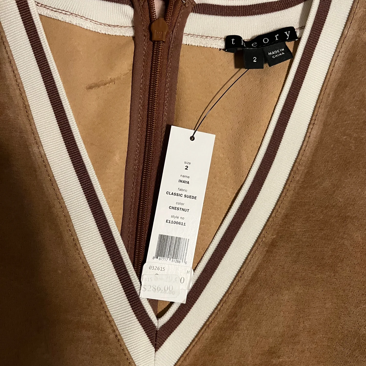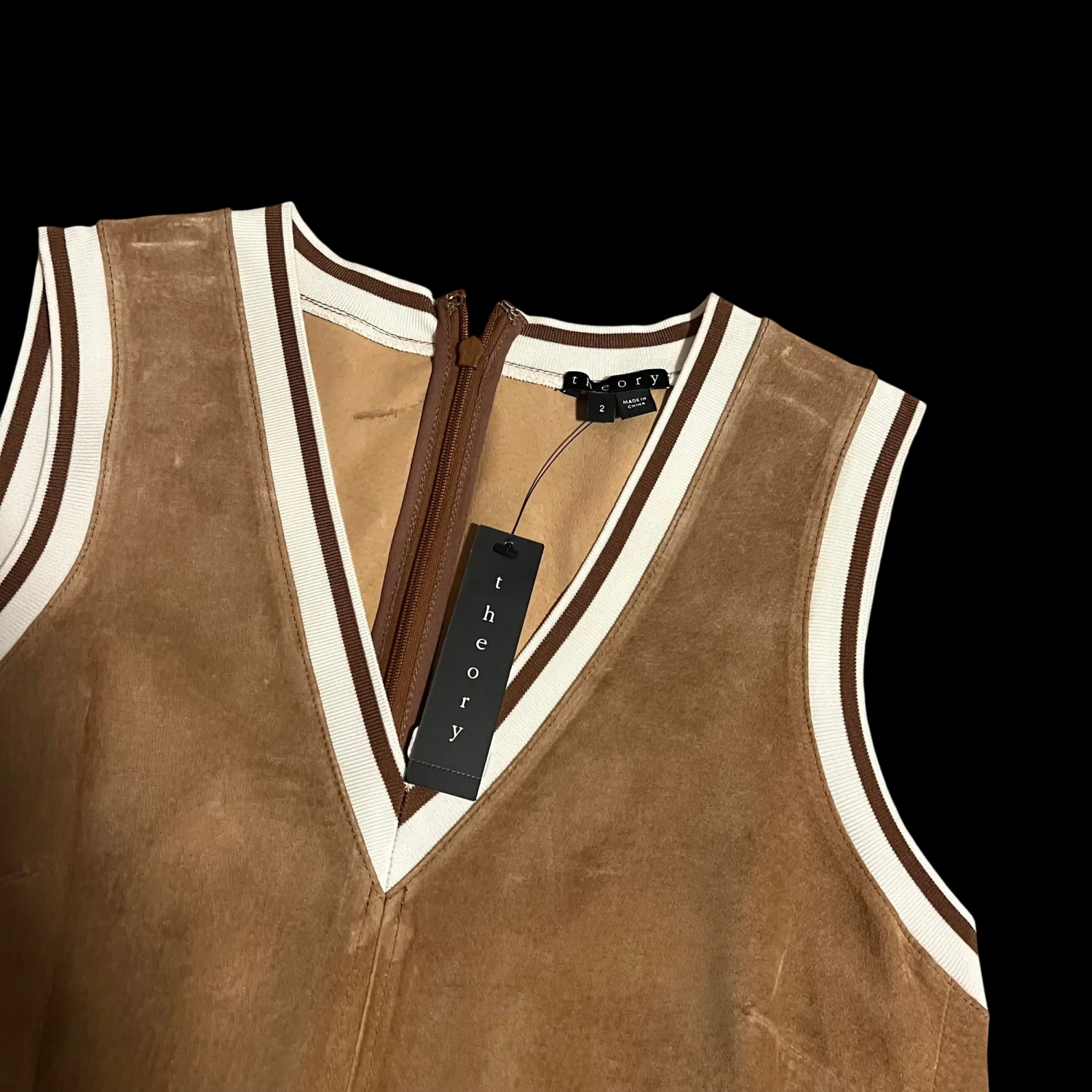 Theory Ihaya sleeveless dress, made from soft Chestnut brown suede. New with tags. Full price was over $700. Never worn. It features a stylish V-neck with contrasting white and brown trim, adding a sporty yet elegant touch. The dress is perfect for both casual and semi-formal occasions. It has a zip closure at the back for easy wear. Size XS (2). Care instructions suggest professional suede cleaning.