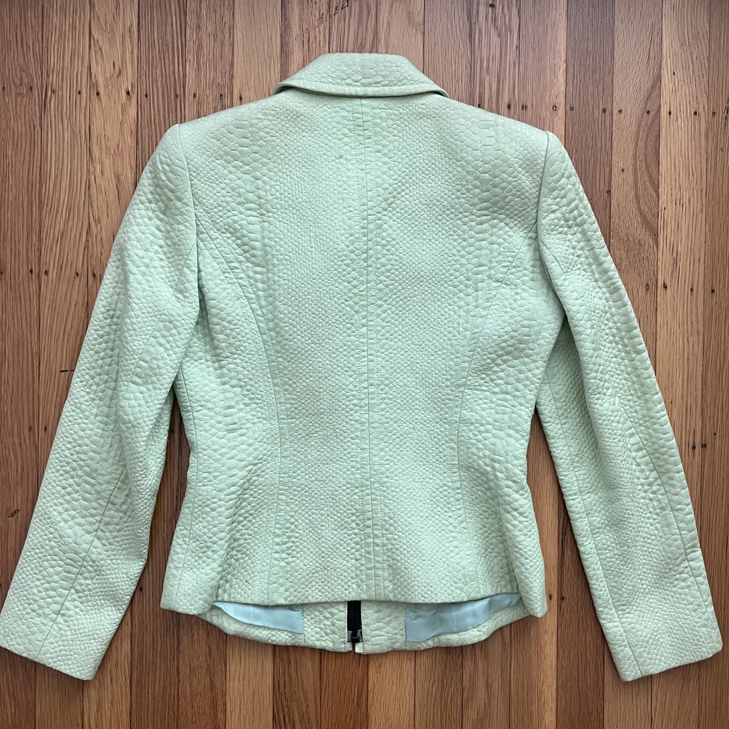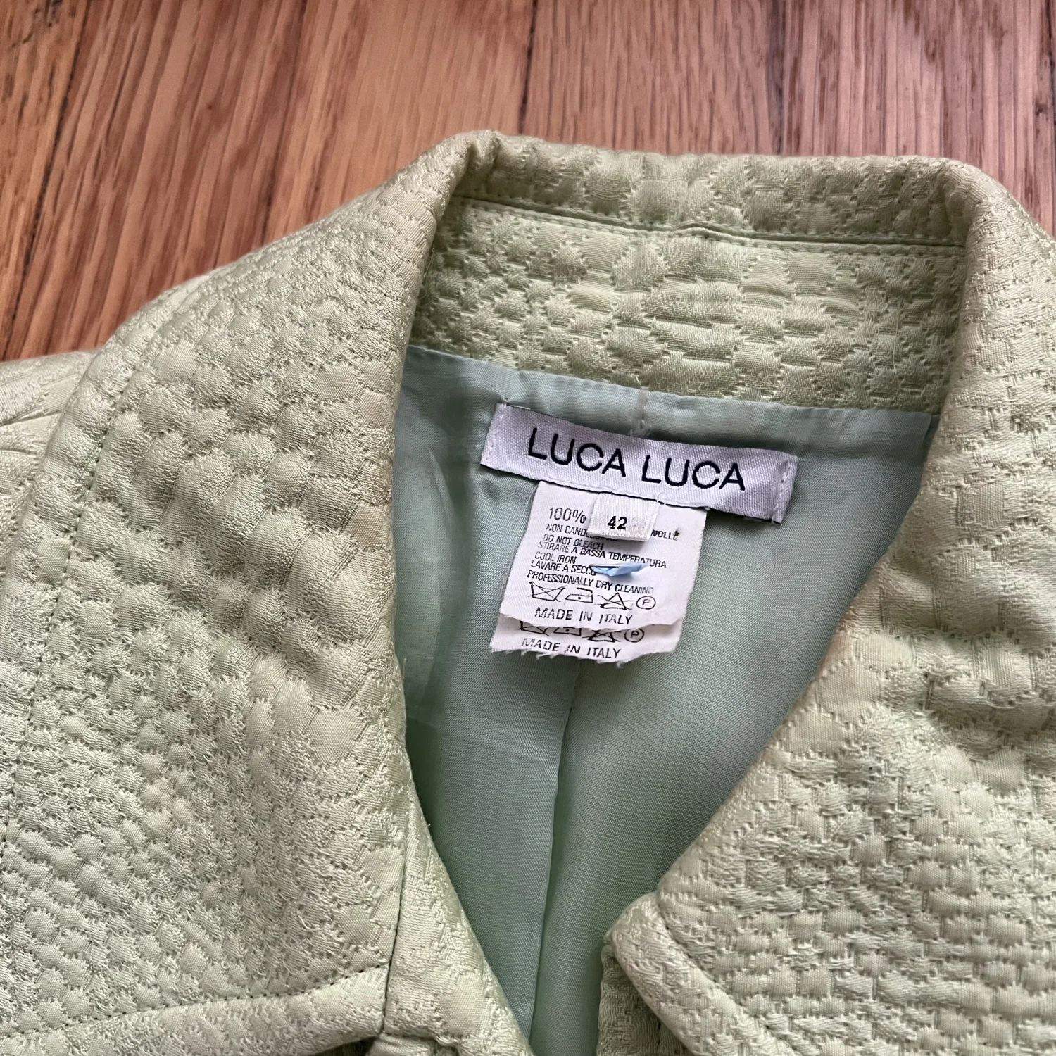 Vintage Luca Luca Jacket. It’s a lime green ish color. I think the color is more rich in real life than it shows in pictures. Made in Italy. Size 42 IT