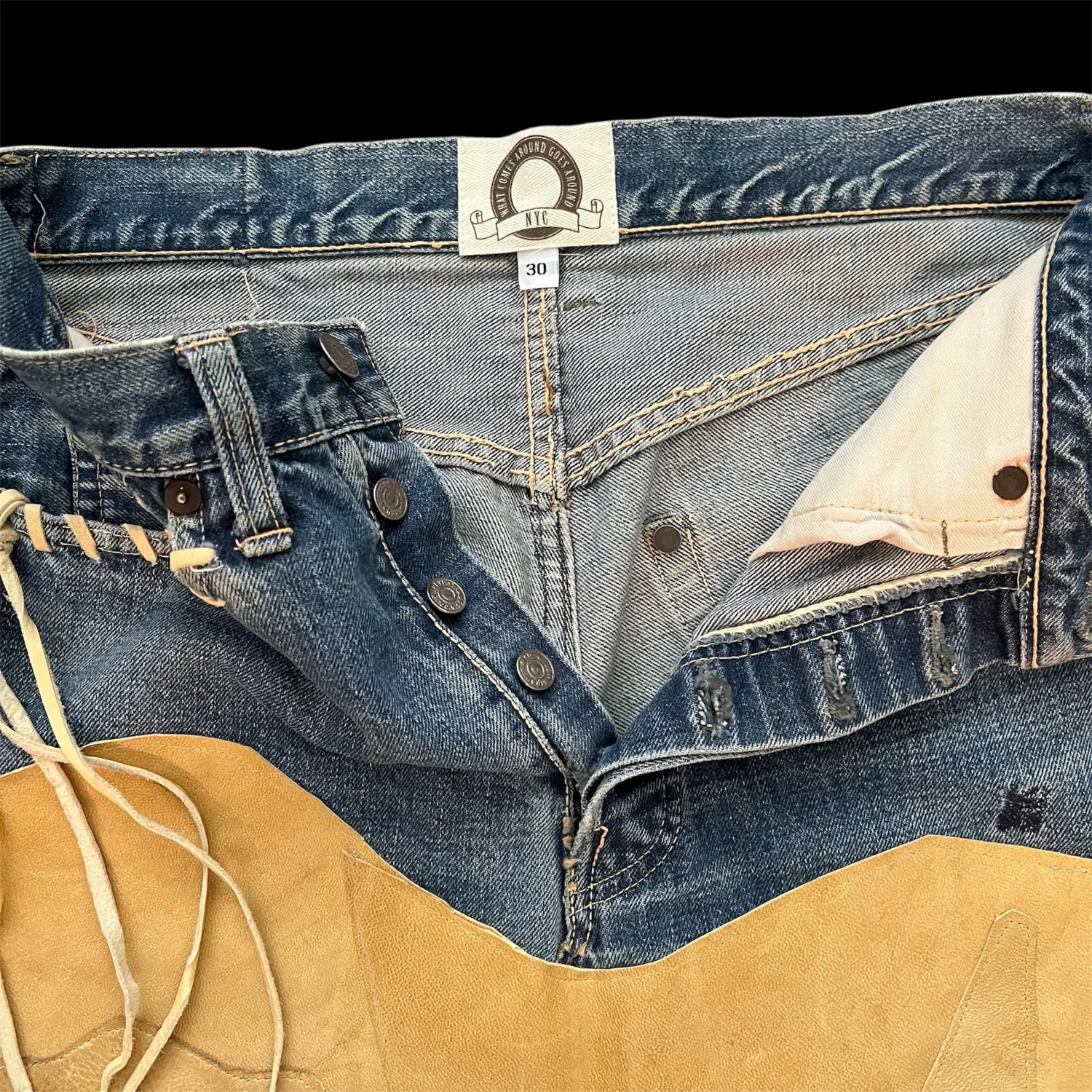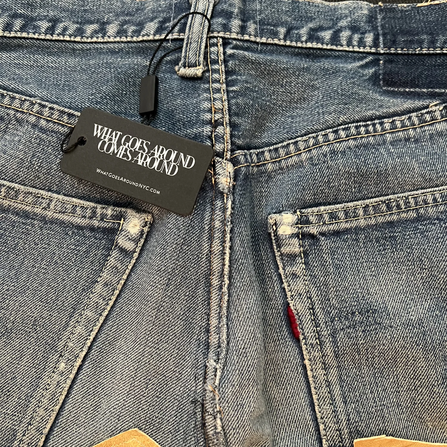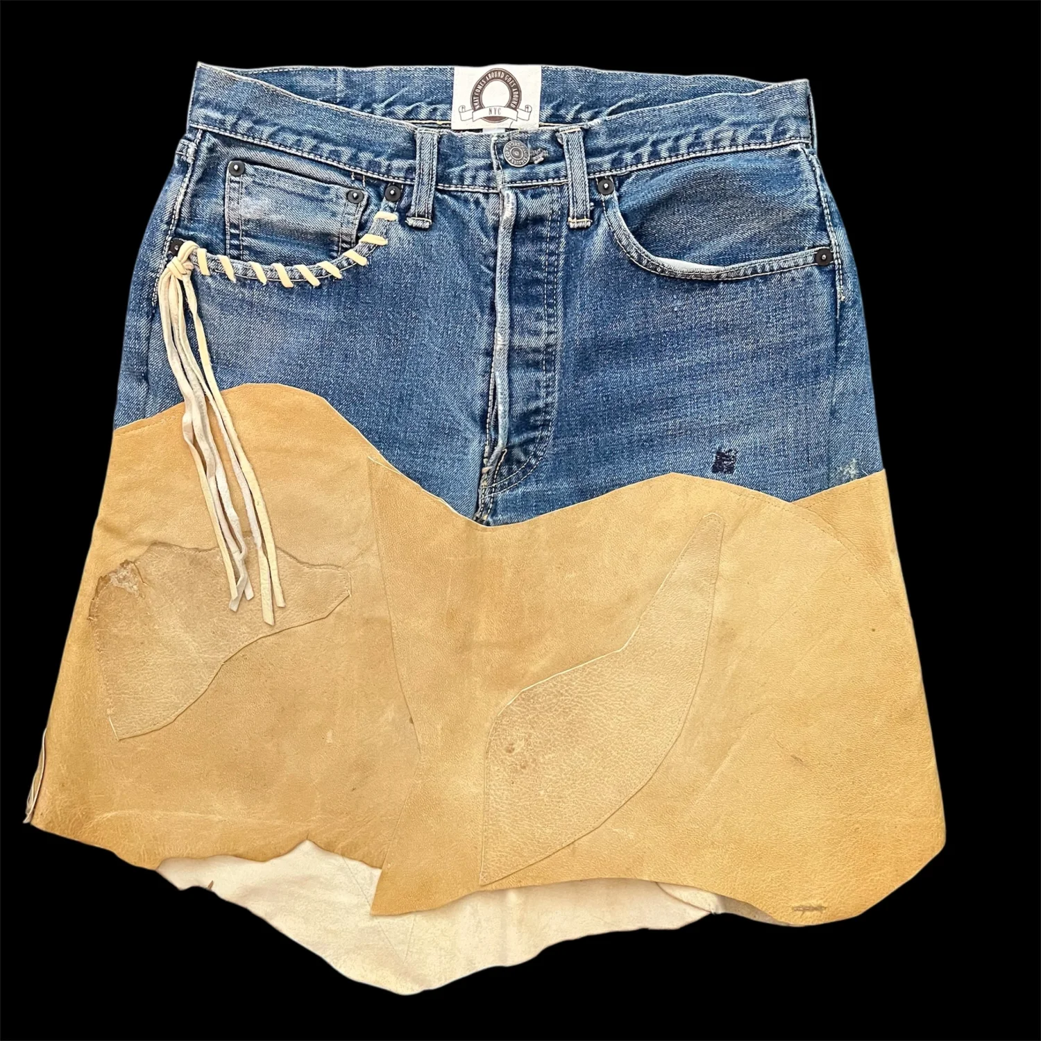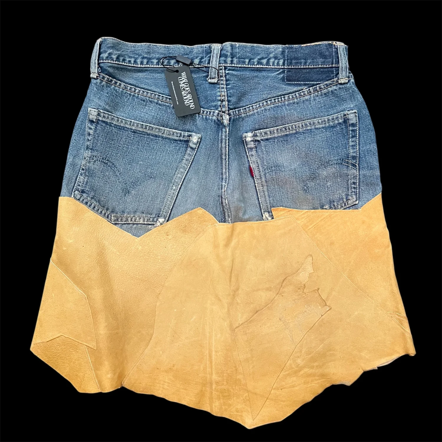 Reworked vintage denim skirt with leather lower part, denim upper part. From What Goes Around Comes Around NYC. It has Tags still. Rare find. It’s new with tags post being reworked by WGACA NYC