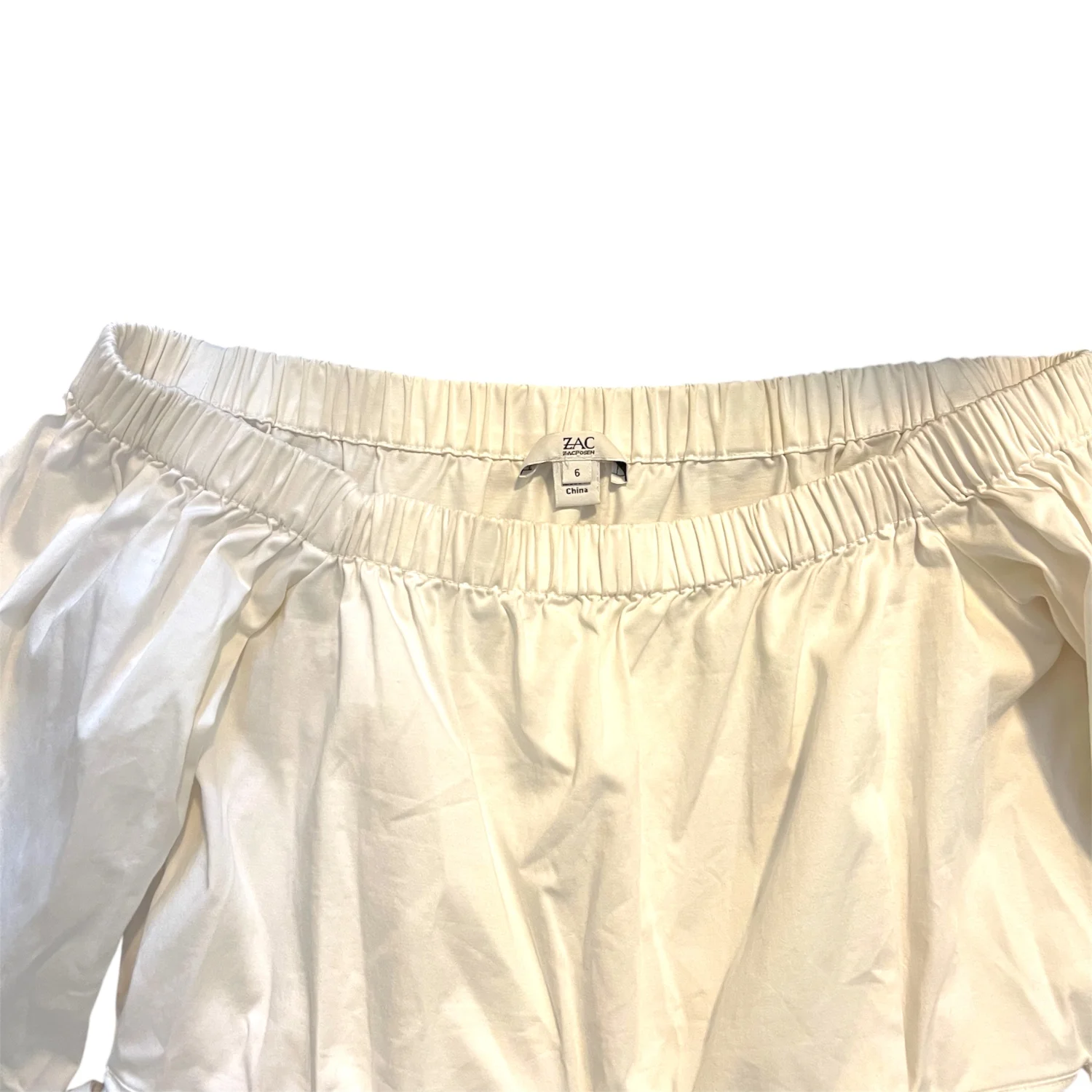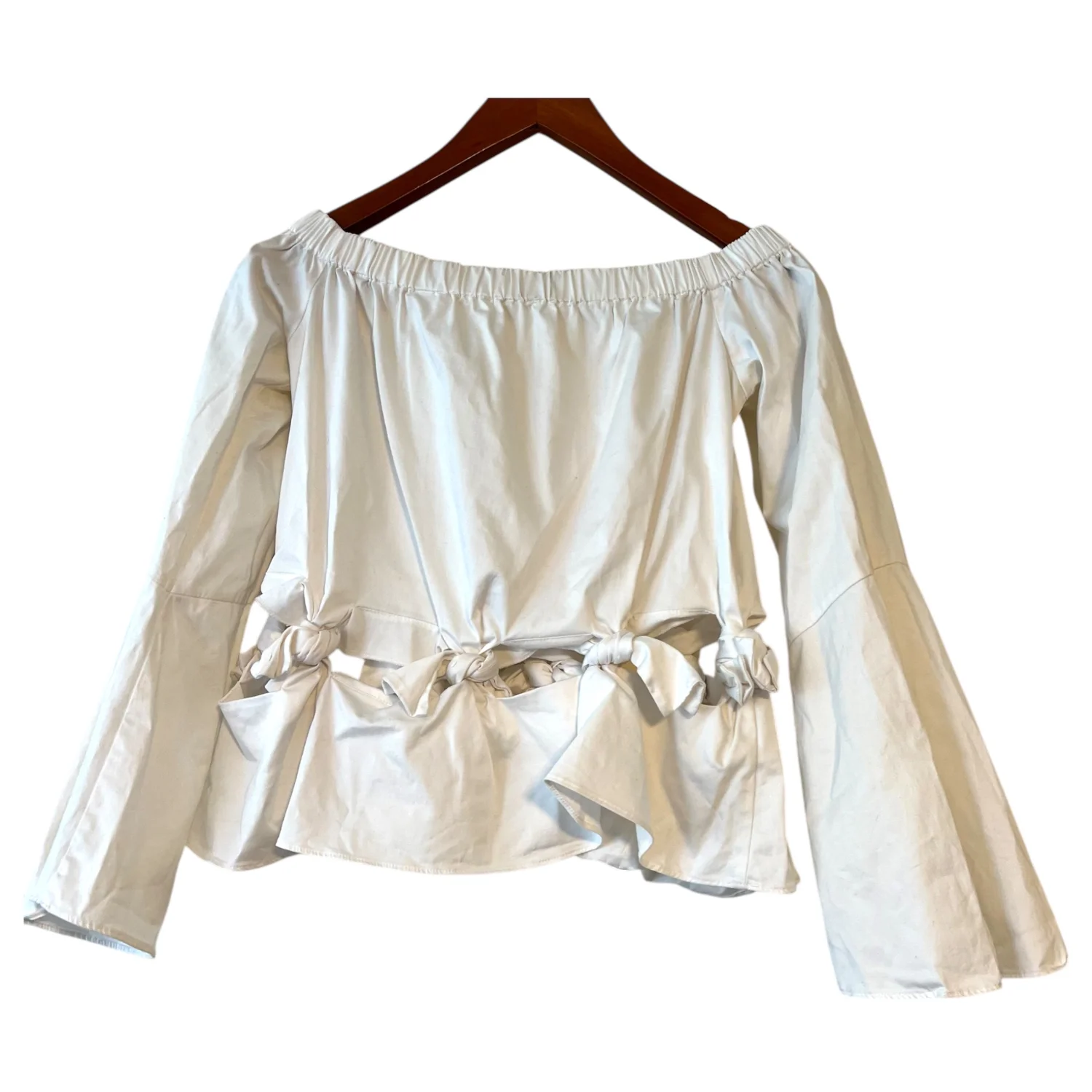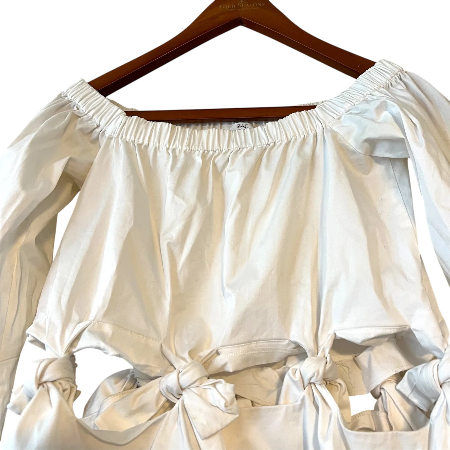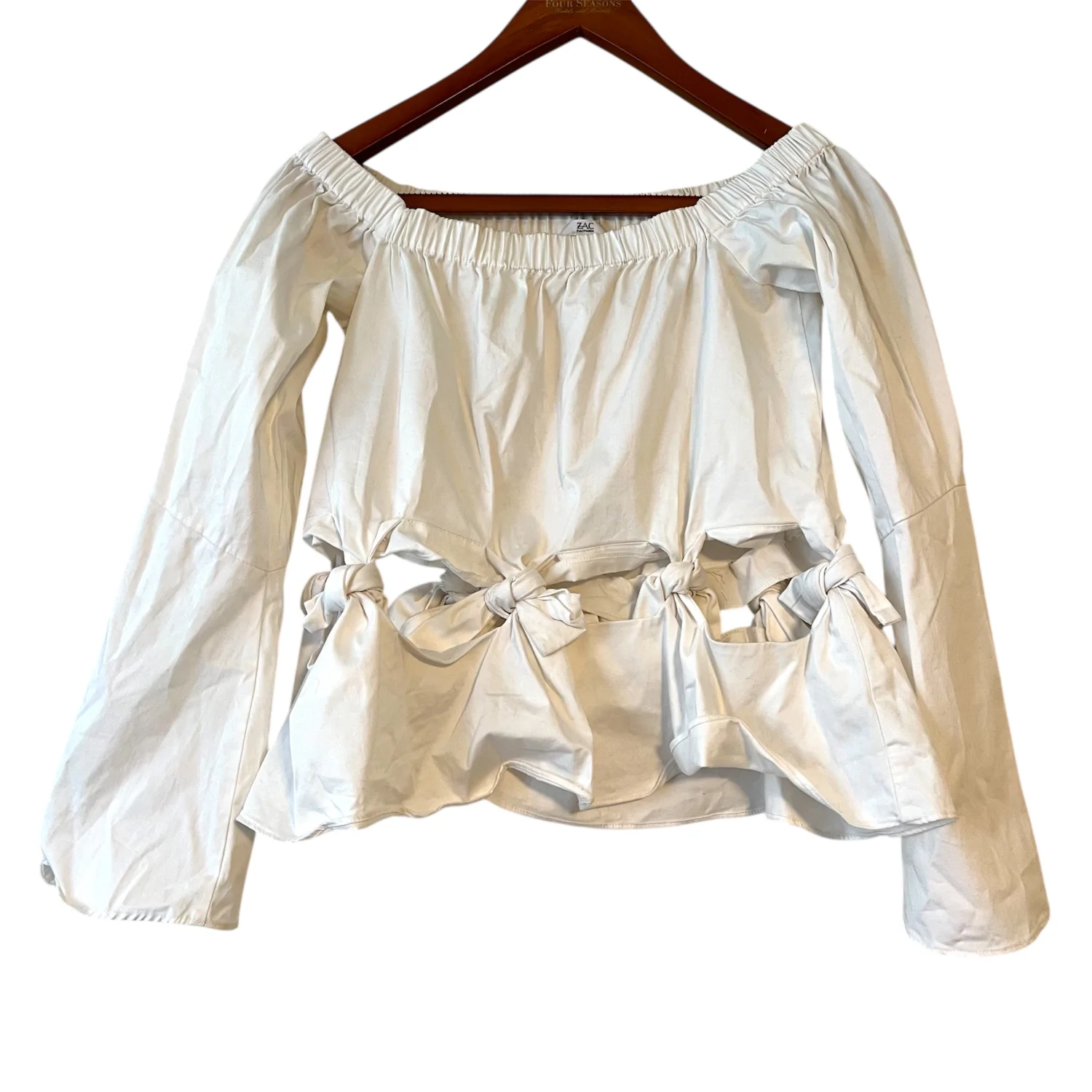 Summery white top from Zac Posen. full price at Barney’s was ~350. Bow / tie knots, that expose skin. Off shoulder design and wide sleeves.