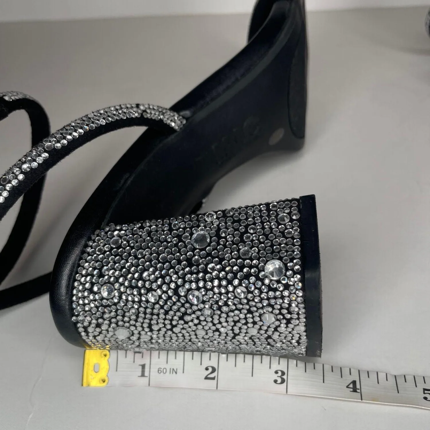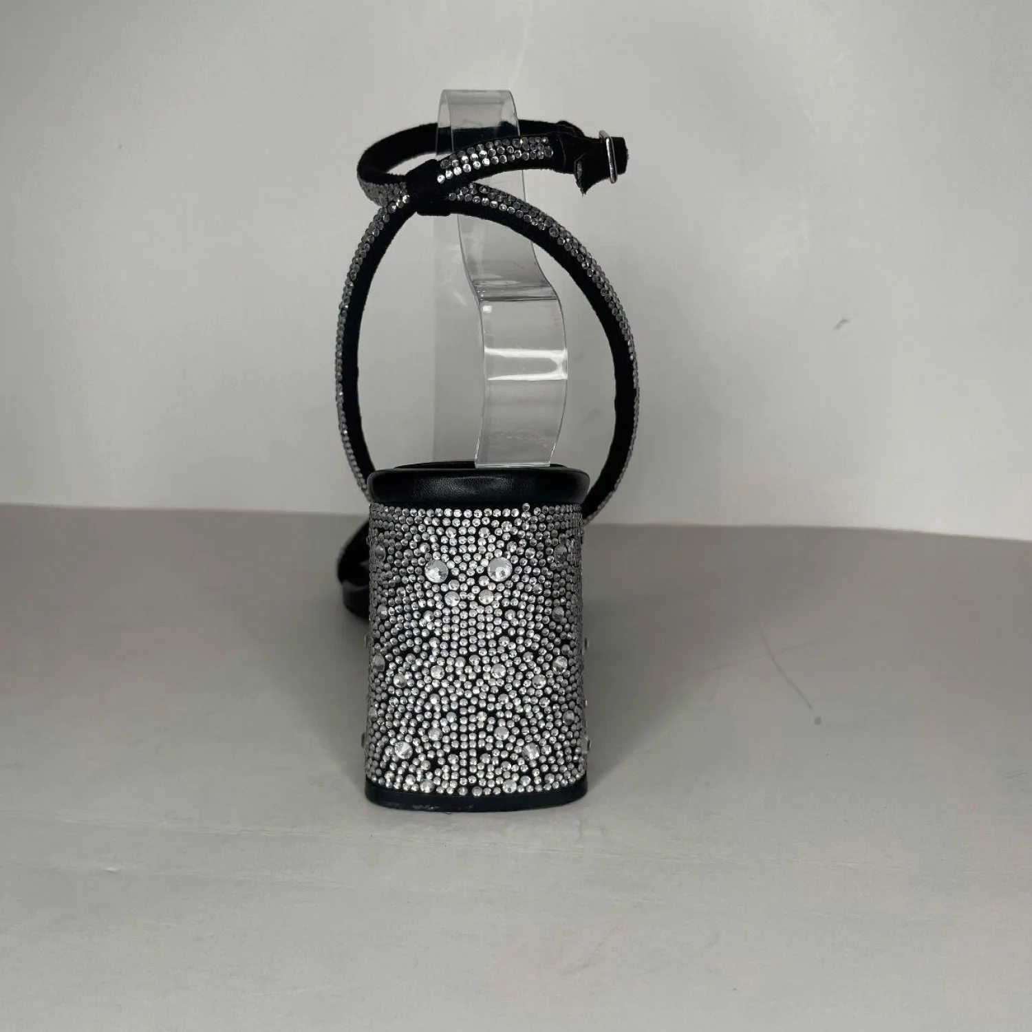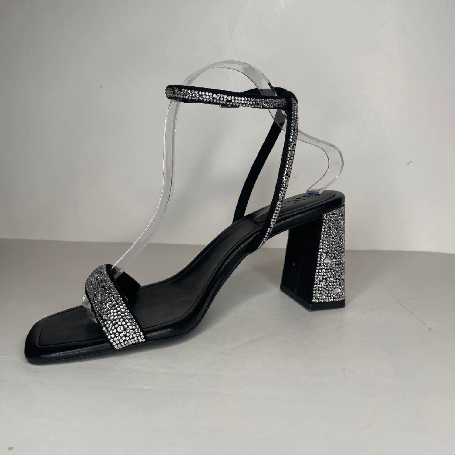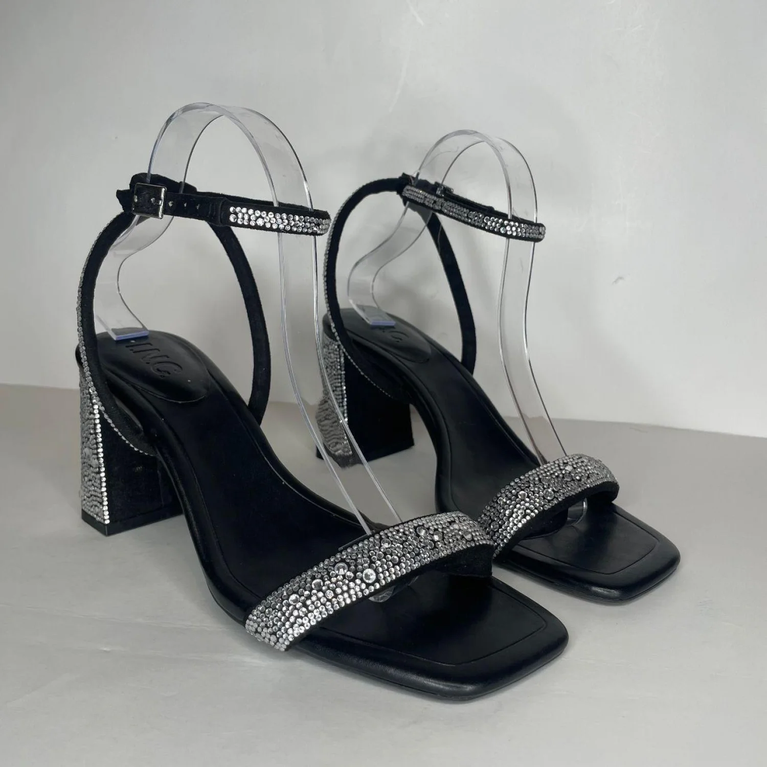 Features: Add a touch of dazzle to your next special occasion with these block heel sandals. Featuring a chic square toe and shimmering rhinestone embellishments on the toe strap, ankle strap, and the heel itself, these shoes are designed to catch the light from every angle. • Style Profile: glam, sparkly, y2k, evening, formal, wedding guest, prom, square toe, block heel, rhinestone, bachelorette, night out, holiday, minimalist glam, chic • Flaws: Good pre-owned condition with some noted flaws. There is some peeling on the interior lining of the front toe straps. This is on the underside and is not visible when the shoe is on the foot. A few rhinestones appear missing. (see photos) • All measurements are approximate Heel Height: 3.5' Happy to answer your questions! Super Fast Shipper!