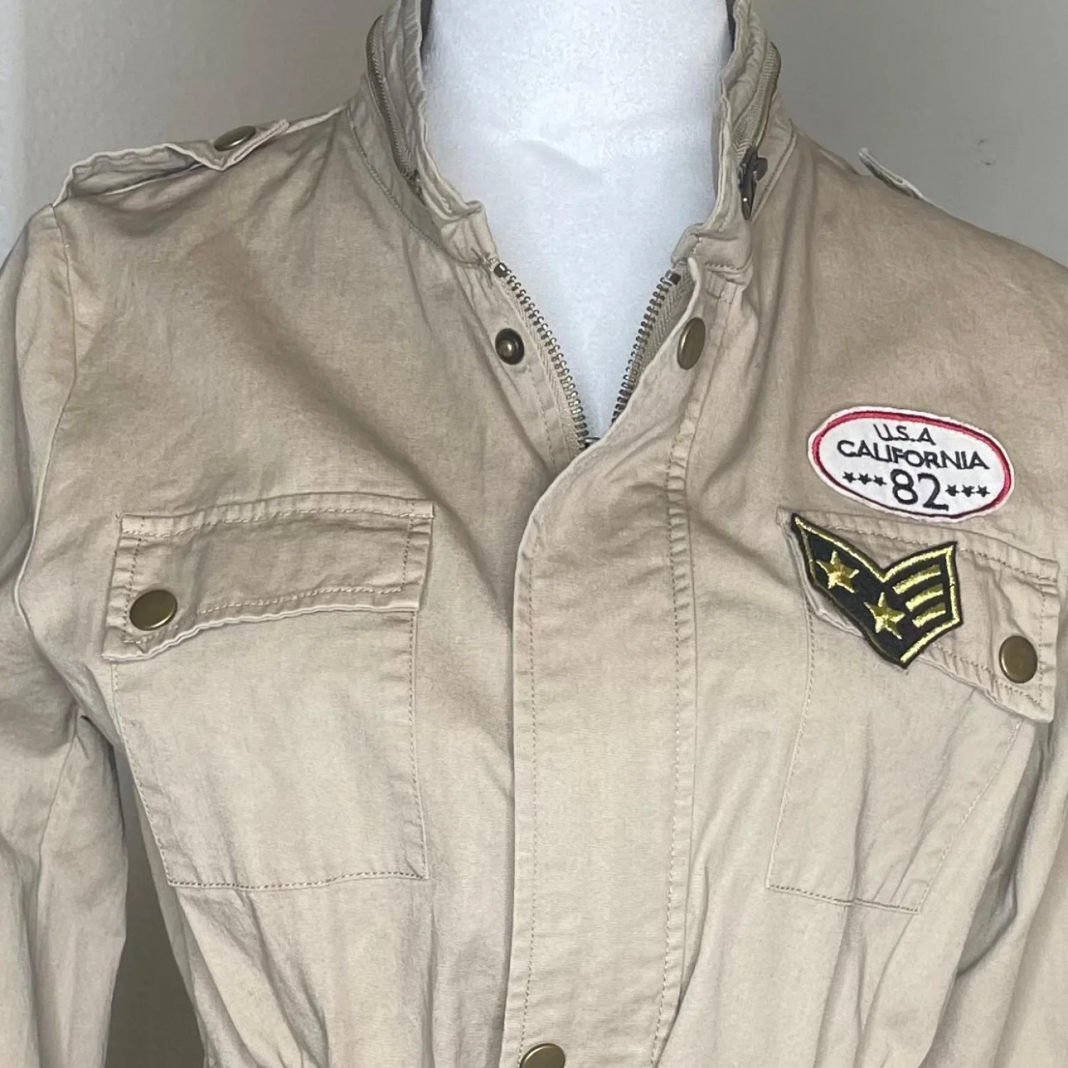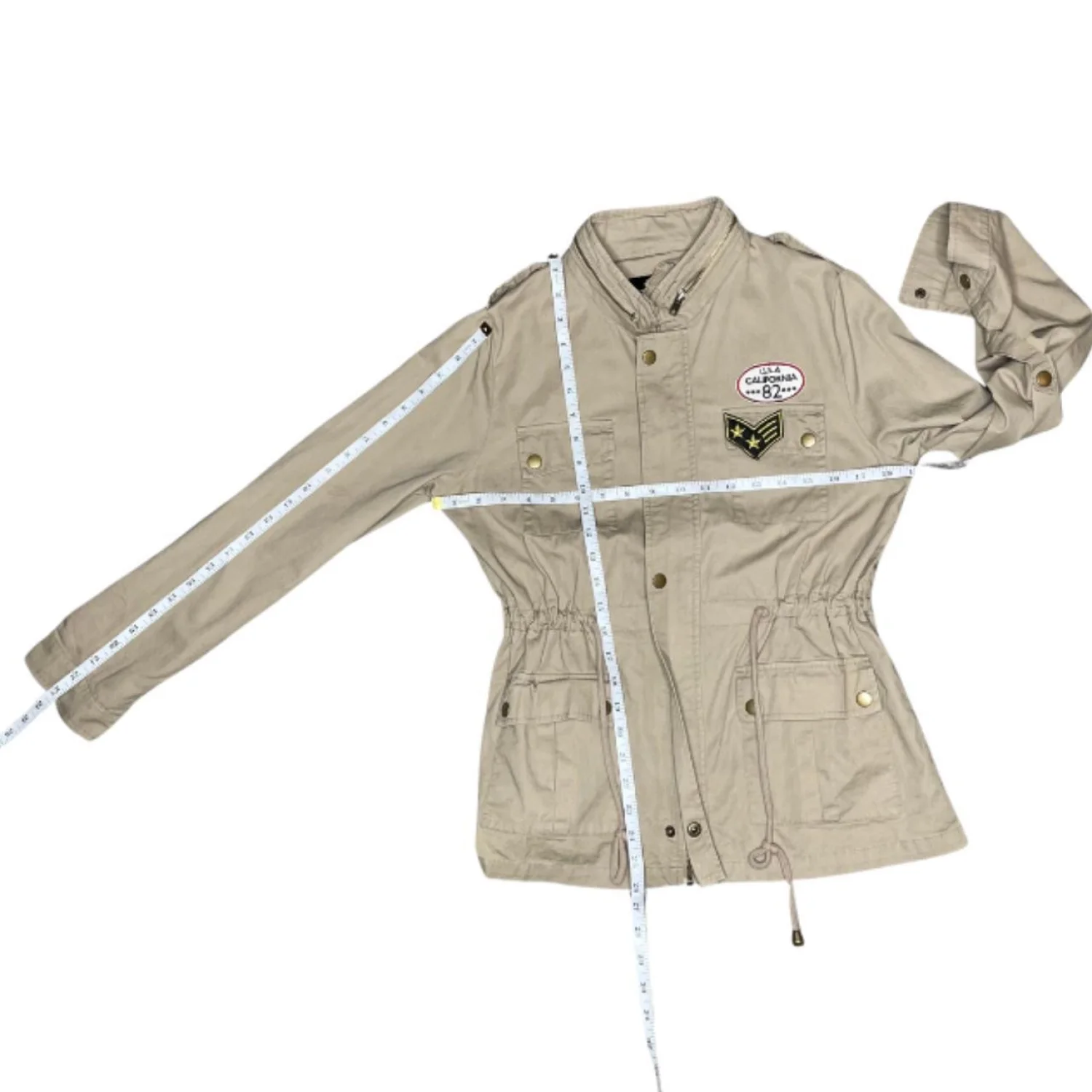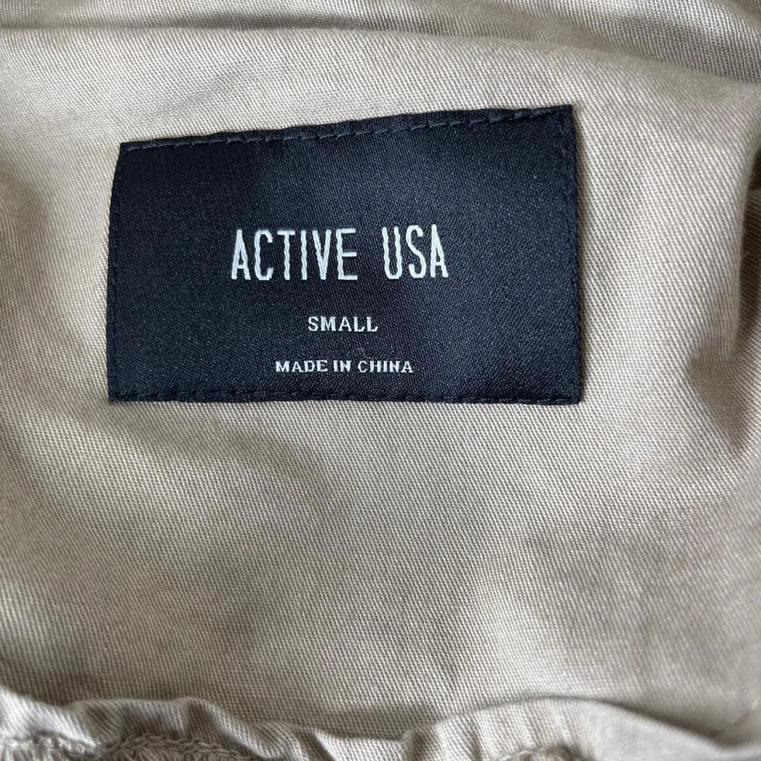 Active USA Tan Utility Jacket Small Military Style California 82 Patch Full Zip Features: This lightweight Active USA utility jacket in a classic tan/khaki is perfect for layering. It features a flattering drawstring cinched waist, roll tab sleeves, military-style epaulets, and unique "California 82" and chevron patches. The 100% cotton fabric is durable yet breathable, making it an ideal choice for spring or fall. • Style Profile: Utility, Gorpcore, Military, Safari, Streetwear, Cargo, Casual, Lightweight, Patches, California, Indie, Coastal, Adventure, Workwear • Flaws: No Holes, stains, or tears • Please see photos for measurements (in inches). PTP: 19' Length: 26' Sleeve Length: 23' • Happy to answer your questions! Super Fast Shipper!