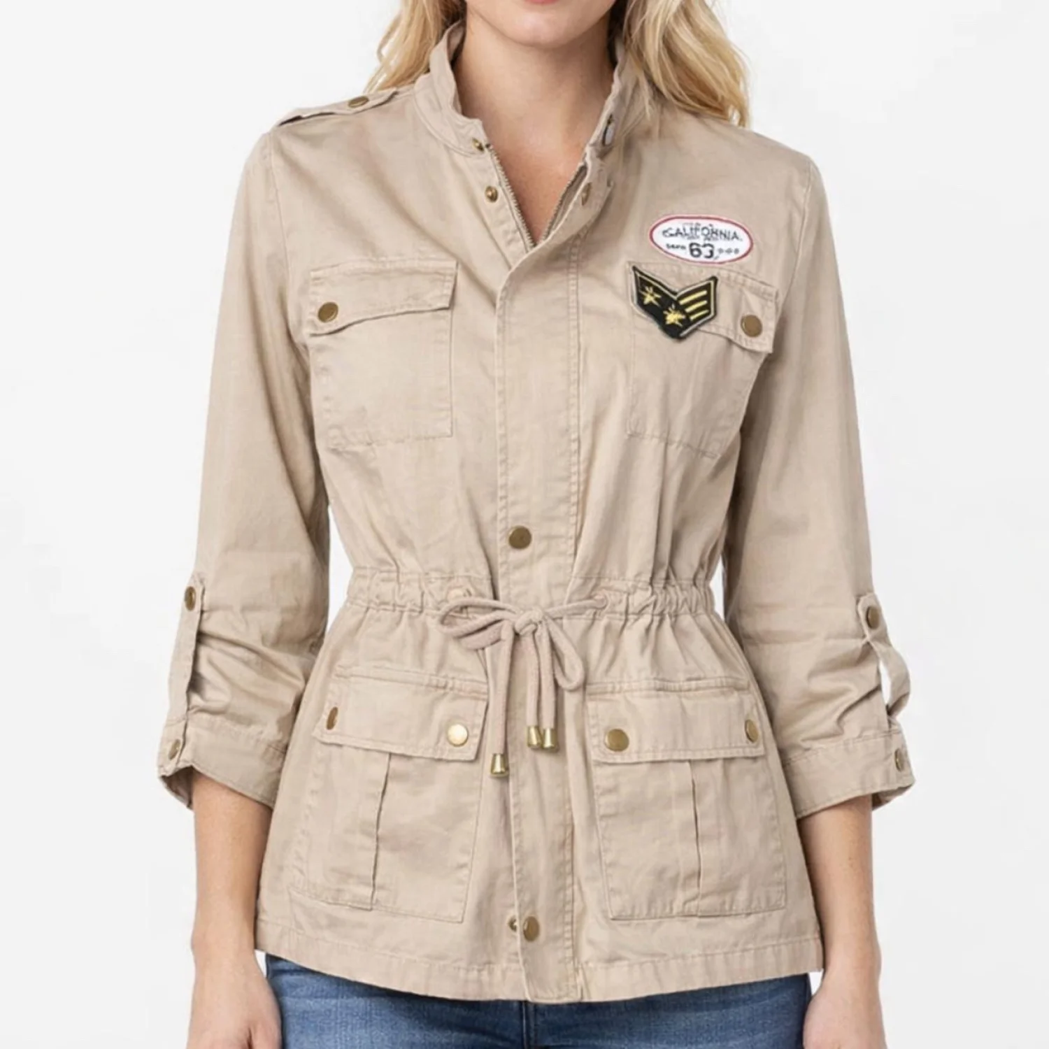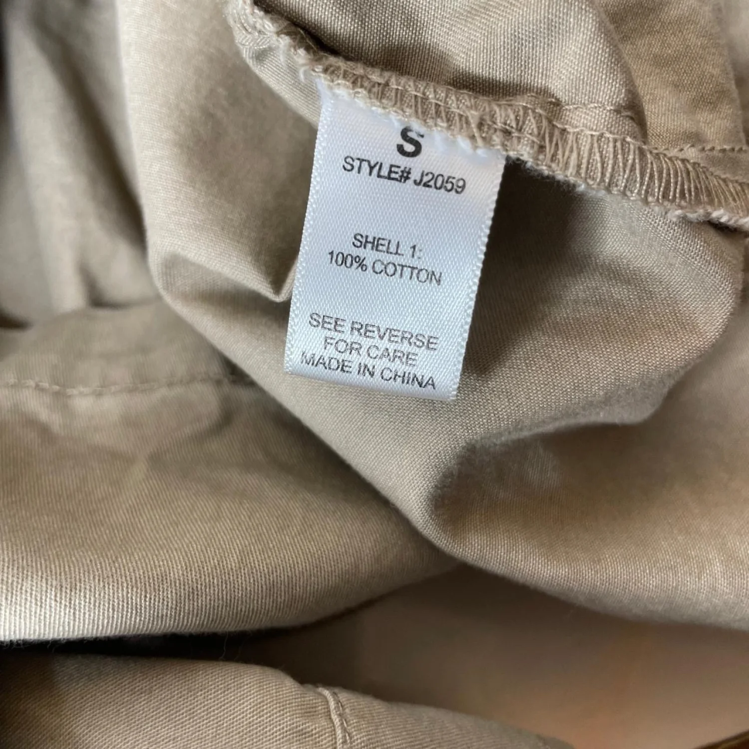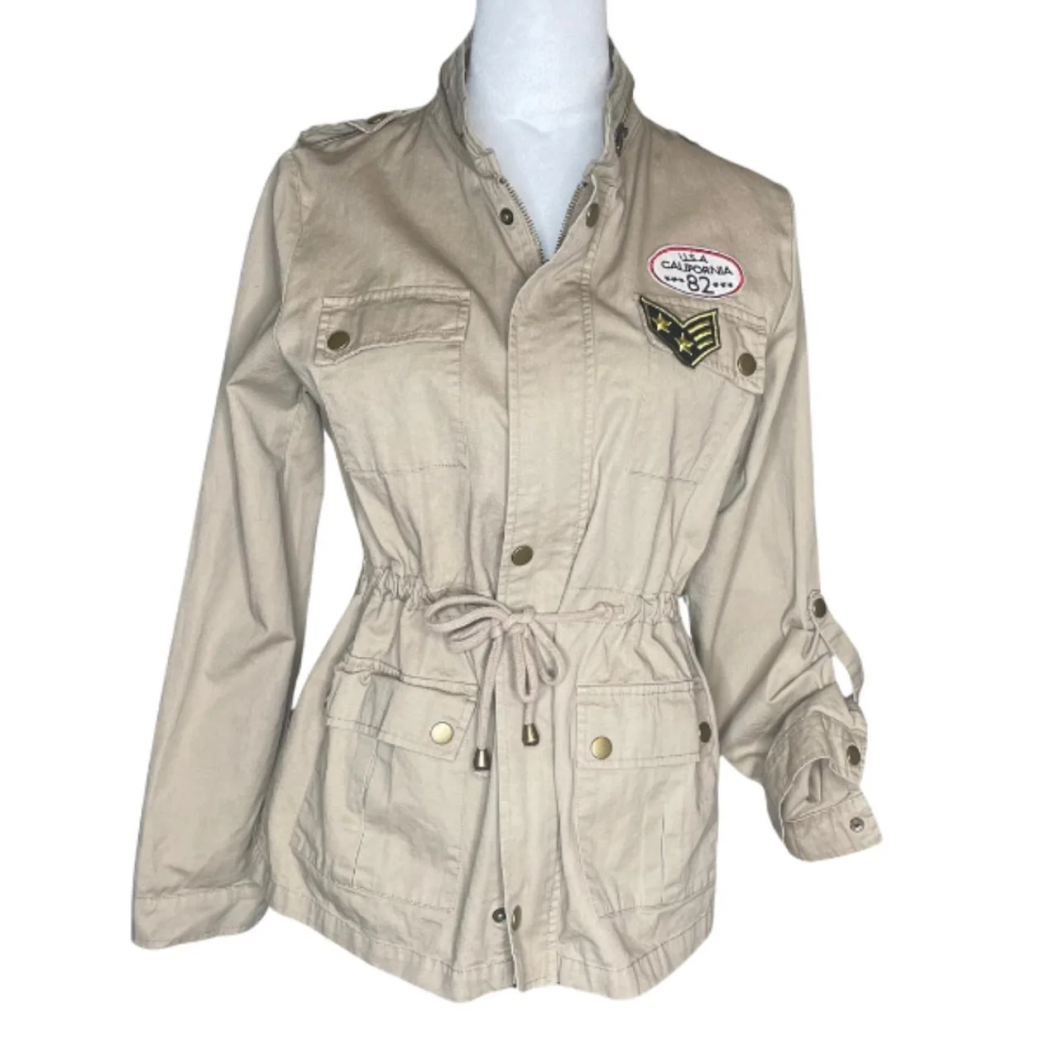 Active USA Tan Utility Jacket Small Military Style California 82 Patch Full Zip Features: This lightweight Active USA utility jacket in a classic tan/khaki is perfect for layering. It features a flattering drawstring cinched waist, roll tab sleeves, military-style epaulets, and unique "California 82" and chevron patches. The 100% cotton fabric is durable yet breathable, making it an ideal choice for spring or fall. • Style Profile: Utility, Gorpcore, Military, Safari, Streetwear, Cargo, Casual, Lightweight, Patches, California, Indie, Coastal, Adventure, Workwear • Flaws: No Holes, stains, or tears • Please see photos for measurements (in inches). PTP: 19' Length: 26' Sleeve Length: 23' • Happy to answer your questions! Super Fast Shipper!