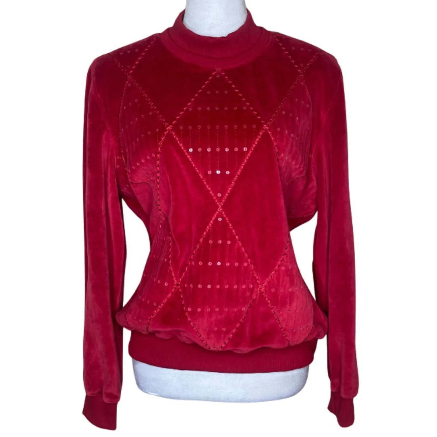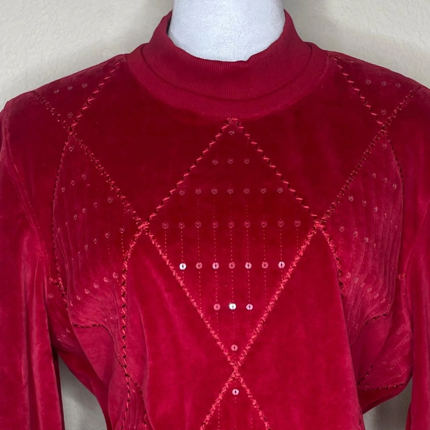 Alfred Dunner Red Velour Diamond Sequin Mock Neck Vintage Petite Sweater PL Features: Bold. Crimson. Textural. This 80s/90s Alfred Dunner piece is pure Red Rumor energy. The plush velour body has a heavy, soft-touch hand feel and a slight boxy silhouette that hits right at the hip. It features a sharp mock neck and ribbed hem for a secure, tapered fit. The front is dominated by a tonal diamond lattice design, accented by subtle, light-catching micro-sequins. It’s the kind of piece that demands attention without saying a word. • Style Profile: 80s, 90s, Velour, Red, Sequin, Diamond, Mock Neck, Retro, Holiday, Eclectic Grandpa, Kitschy, Maximalist, Vintage, Petite, Cozy, Textural, Glam, Party, Evening, Dark Coquette, Festive, Luxe, Soft Goth, Cabincore • Flaws: No Holes, stains, or tears • Please see the photos for measurements (in inches). PTP: 20.5' Length: 23' Sleeve Length: 20.5' Happy to answer your questions! Super Fast Shipper!