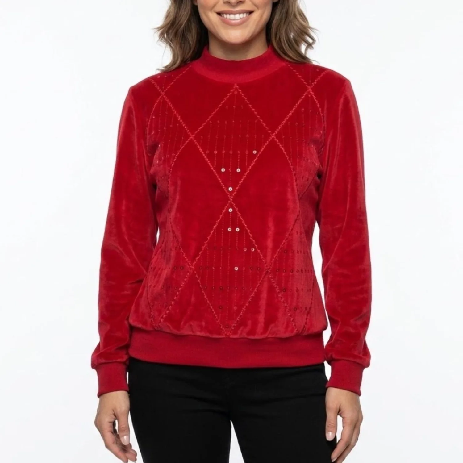 Alfred Dunner Red Velour Diamond Sequin Mock Neck Vintage Petite Sweater PL