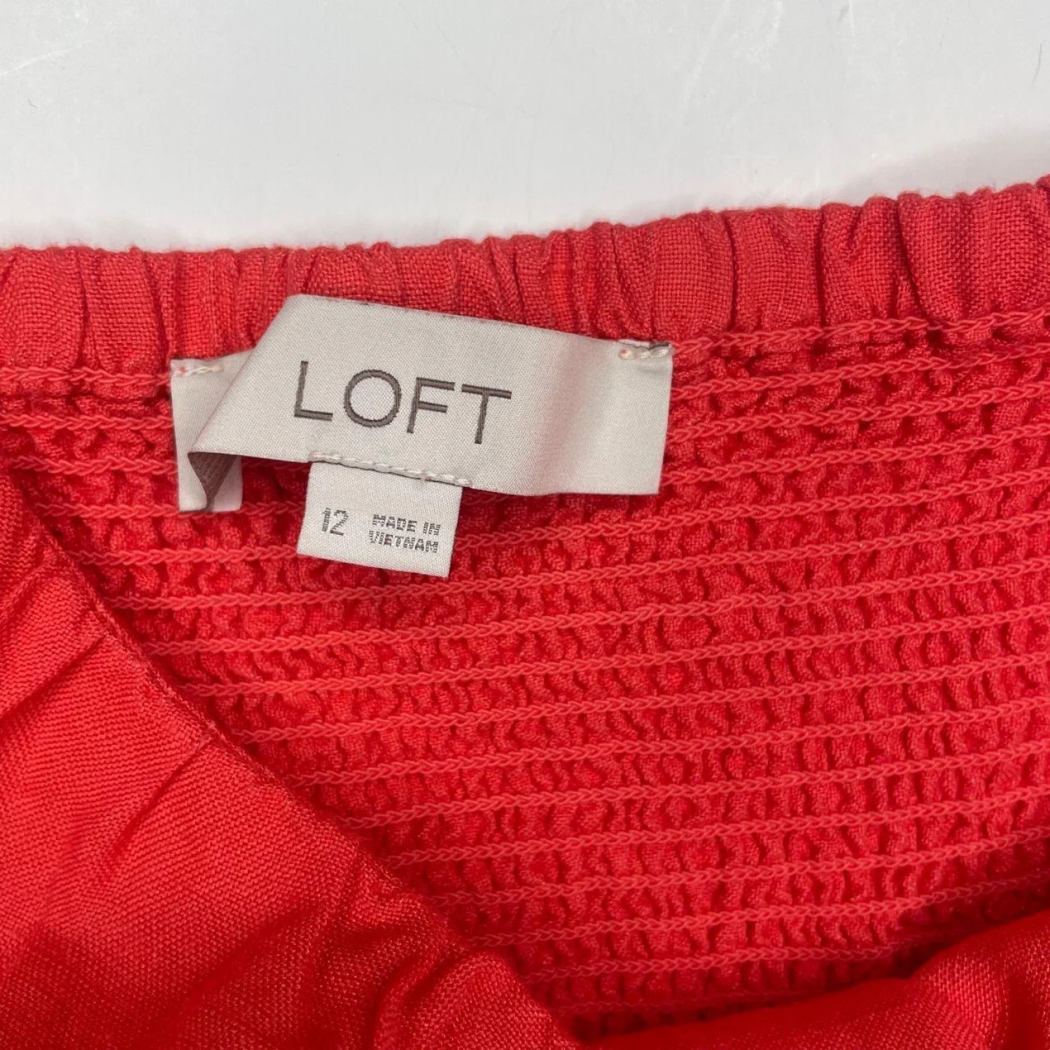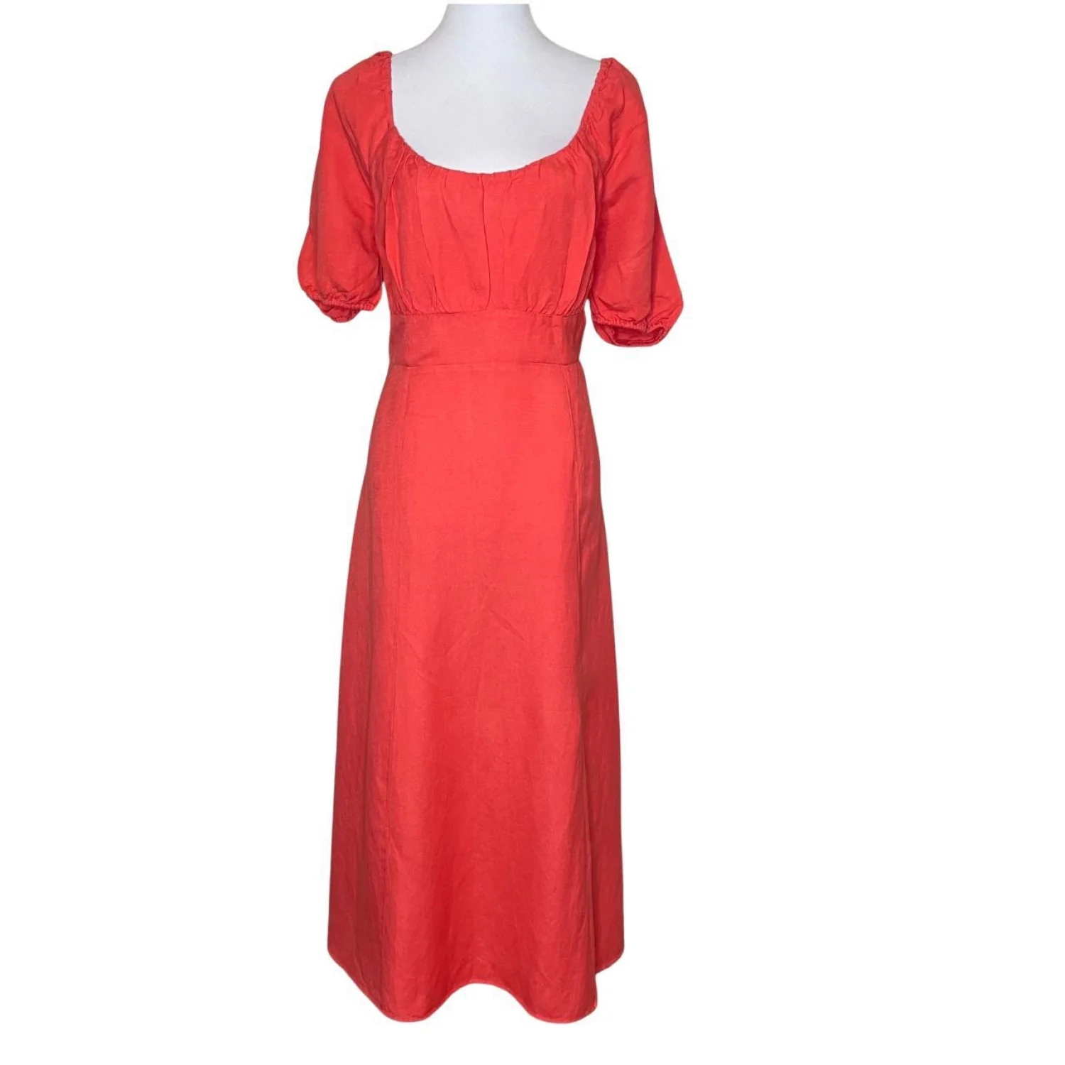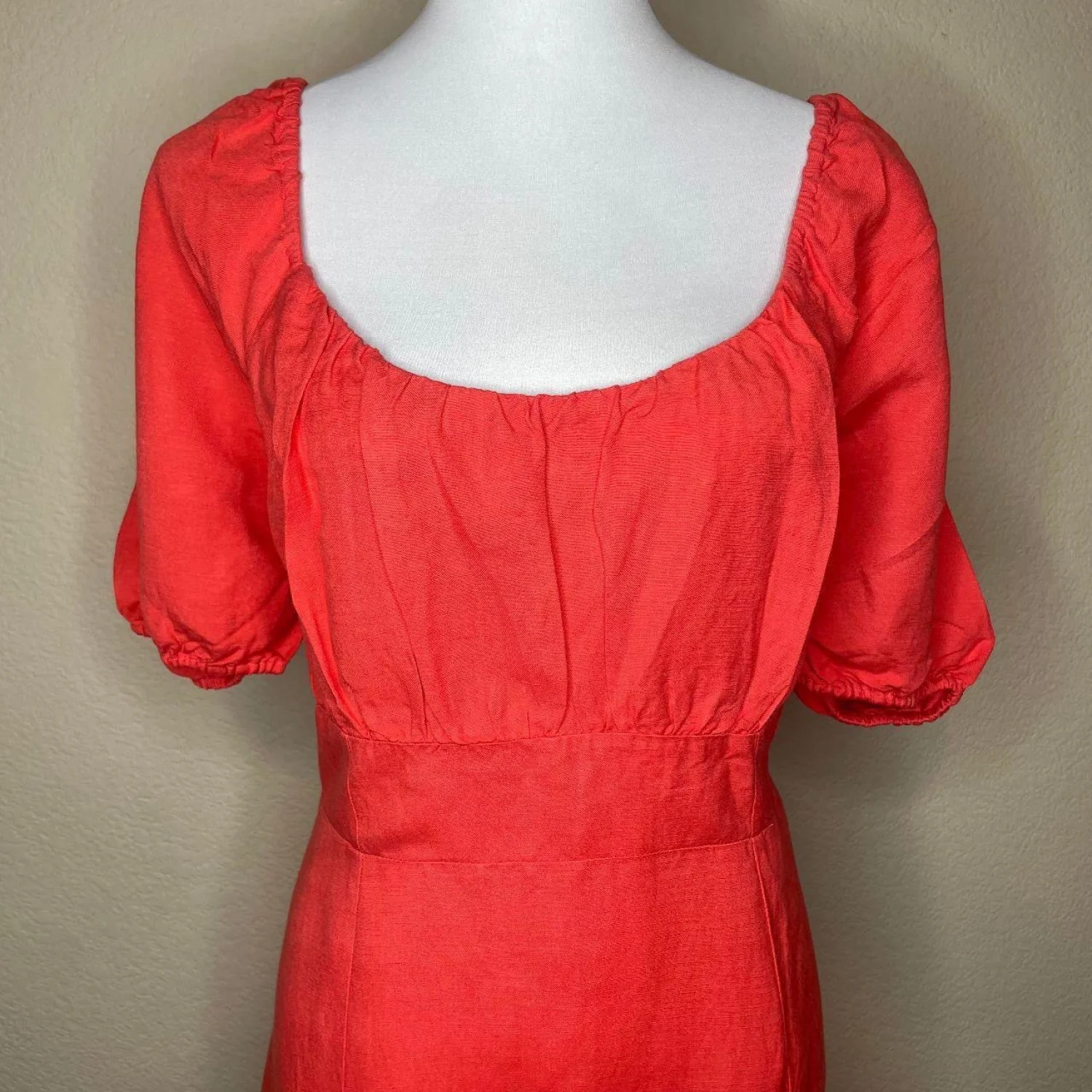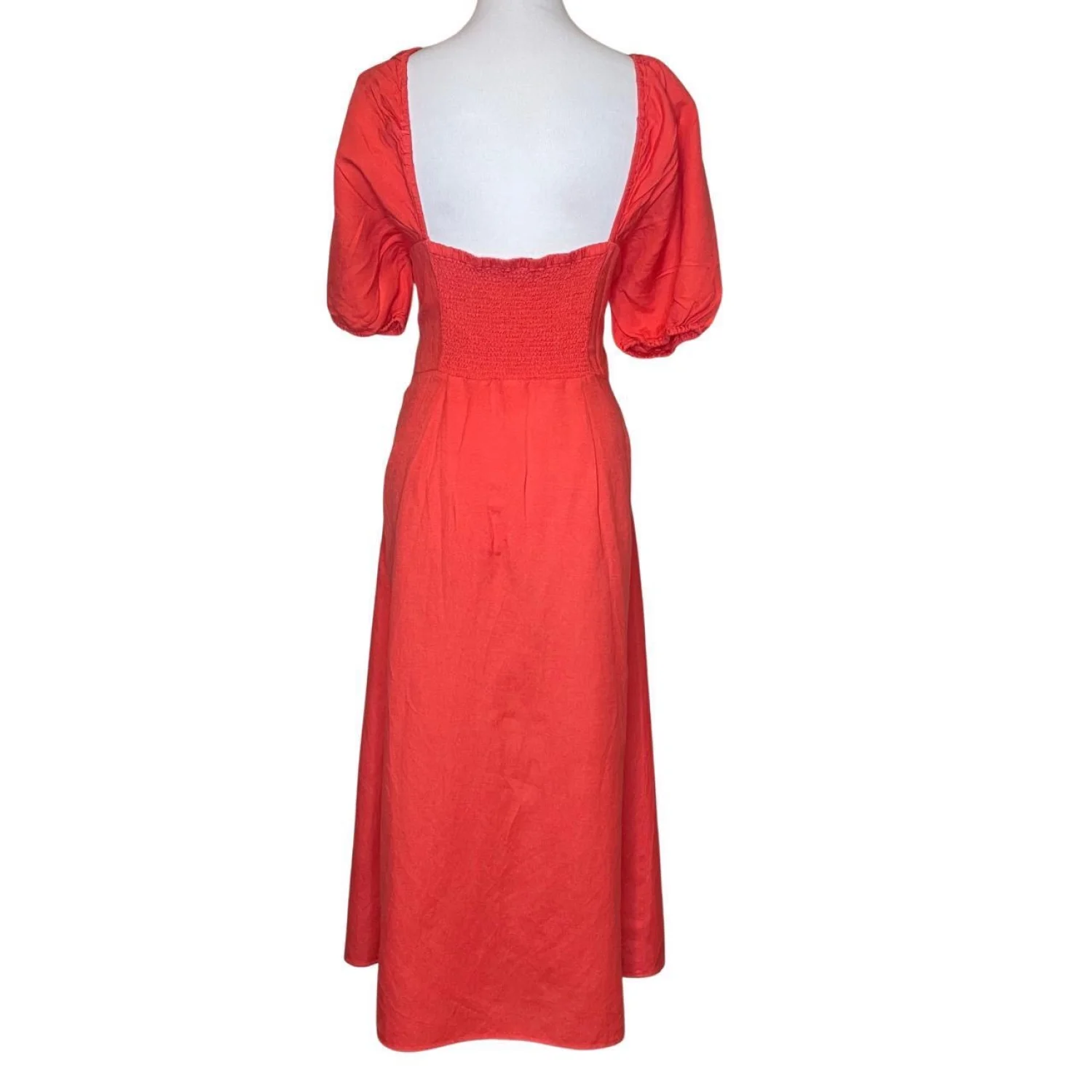 Ann Taylor LOFT Orange Red Linen Blend Puff Sleeve Smocked Midi Dress Size 12