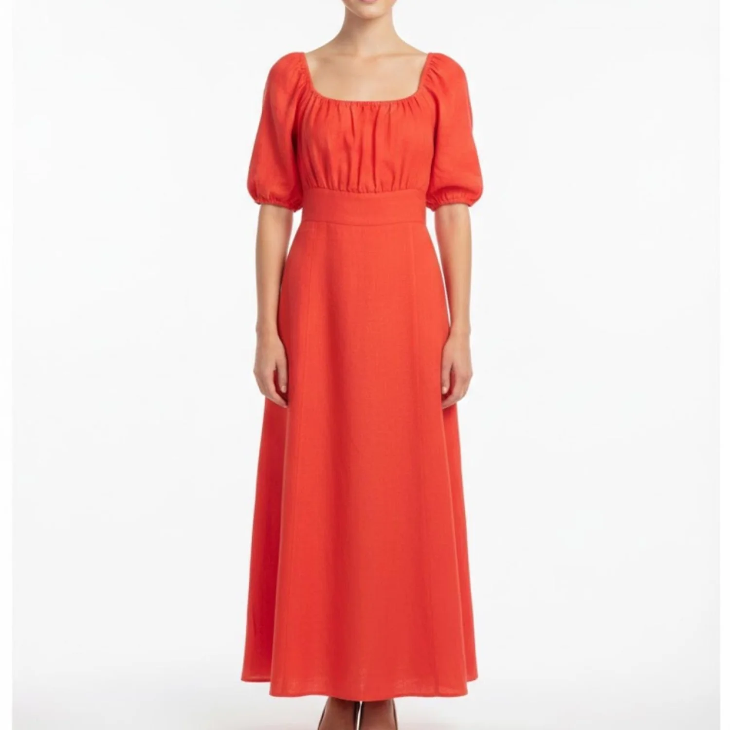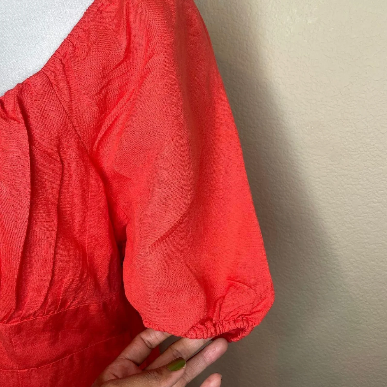 Ann Taylor LOFT Orange Red Linen Blend Puff Sleeve Smocked Midi Dress Size 12 Features: Radiate summer vibes in this stunning tomato red midi dress from LOFT. Crafted from a breathable linen and viscose blend, it features a romantic square neckline, feminine puff sleeves, and a smocked back panel for a comfortable, flexible fit. The A-line silhouette is effortless for garden parties, vacations, or weekend brunch. • Style Profile: Cottagecore, Coastal Grandmother, Summer, Linen, Romantic, Bohemian, Picnic, Tomato Girl, Breathable, Smocked, Puff Sleeve, Sustainable Blend, Casual Chic, Vacation • Flaws: No Holes, stains, or tears (Excellent pre-owned condition) • All measurements are approximate PTP: 18" Length: 52.5" Happy to answer your questions! Super Fast Shipper!