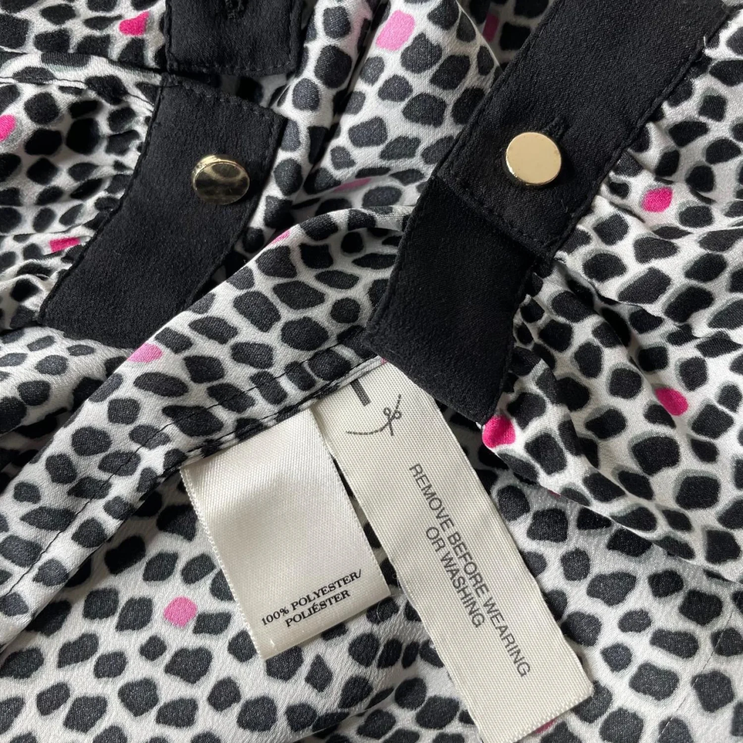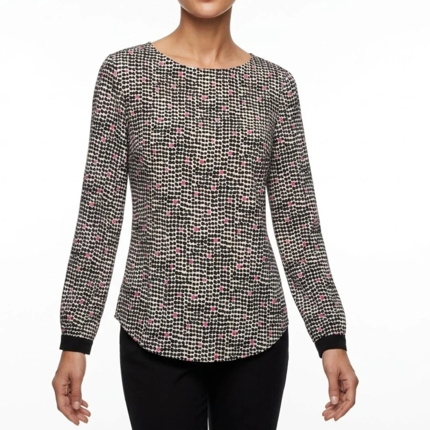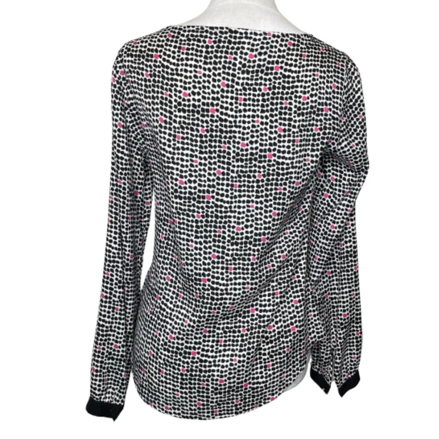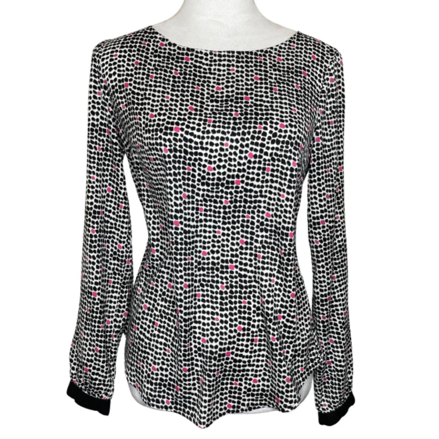 Ann Taylor Mod Office Blouse XS - Black Pink Spotted Print Gold Button Cuff