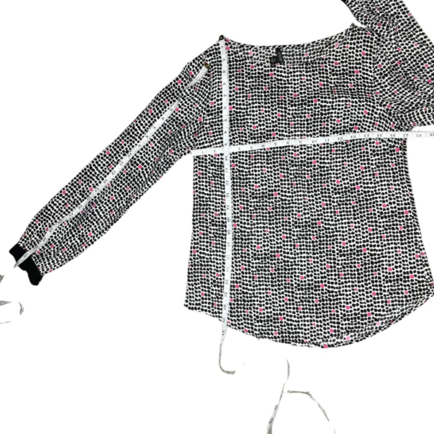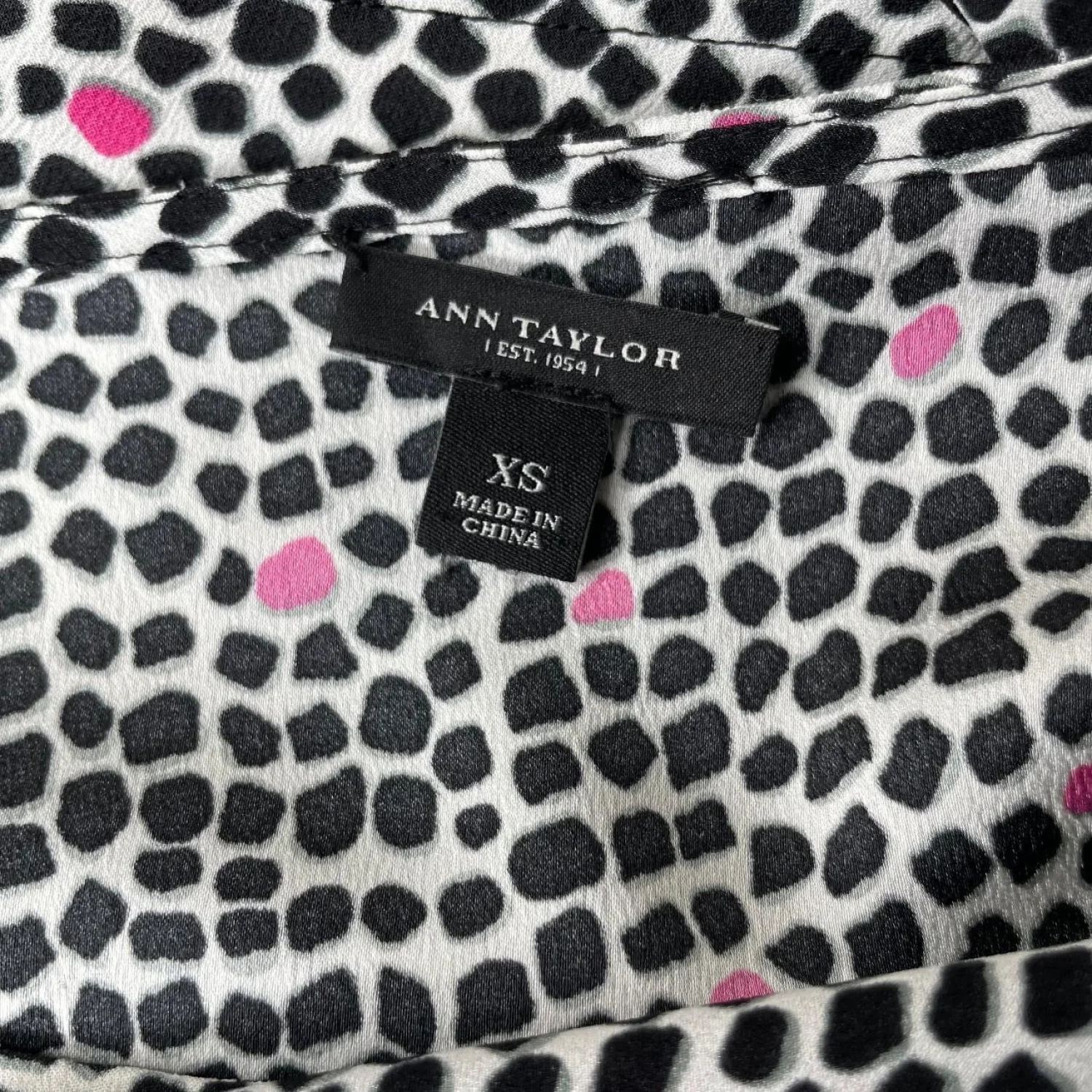 Ann Taylor Mod Office Blouse XS - Black Pink Spotted Print Gold Button Cuff Features: This Ann Taylor blouse hits that sweet spot between 60s Mod and Corporate Indie. It features a crisp, graphic pebble-leopard print in black and white, punctuated by neon pink pops. The silhouette is structured but fluid, with a clean boat neckline and distinct black contrast cuffs secured by heavy gold-tone buttons. The back features a functional gold button placket for a sharp, tailored exit. • Style Profile: mod, corporate indie, 60s style, office siren, business casual, graphic print, pop of color, leopard print, contemporary, career wear • Flaws: No Holes, stains, or tears • Please see the photos for measurements (in inches). PTP: 17' Length:23.5 ' Sleeve Length: 23' • Happy to answer your questions! Super Fast Shipper!