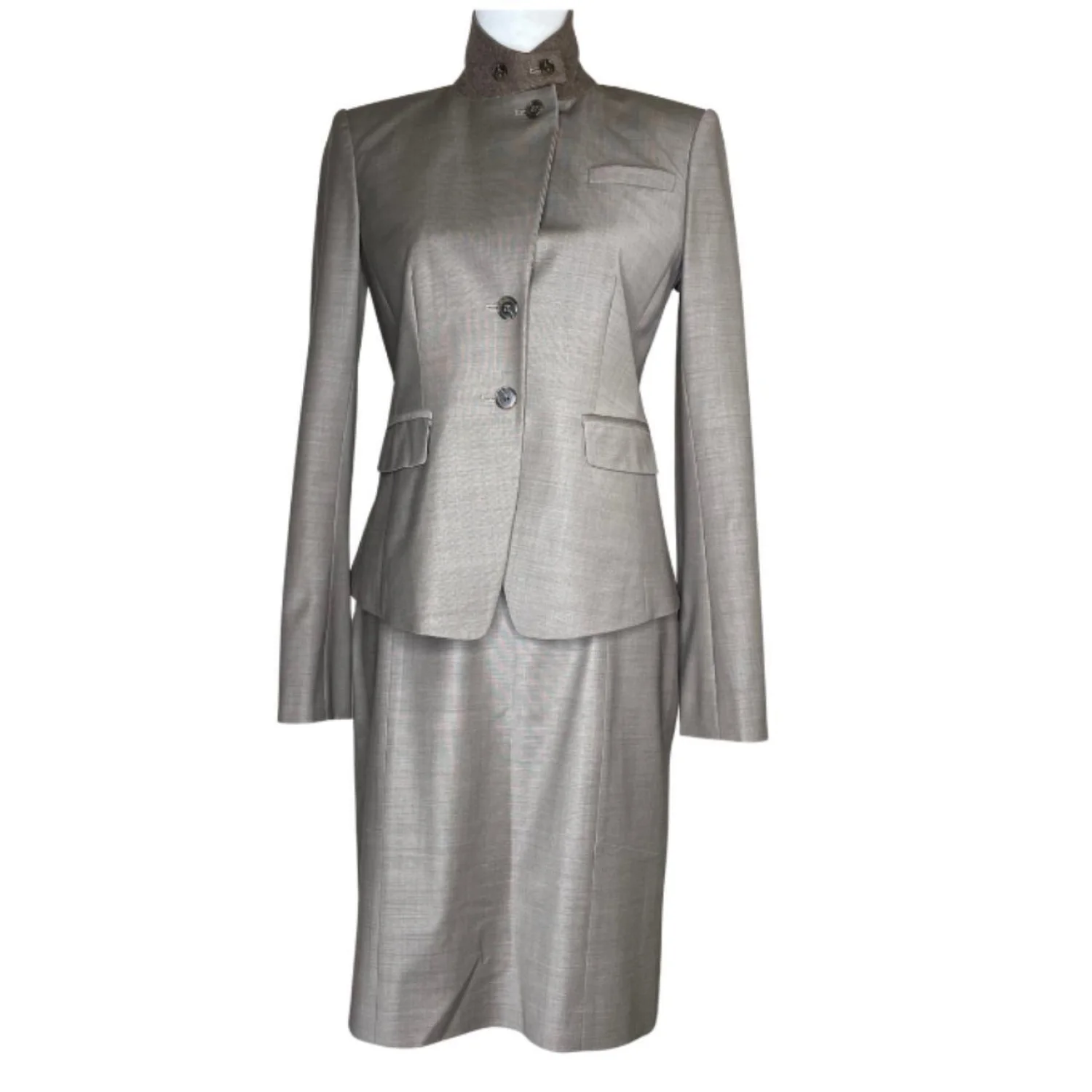 Ann Taylor Women's Brown Virgin Wool Skirt Set Button Neck Collared