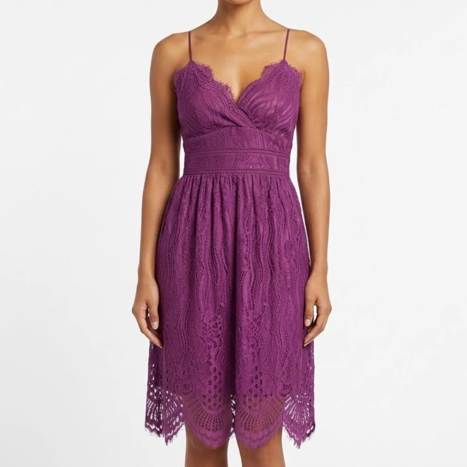 AOOKSMERY Purple Floral Lace Midi Dress NWT Lace Up Back Cocktail Wedding Guest Small Features: Stunning magenta purple floral lace midi dress! This elegant piece features a romantic V-neckline, dainty spaghetti straps, and a sultry lace-up corset-style back for an adjustable fit. The delicate eyelash lace trim and scalloped hem add a high-end touch. Perfect for cocktail parties, weddings, or a fancy date night. • Style Profile: floral lace, cocktail, wedding guest, romantic, coquette, party dress, corset back, midi dress, lace up, magenta, feminine, bridesmaid, date night, boho chic • Flaws: No Holes, stains, or tears • Please see the photos for measurements (in inches). PTP: 13.5' Length: 36' • Happy to answer your questions! Super Fast Shipper!