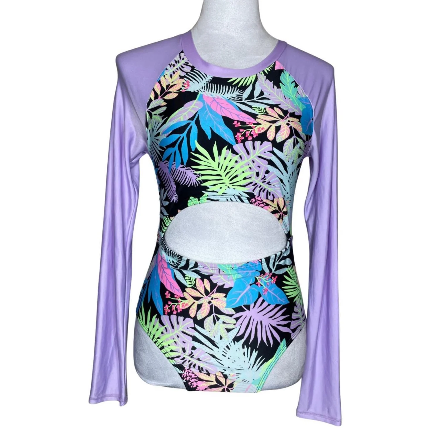 Art Class Tropical Neon Cutout Long Sleeve Swimsuit XL 14/16