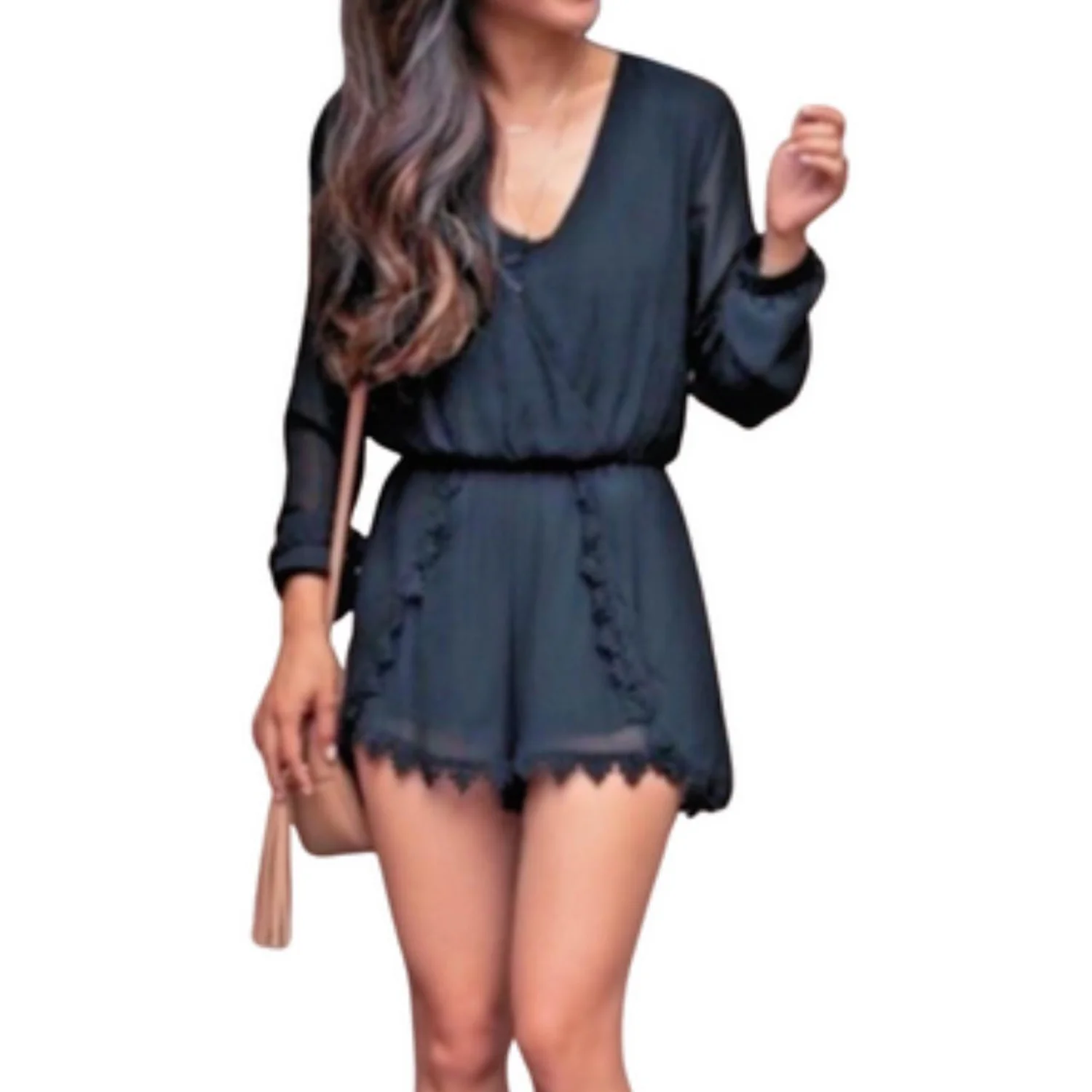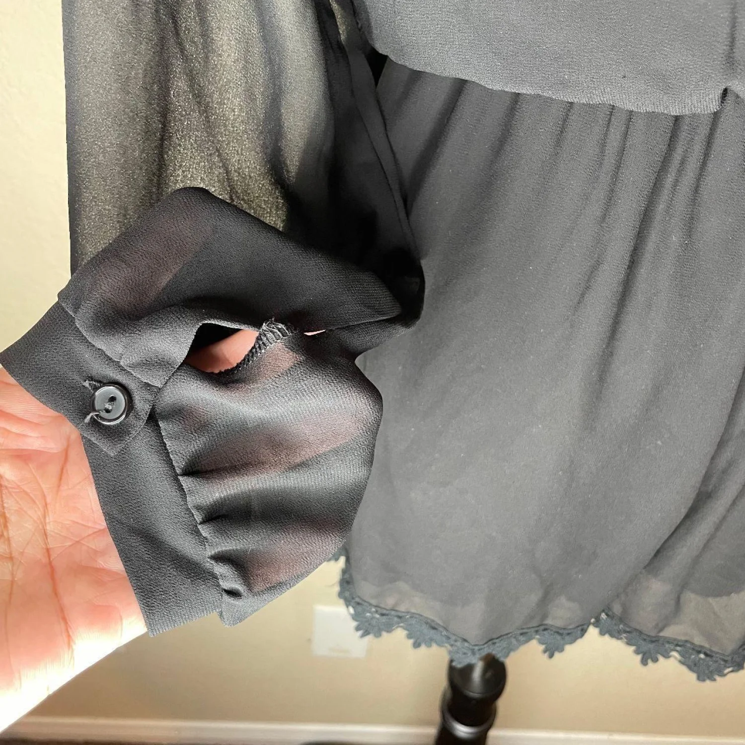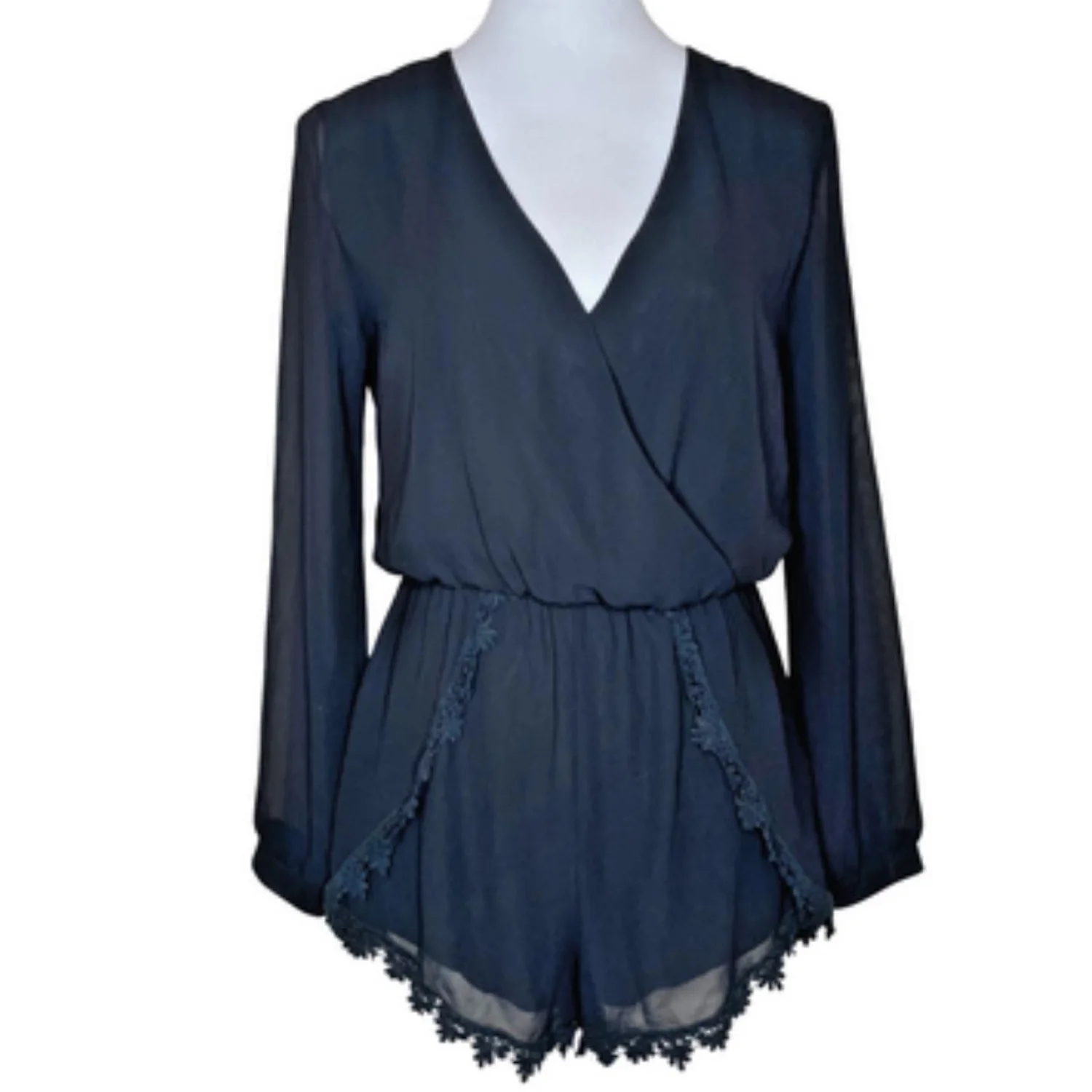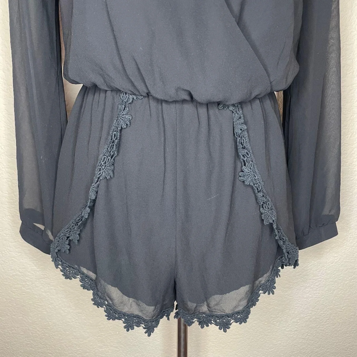 ASTR Black Sheer Long Sleeve Floral Crochet Pleated Shorts Romper Boho
