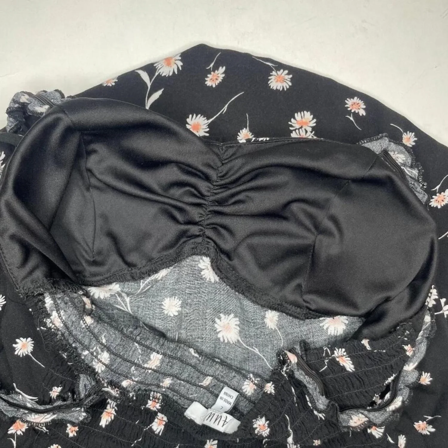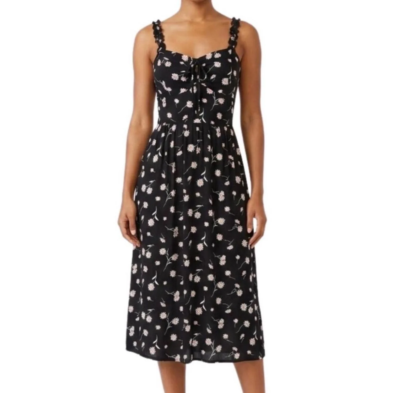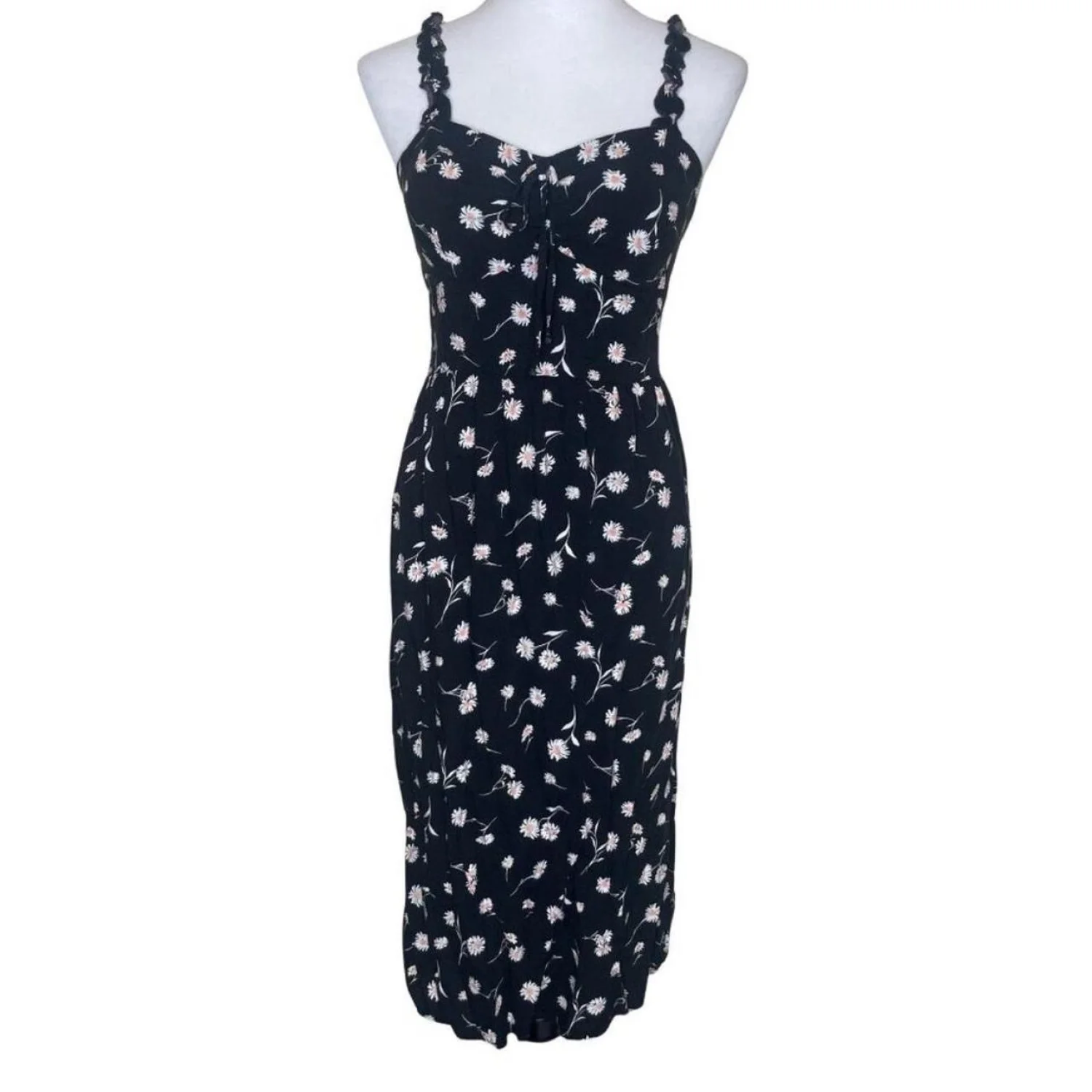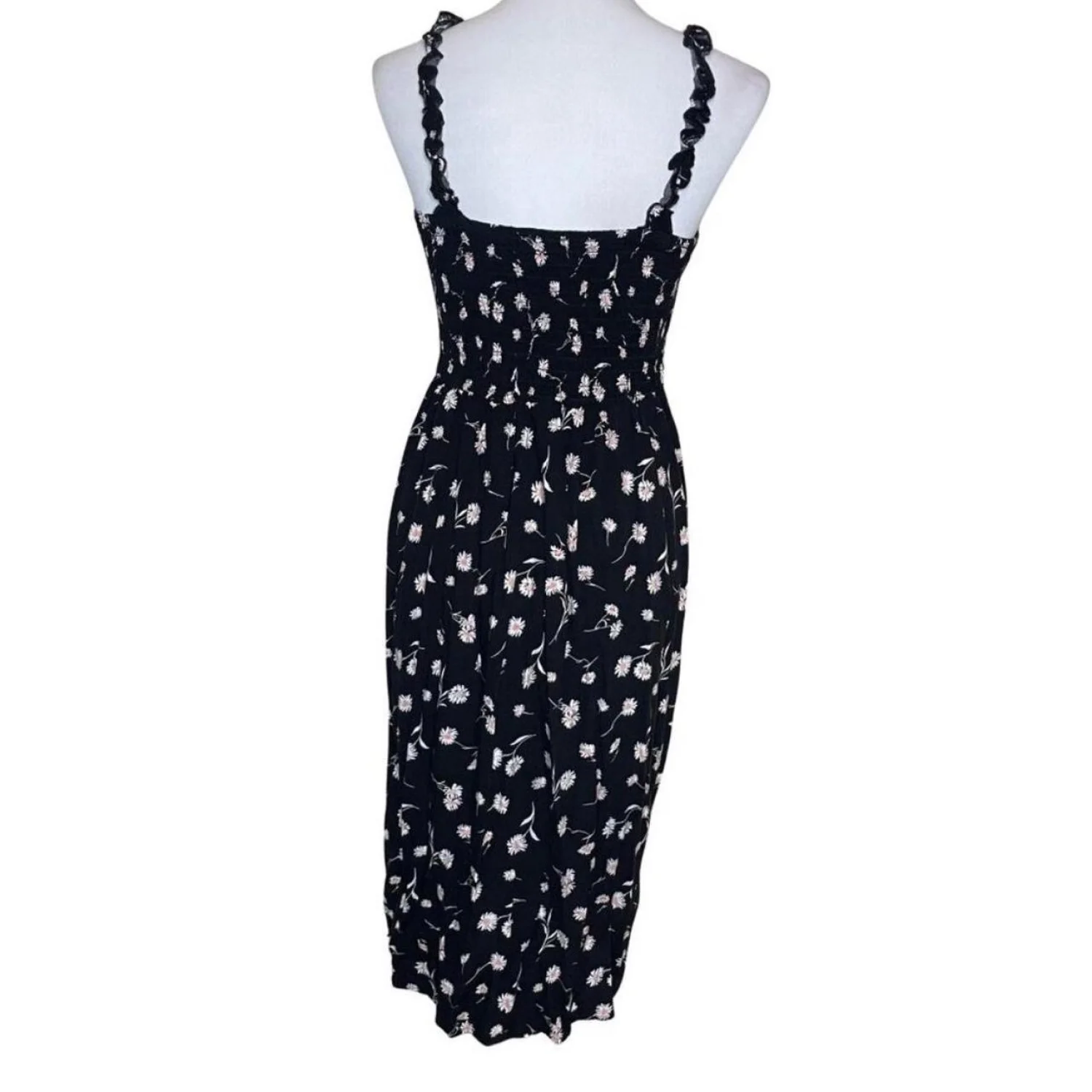 AUW Black Daisy Floral Smocked Midi Dress Large Rayon Cottagecore Boho Summer Features: This beautiful AUW midi dress features a classic black and white daisy print with delicate pink accents. Designed with a flattering smocked back for comfort and stretch, it includes a tie-front bodice and feminine ruffled straps. This piece is perfect for summer garden parties, beach vacations, or a casual cottagecore-inspired look. • Style Profile: Cottagecore, Boho, Floral, Summer, Daisy, 90s Style, Smocked, Breathable, Romantic, Sundress, Festival, Casual • Flaws: No Holes, stains, or tears (Excellent pre-owned condition) • All measurements are approximate PTP: 14.5" Length: 41" Happy to answer your questions! Super Fast Shipper!