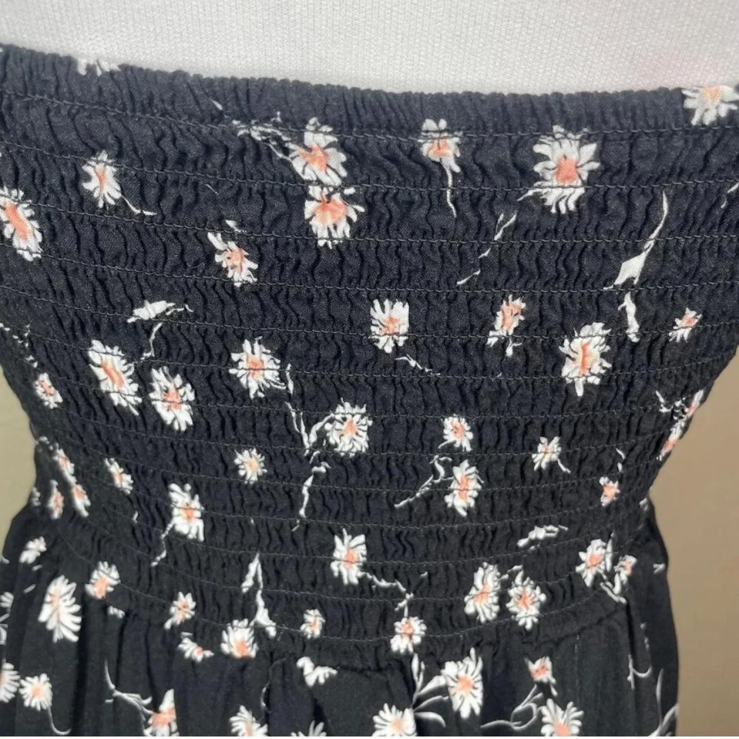 AUW Black Daisy Floral Smocked Midi Dress Large Rayon Cottagecore Boho Summer