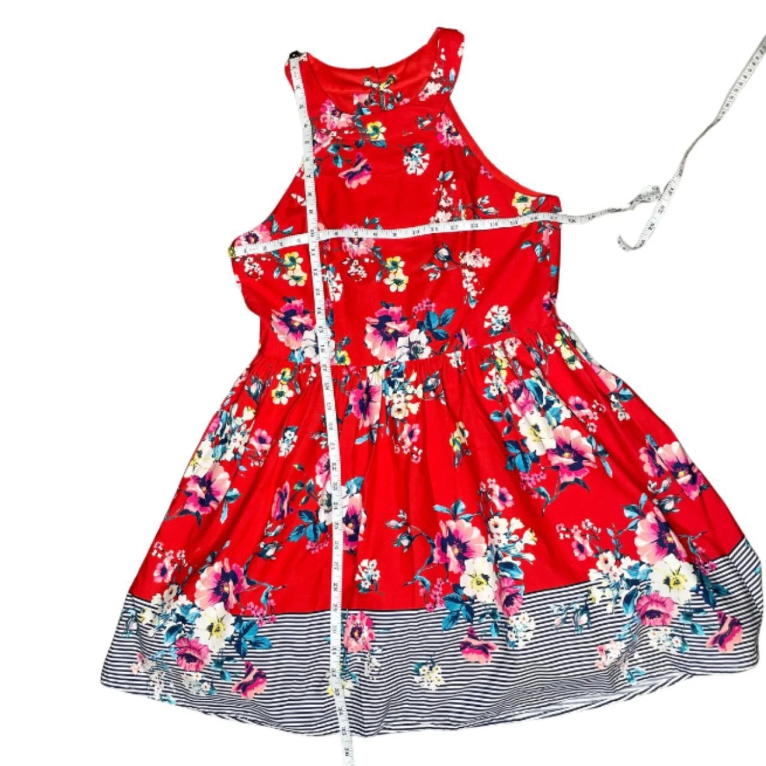 AUW Red Floral Halter Fit & Flare Dress Lace Up Back Striped Hem Size Large Features: This AUW fit and flare serves major modern pinup energy with a sharp halter neckline and a heavy floral print contrasted by a bold striped hem. The back is the real player here—metal eyelets and a corded lace-up detail let you cinch the waist for that classic hourglass silhouette. It’s fully lined with a mesh crinkle tier at the hem to keep the skirt structured and flared, not flat. • Style Profile: Americana, Retro, Rockabilly, Pinup, Coquette, Bloomcore, Summer Garden Party, Fit and Flare, Halter Neck, Lace Up Back, Floral Print, Nautical Stripe, Whimsigoth, Retro-style • Flaws: No Holes, stains, or tears • Please see photos for measurements (in inches). PTP: 17.5' Length: 35' • Happy to answer your questions! Super Fast Shipper!
