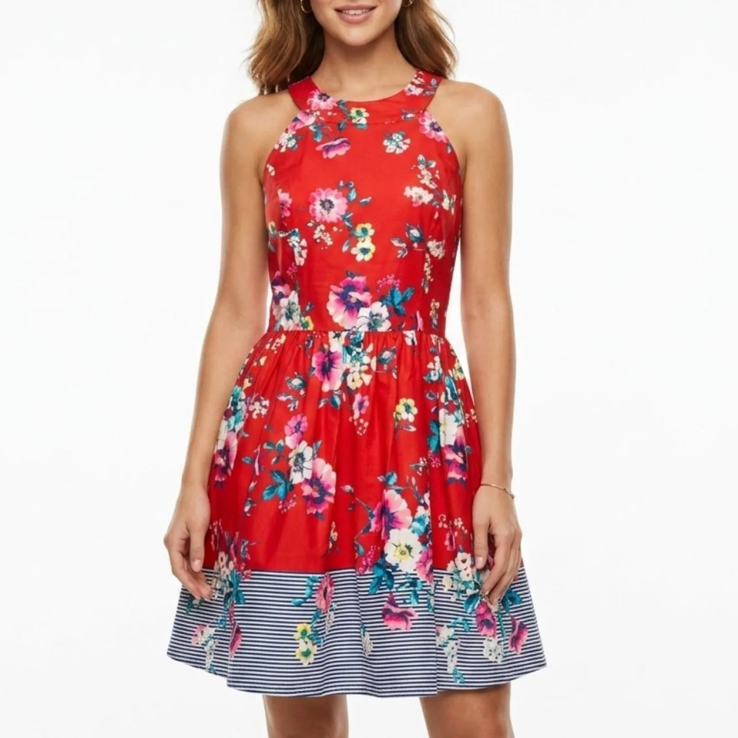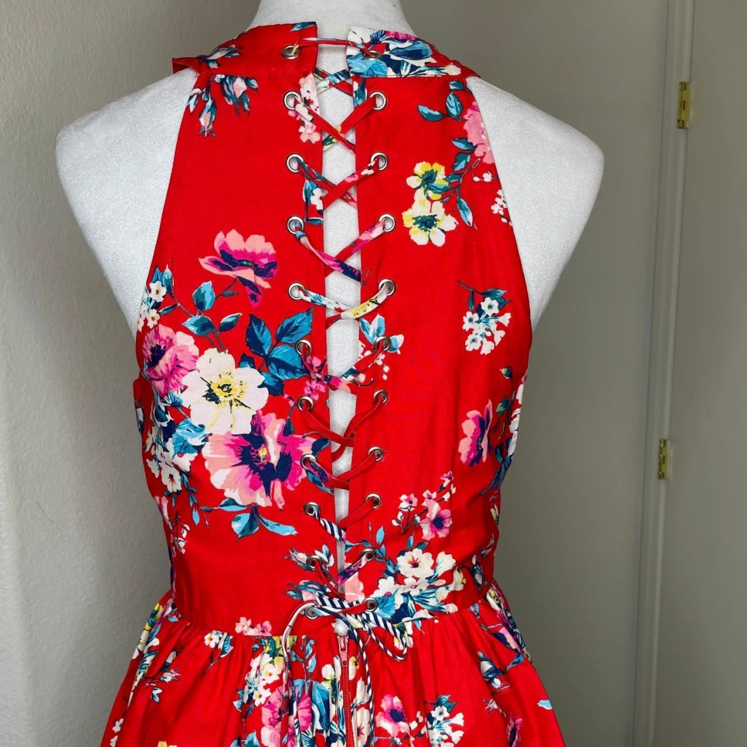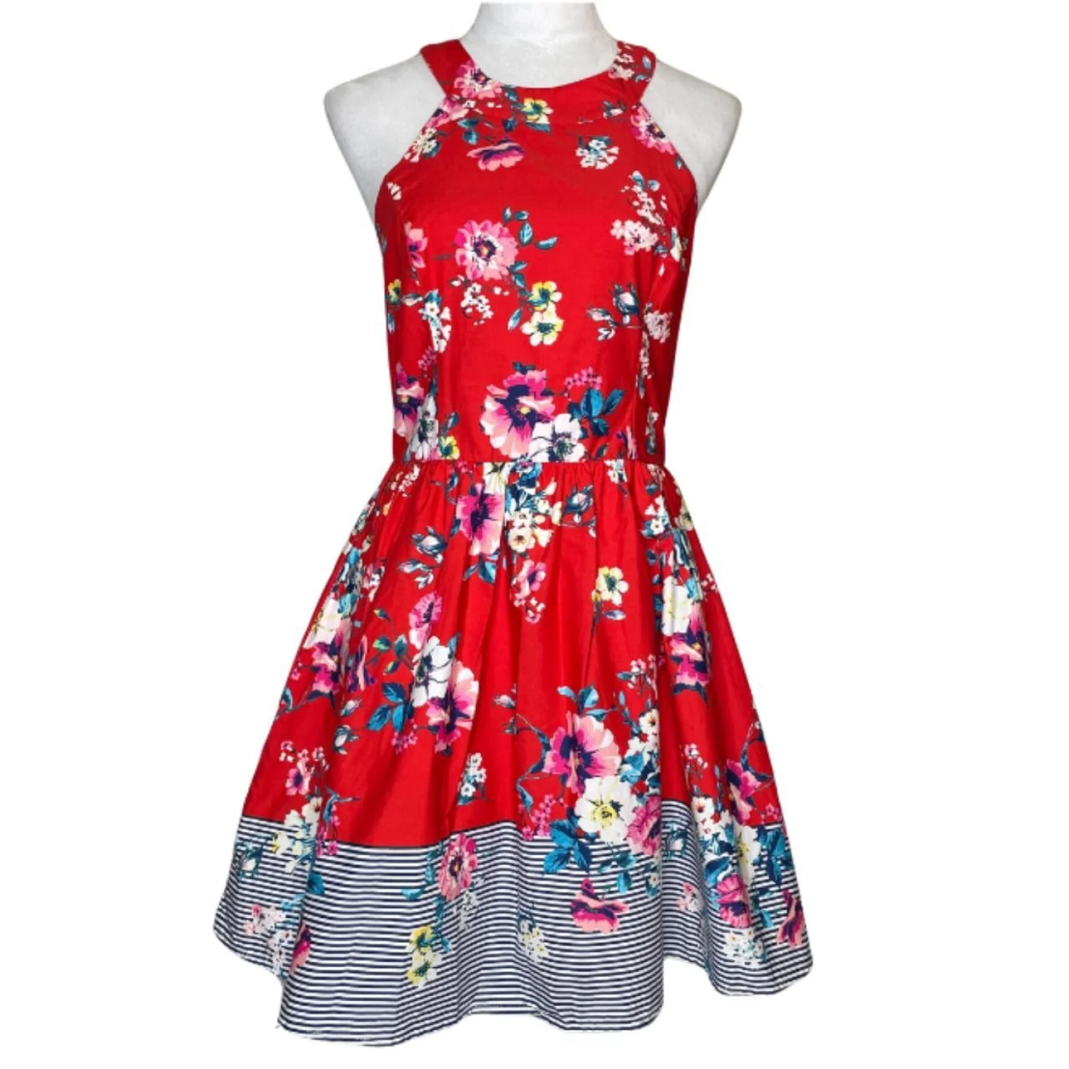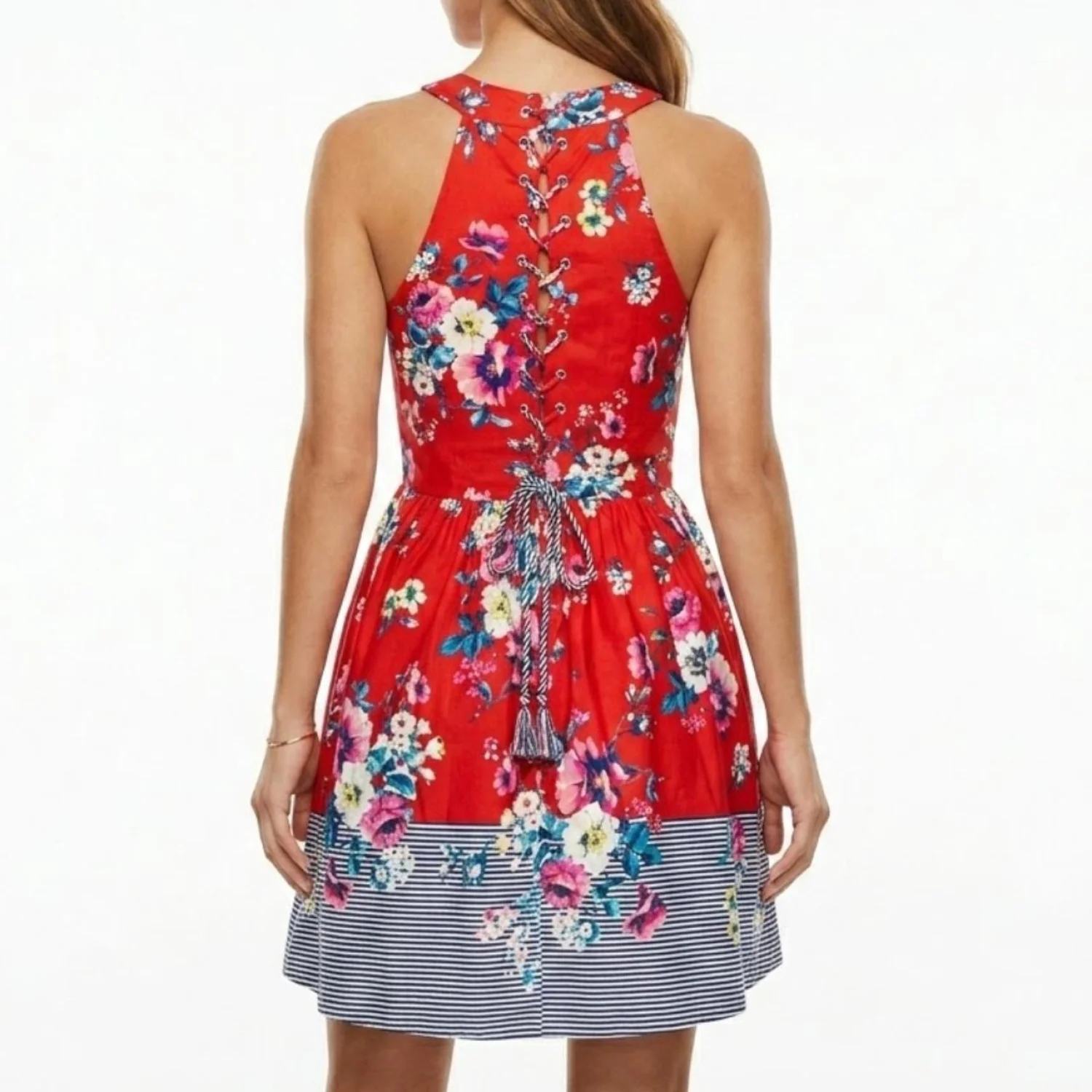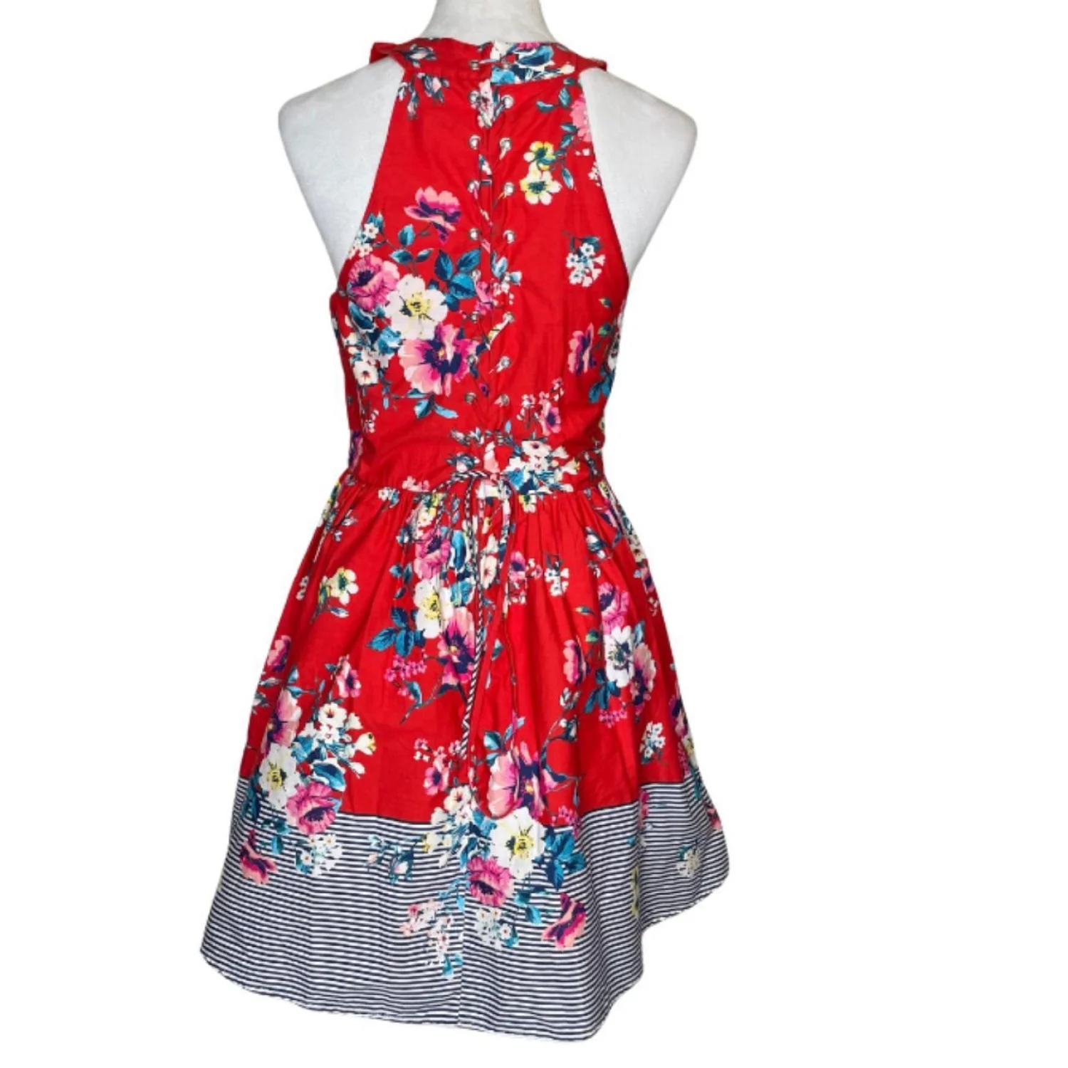 AUW Red Floral Halter Fit & Flare Dress Lace Up Back Striped Hem Size Large