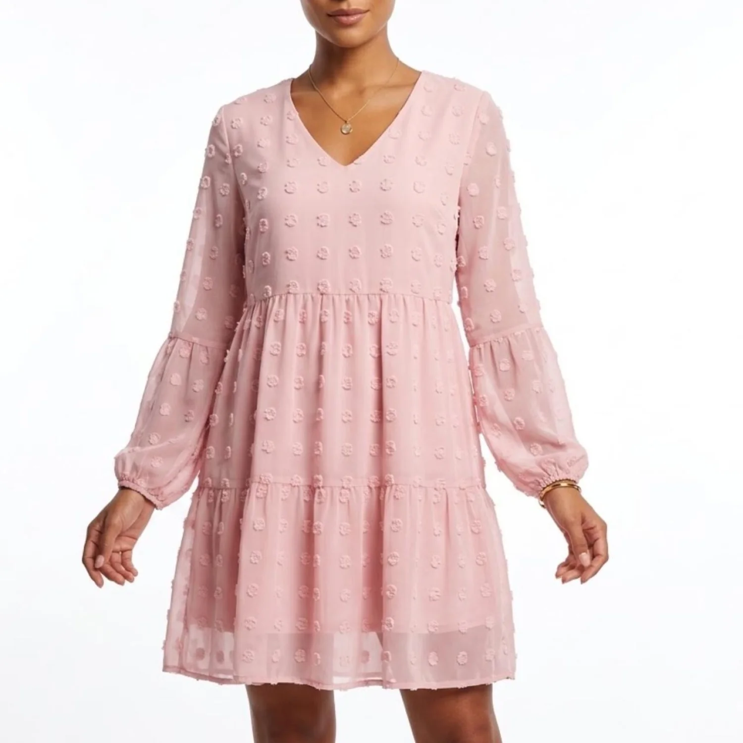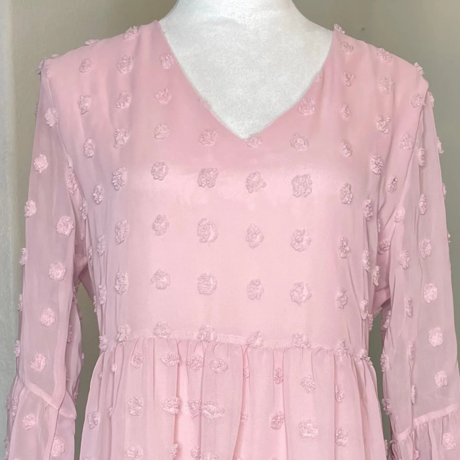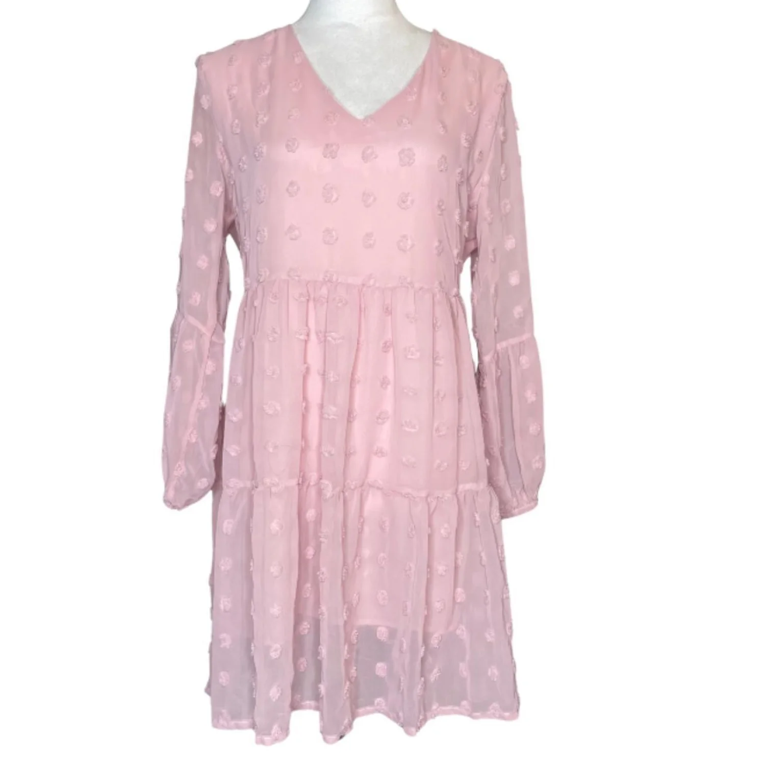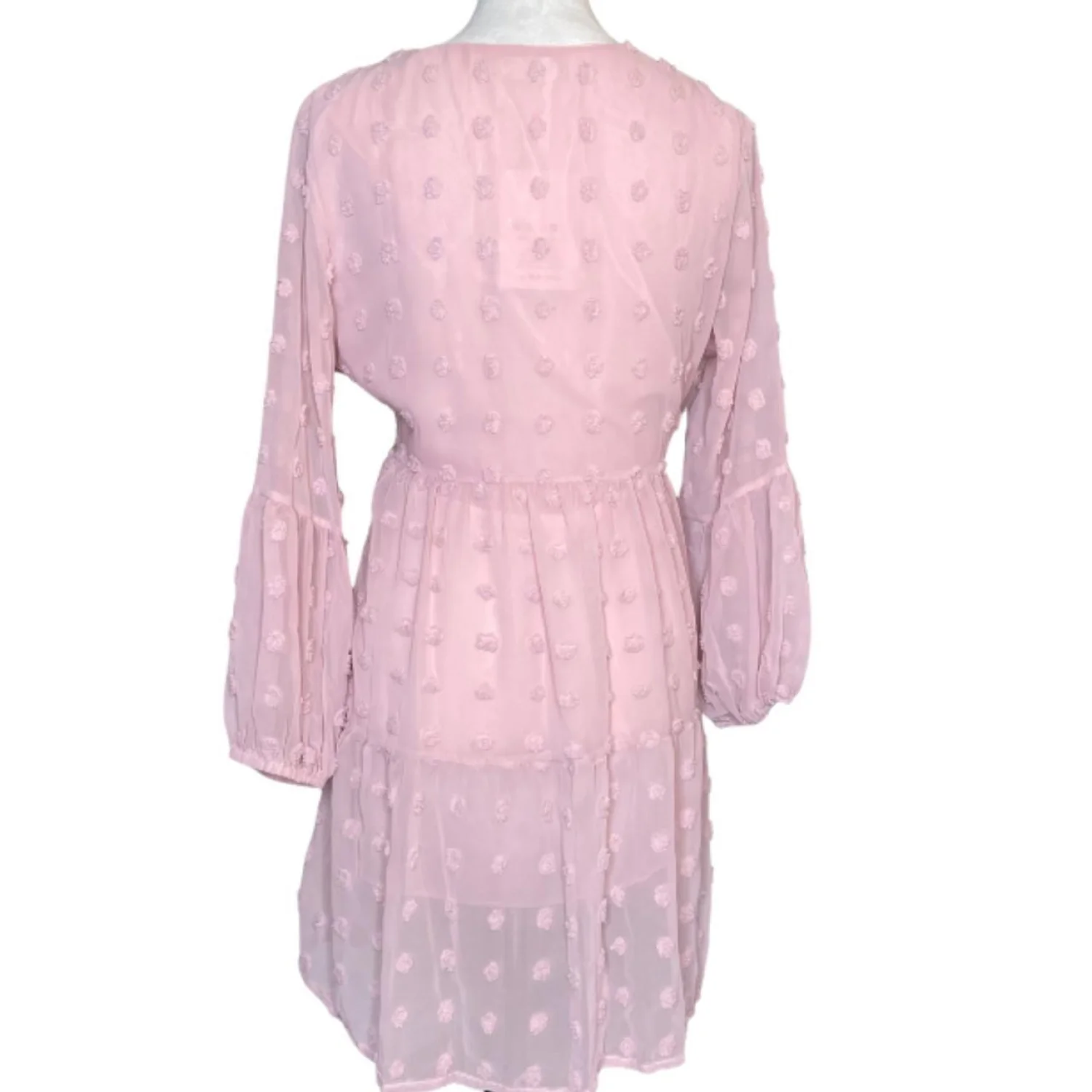 BELONGSCI Pink Coquette Swiss Dot Tiered Mini Dress Bell Sleeve M